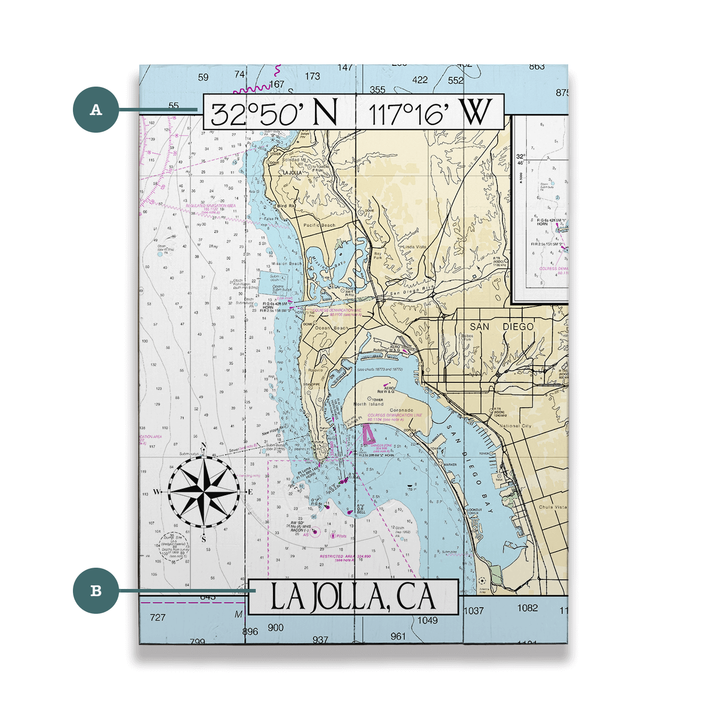 This artwork features a detailed chart of La Jolla, California, showcasing its dramatic coastline, Pacific waters, and surrounding nautical routes. The design includes precise coordinates (32°50' N, 117°16' W) and a decorative compass rose, adding classic maritime character to the piece. Renowned for its rugged cliffs, scenic coves, and world-famous marine life, La Jolla is a destination loved by surfers, divers, and ocean enthusiasts alike. Both the name and coordinates can be customized for a personalized touch, making this artwork a unique way to celebrate the coastal beauty and spirit of La Jolla in any home, office, or beach-inspired space.