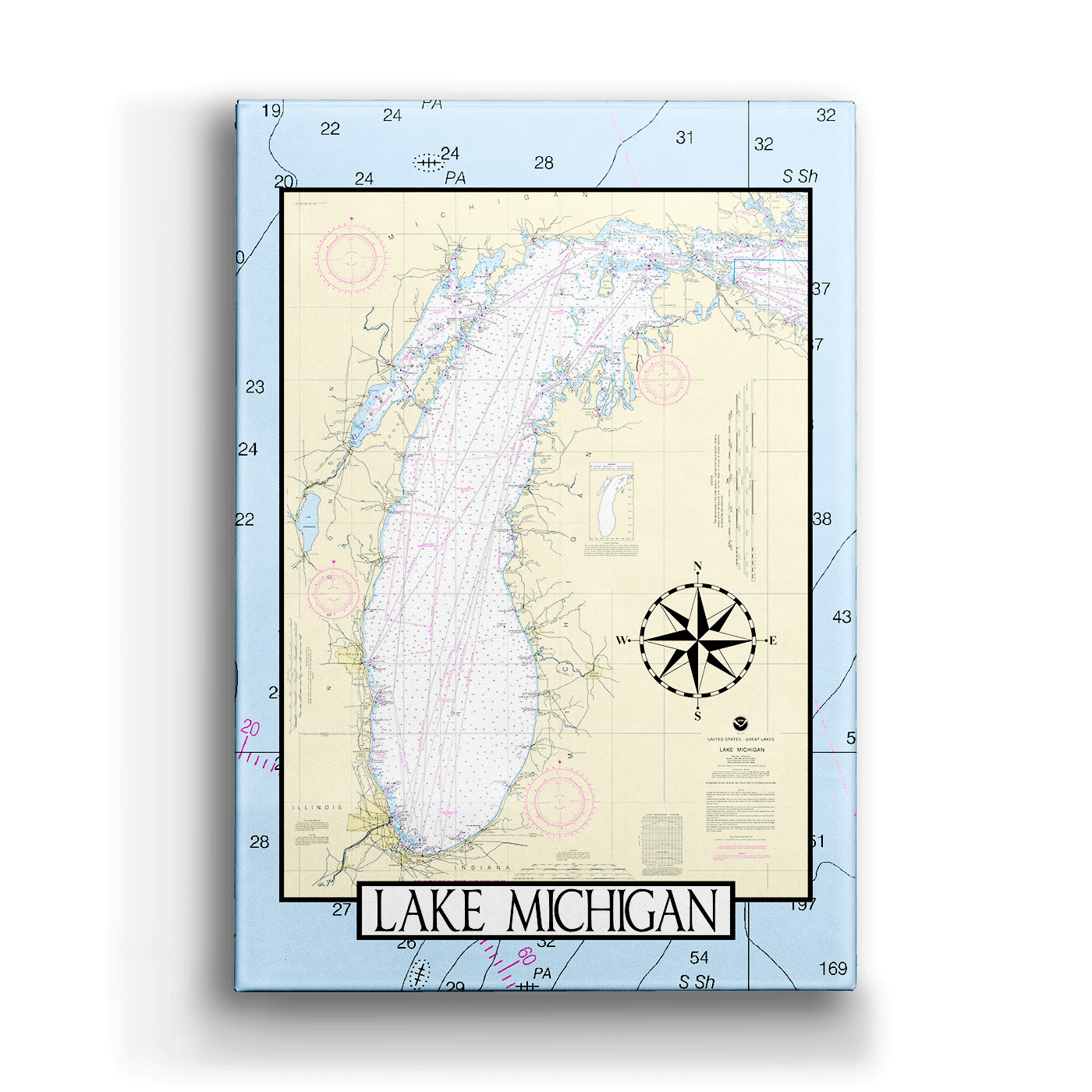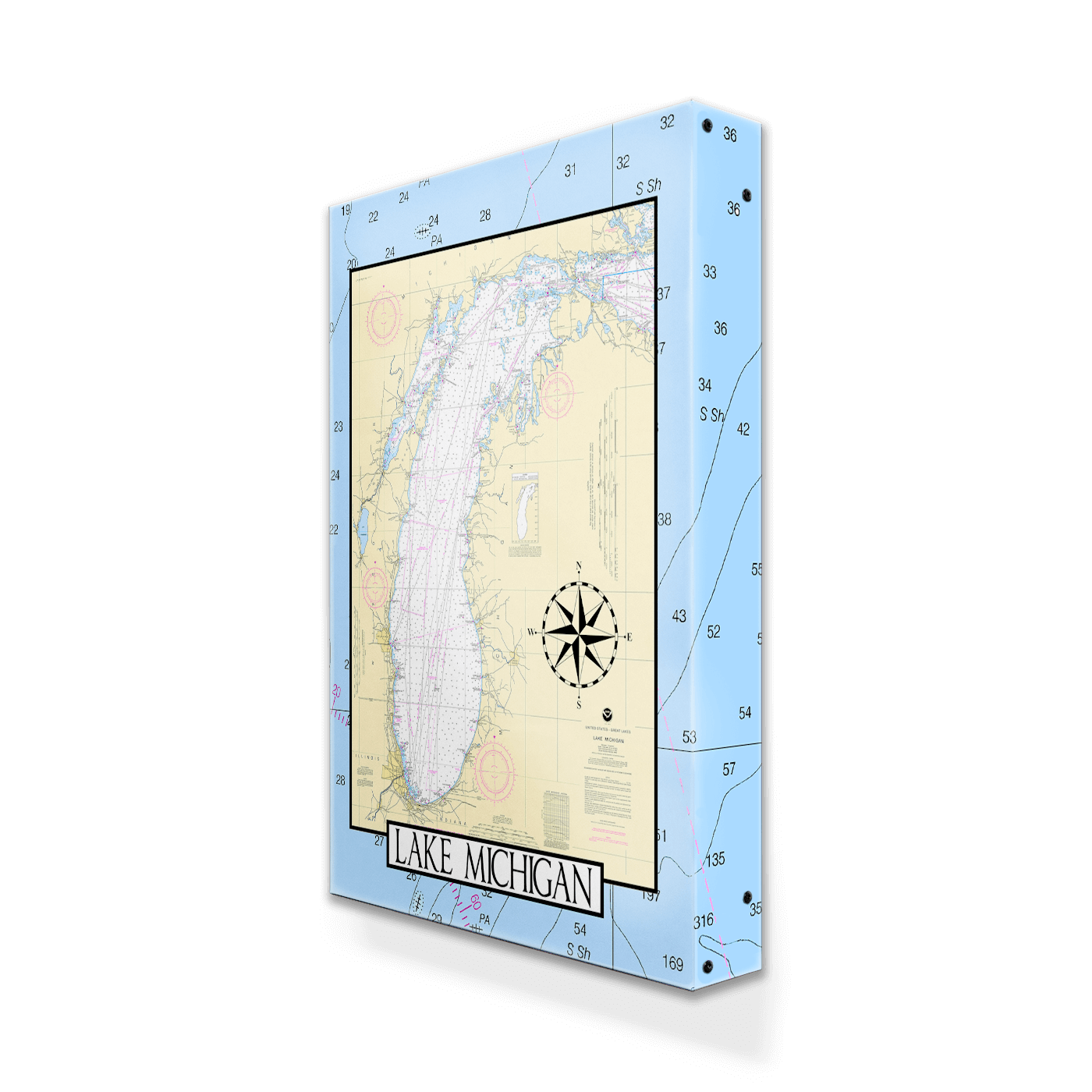 Featuring the full expanse of Lake Michigan in stunning nautical detail, this chart artwork captures the grandeur of the only Great Lake located entirely within the United States. Depth soundings, coastal landmarks, and historic navigation markings bring the lake's rich maritime character to life — from the dune-lined shores of the east to the bustling ports of Chicago and Milwaukee. Home to thousands of shipwrecks and nearly four dozen lighthouses, Lake Michigan has long been one of America's most storied stretches of freshwater. Perfect for boaters, lakeside locals, or anyone with a love of the Great Lakes, this piece is a timeless tribute to an inland sea like no other.