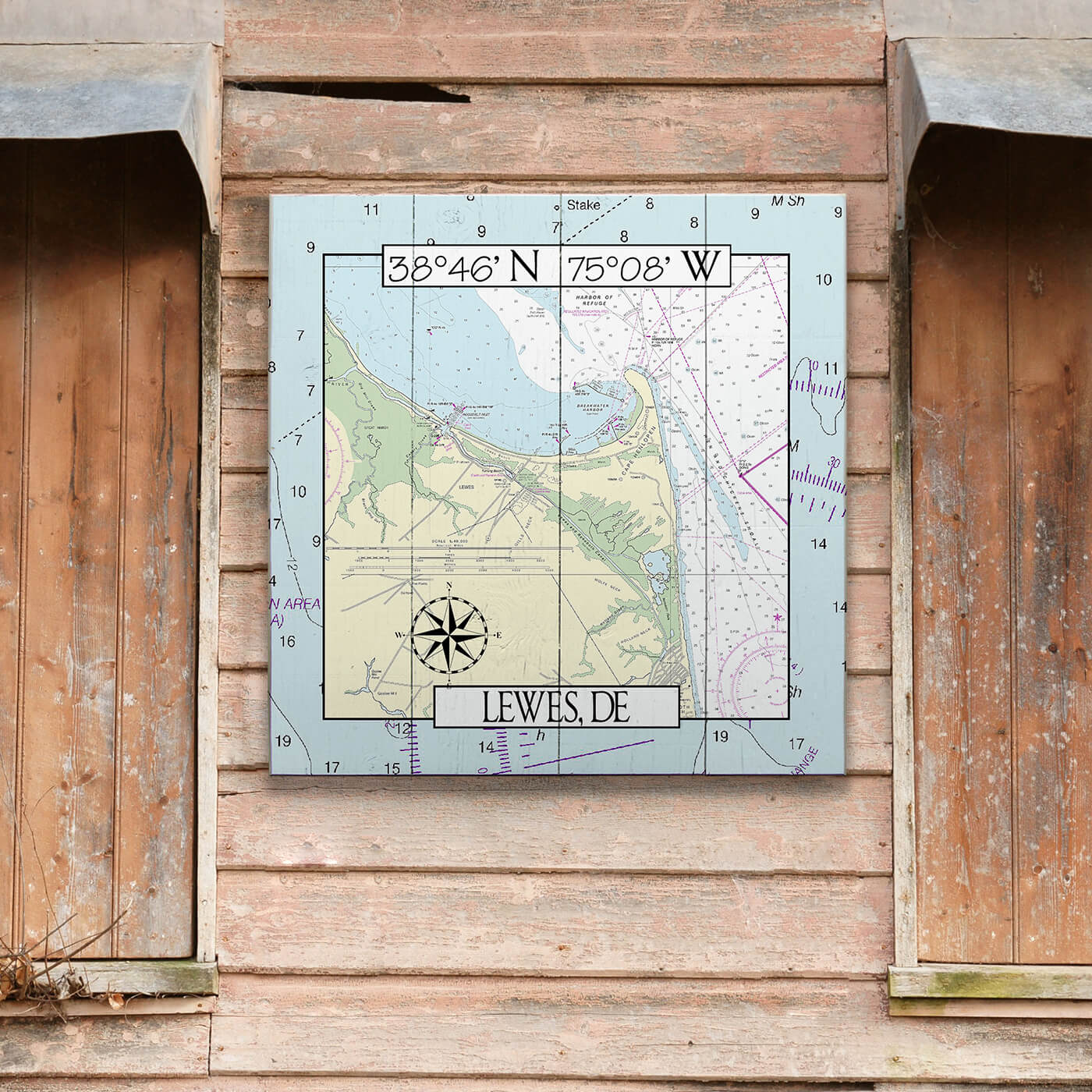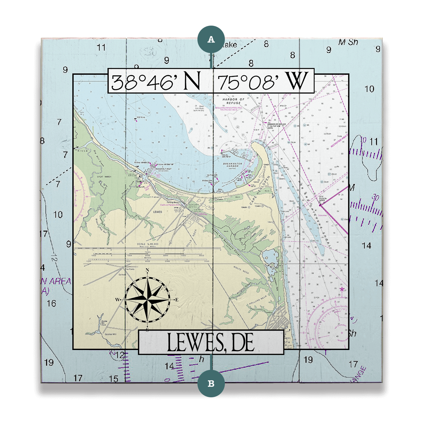 This nautical chart artwork of Lewes, Delaware, features the harbor, breakwaters, and navigational routes leading into Delaware Bay. Known as the first town in the first state, Lewes is steeped in colonial history and maritime tradition. The surrounding region includes scenic beaches, historic lighthouses, and rich ecosystems supported by tidal creeks and marshlands. With customizable coordinates and name, this piece offers a timeless way to celebrate a connection to this charming coastal town.