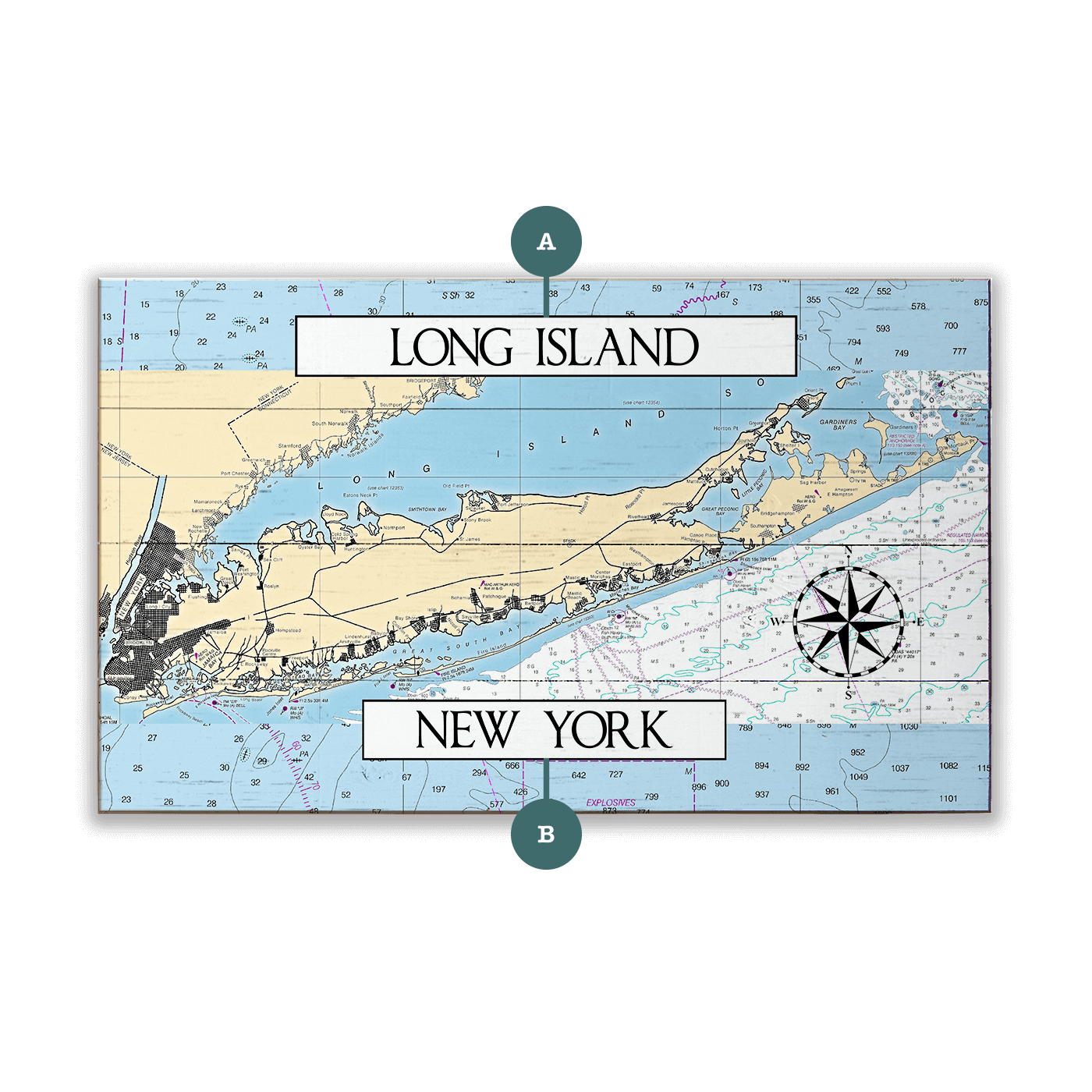 This nautical chart artwork of Long Island, New York, offers a wide view of the island’s southern coastline, showcasing key navigation routes, bays, and offshore waters. From the bustling shores near New York City to the quiet inlets of the East End, Long Island blends maritime activity with scenic beauty. It's a region known for fishing, sailing, and beach escapes—from Fire Island to Montauk. With detailed coastal markings and customizable text, this piece makes a striking tribute to a diverse and iconic stretch of the Atlantic seaboard.