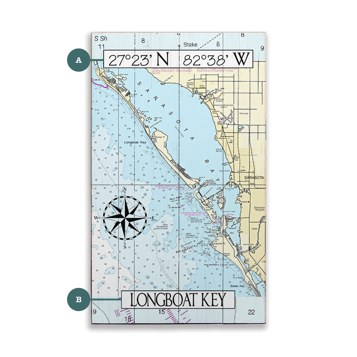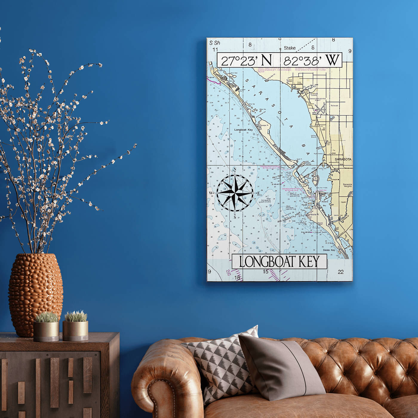 This artwork features a detailed chart of Longboat Key, Florida, beautifully capturing the coastal area with the coordinates (27°23' N, 82°38' W) and a decorative compass rose. The name and coordinates can be customized, allowing you to create a personalized piece that reflects your connection to this picturesque island. Perfect for adding a touch of coastal elegance to any decor, this artwork showcases the natural beauty and charm of Longboat Key.