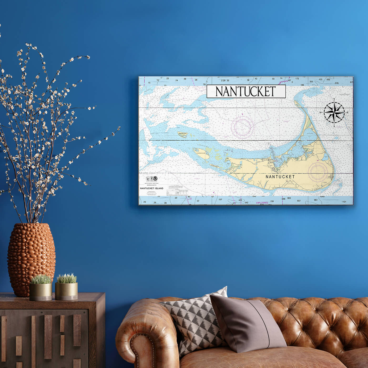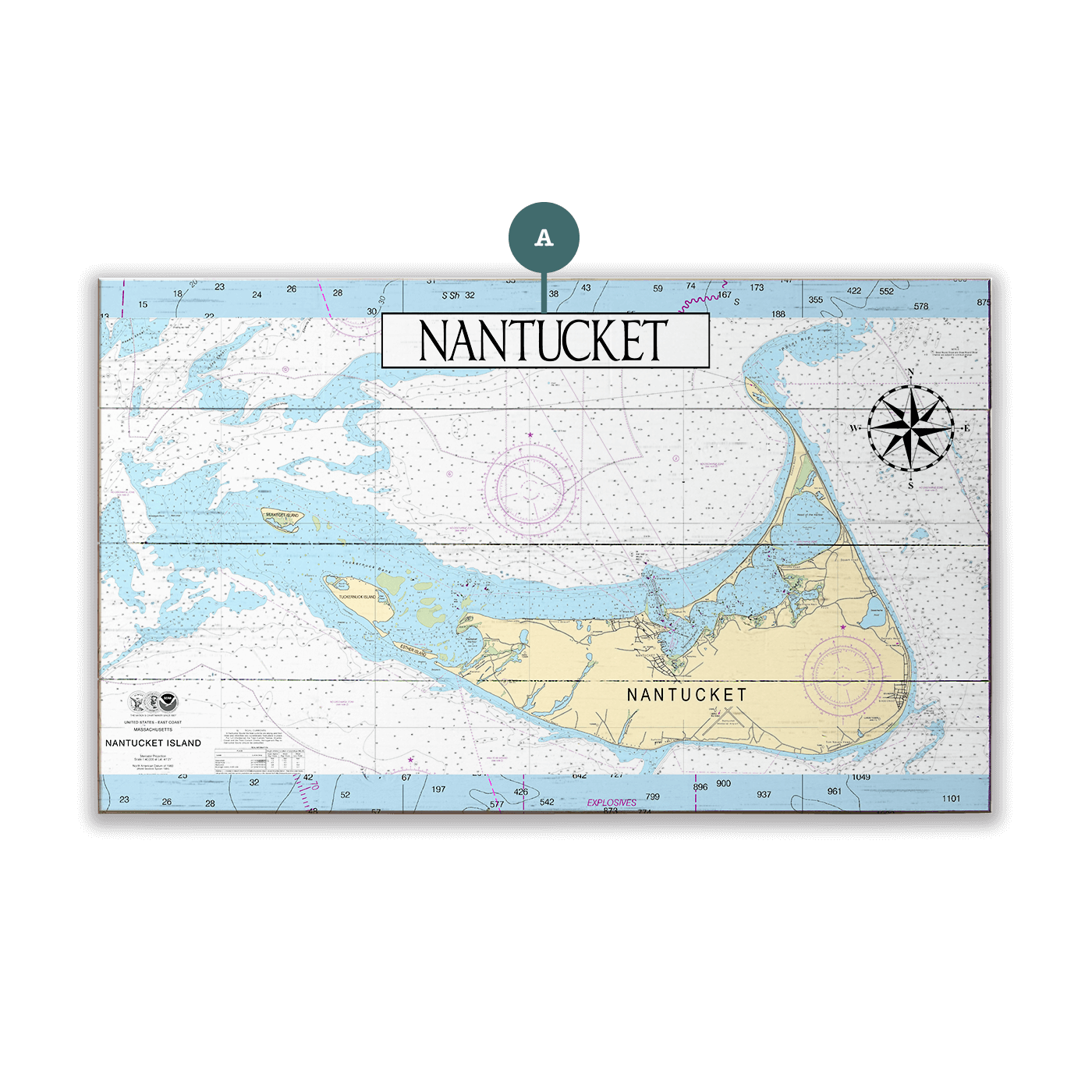 This artwork features a detailed chart of Nantucket, Massachusetts, capturing its distinctive crescent-shaped coastline and surrounding waters, including Nantucket Sound and the Atlantic Ocean. Once the whaling capital of the world, Nantucket is now a beloved destination known for its cobblestone streets, historic lighthouses, and windswept beaches. From the charm of Siasconset to the bustling harbor of Nantucket Town, this island embodies classic New England coastal beauty. This artwork is a timeless way to celebrate Nantucket’s heritage and seaside allure, the customizable name option making it perfect for nautical-themed decor in any space.