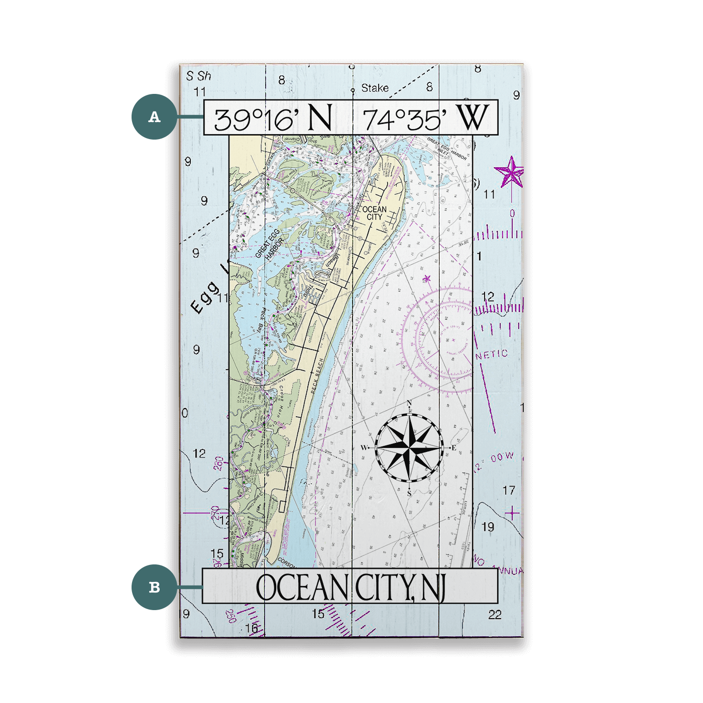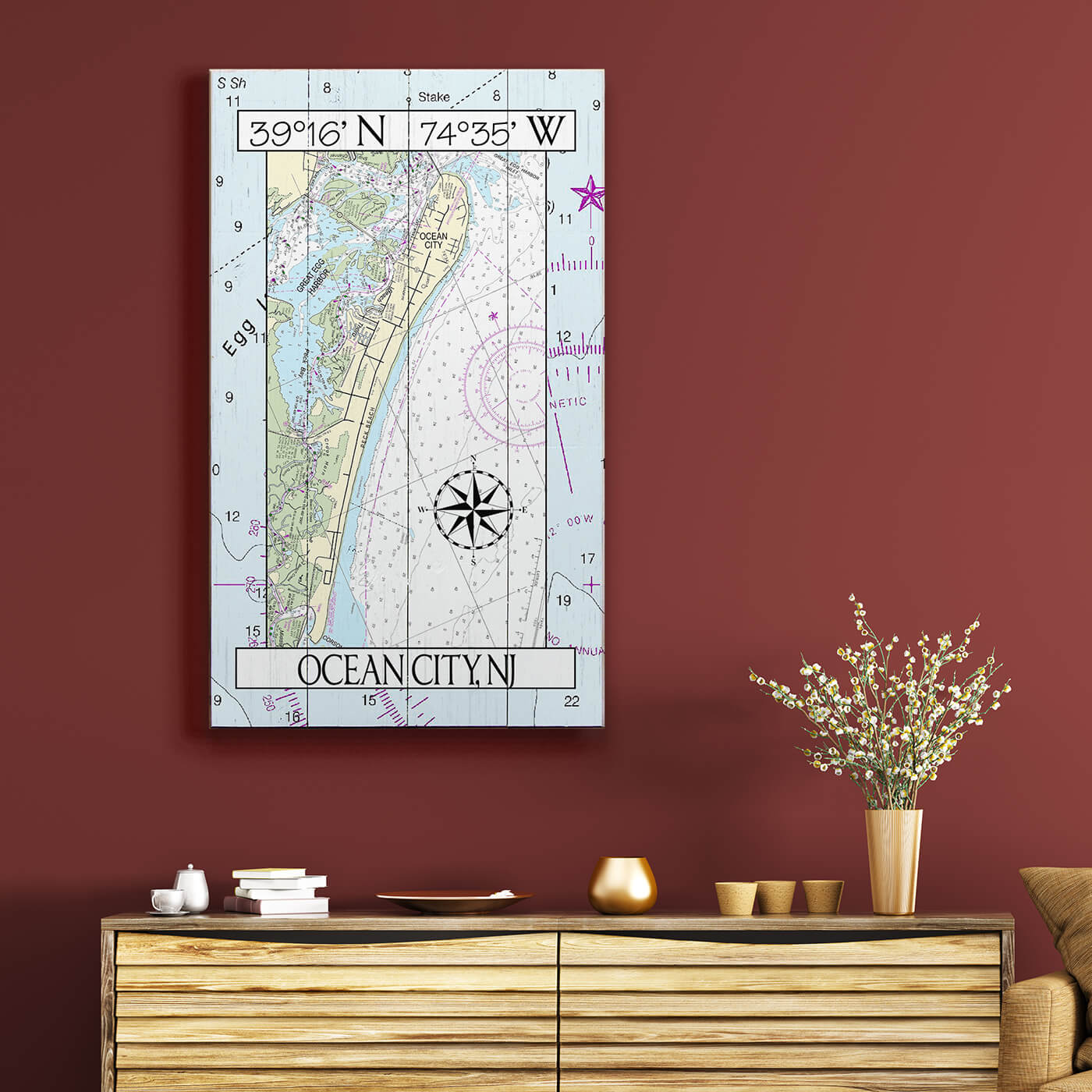 This nautical chart artwork of Ocean City, New Jersey, highlights the barrier island’s shoreline, surrounding waters, and detailed navigational features. Known for its iconic boardwalk, family-friendly beaches, and classic seaside charm, Ocean City offers a perfect mix of recreation and relaxation. The nearby bays and channels support boating, fishing, and coastal exploration. With customizable coordinates and text, this piece makes a meaningful keepsake for anyone connected to this beloved Jersey Shore destination.