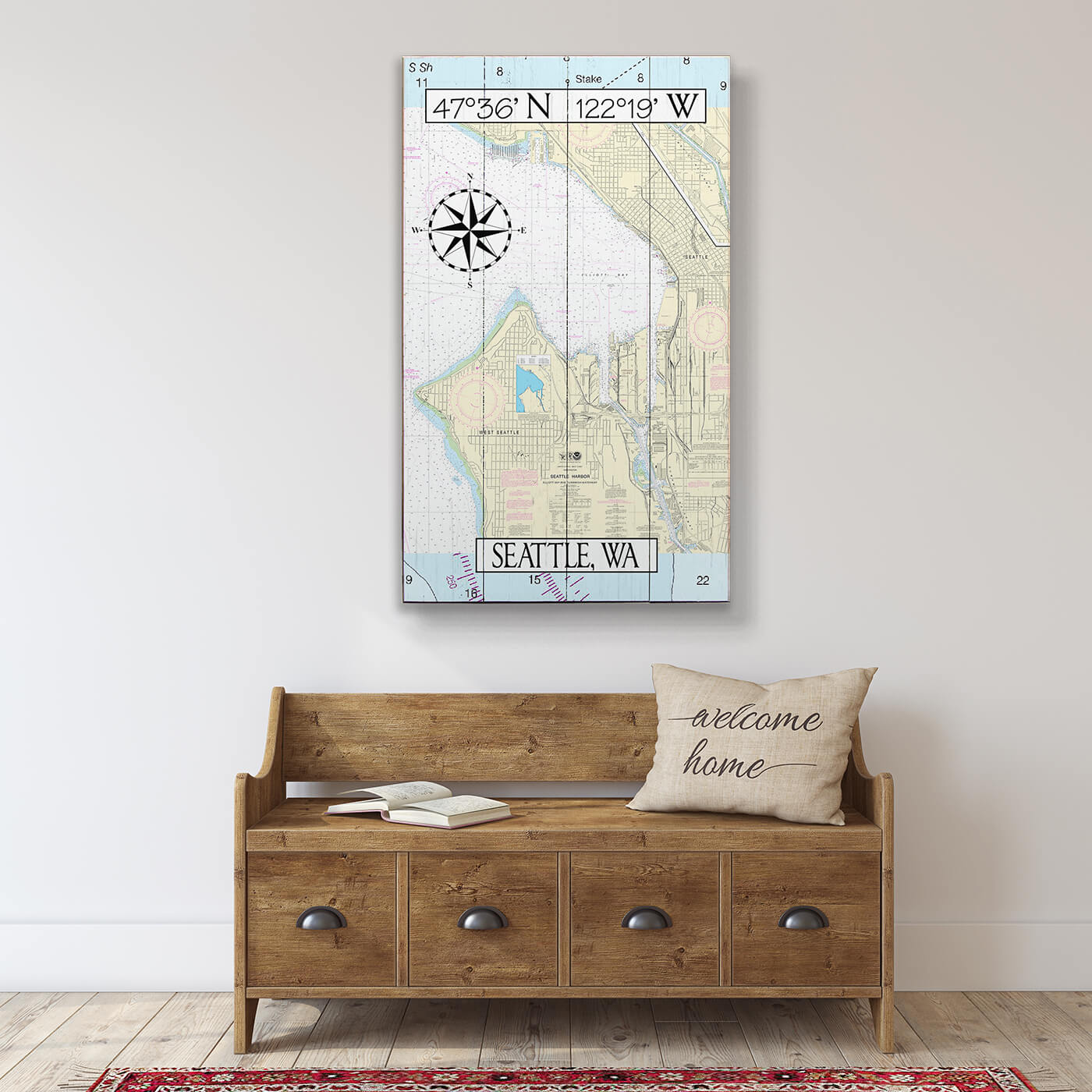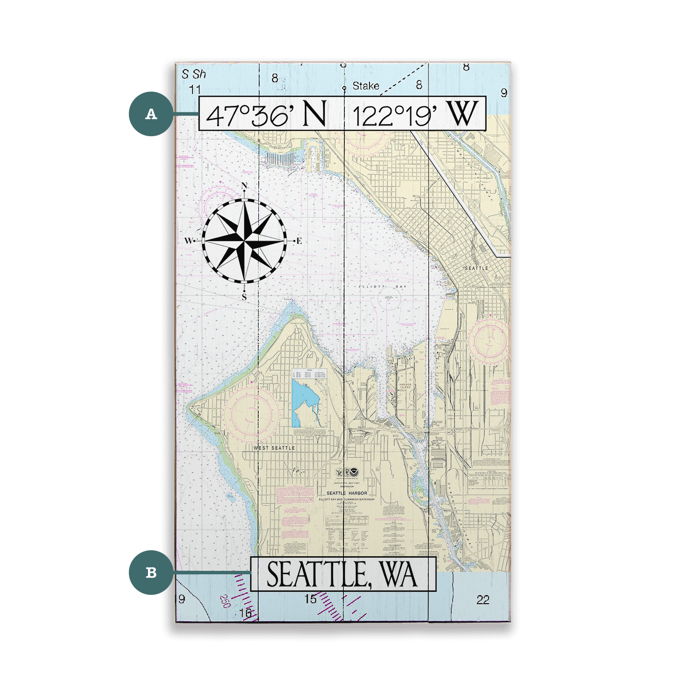 This nautical chart artwork of Seattle, Washington, features the vibrant shoreline of Elliott Bay and the intricate layout of the city's waterfront. It reflects Seattle's strong maritime roots from its early days as a logging port to its current role as a global shipping hub. The chart includes landmarks like West Seattle and the Port of Seattle, all framed by the Puget Sound's coastal waters. With both the name and coordinates able to be customized, it's a striking tribute to a city where nautical tradition meets modern innovation, ideal for anyone who loves the Pacific Northwest.