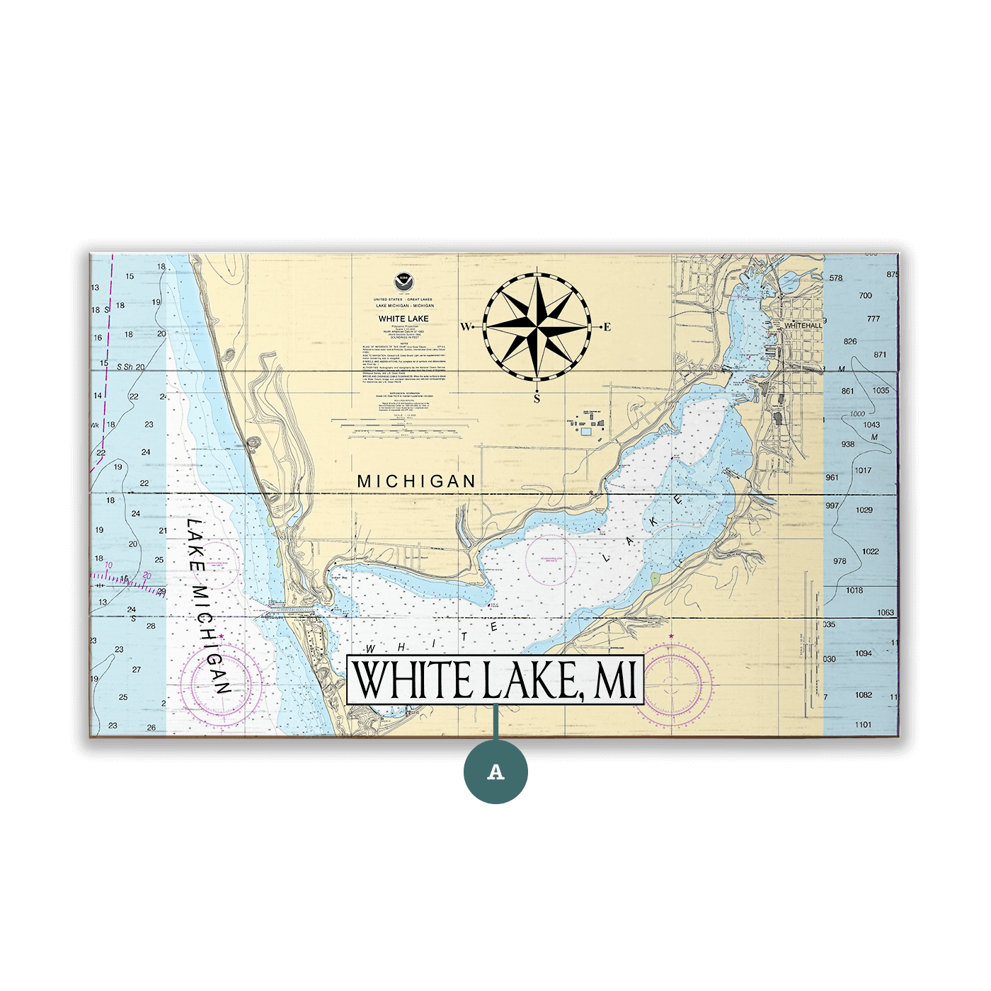 This artwork features a detailed chart of White Lake, Michigan, showcasing its connection to Lake Michigan and the surrounding coastal landscape. Known for its serene waters, vibrant boating community, and scenic shoreline, White Lake is a popular destination for outdoor enthusiasts and lake lovers alike. The design includes a decorative compass rose and intricate nautical details, making it a perfect tribute to this picturesque region. Both the name and coordinates can be customized for a personalized touch, making this artwork a unique addition to any home, office, or lake-themed space.