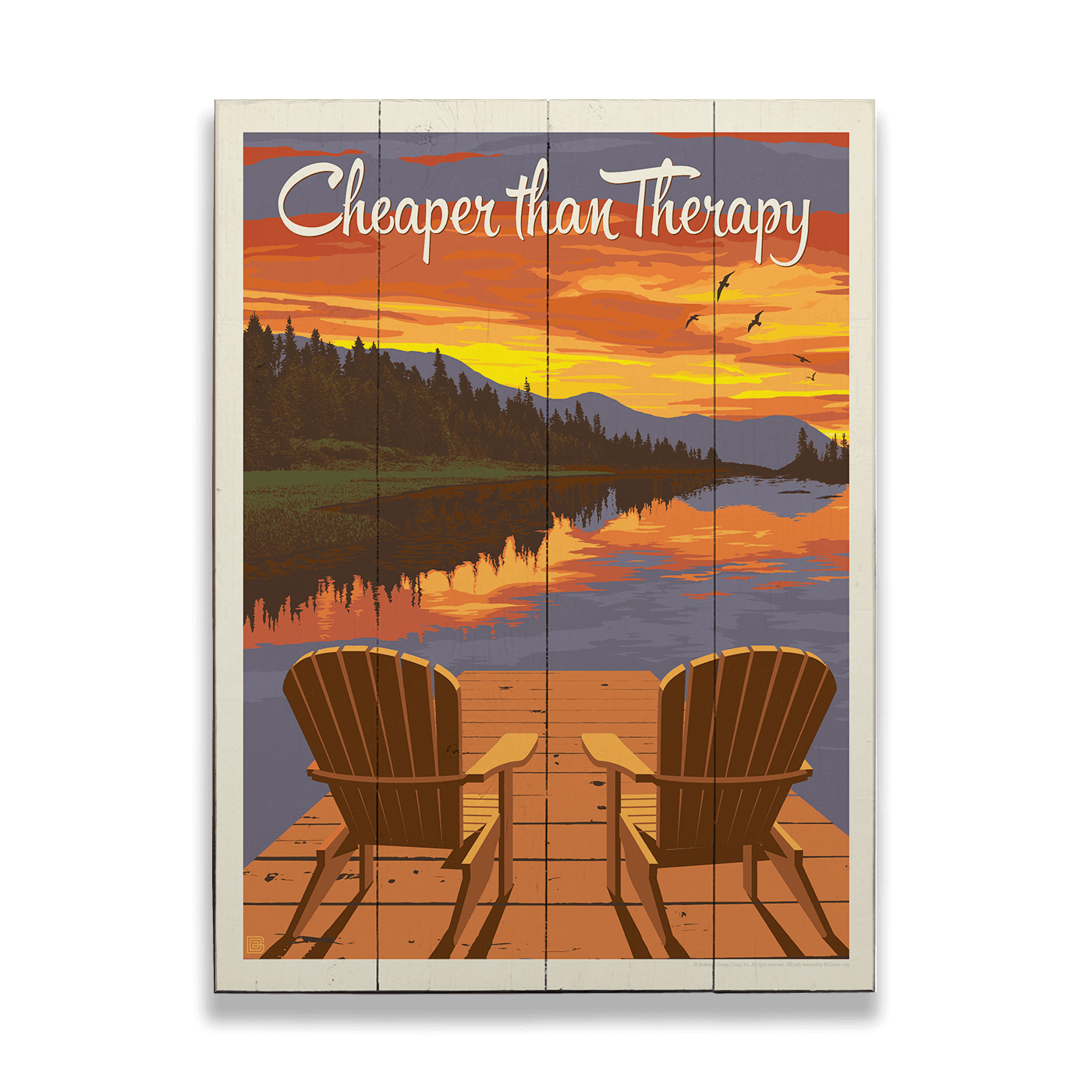 A warm, inviting scene that celebrates the simple pleasure of slowing down, this artwork features two Adirondack chairs on a lakeside dock, overlooking calm water and a glowing sunset framed by distant mountains and pine trees. Rich, layered colors and a vintage-inspired style create a sense of peace and escape, making this piece a perfect reminder that time spent outdoors, watching the day fade, is often cheaper than therapy and far more rewarding.
