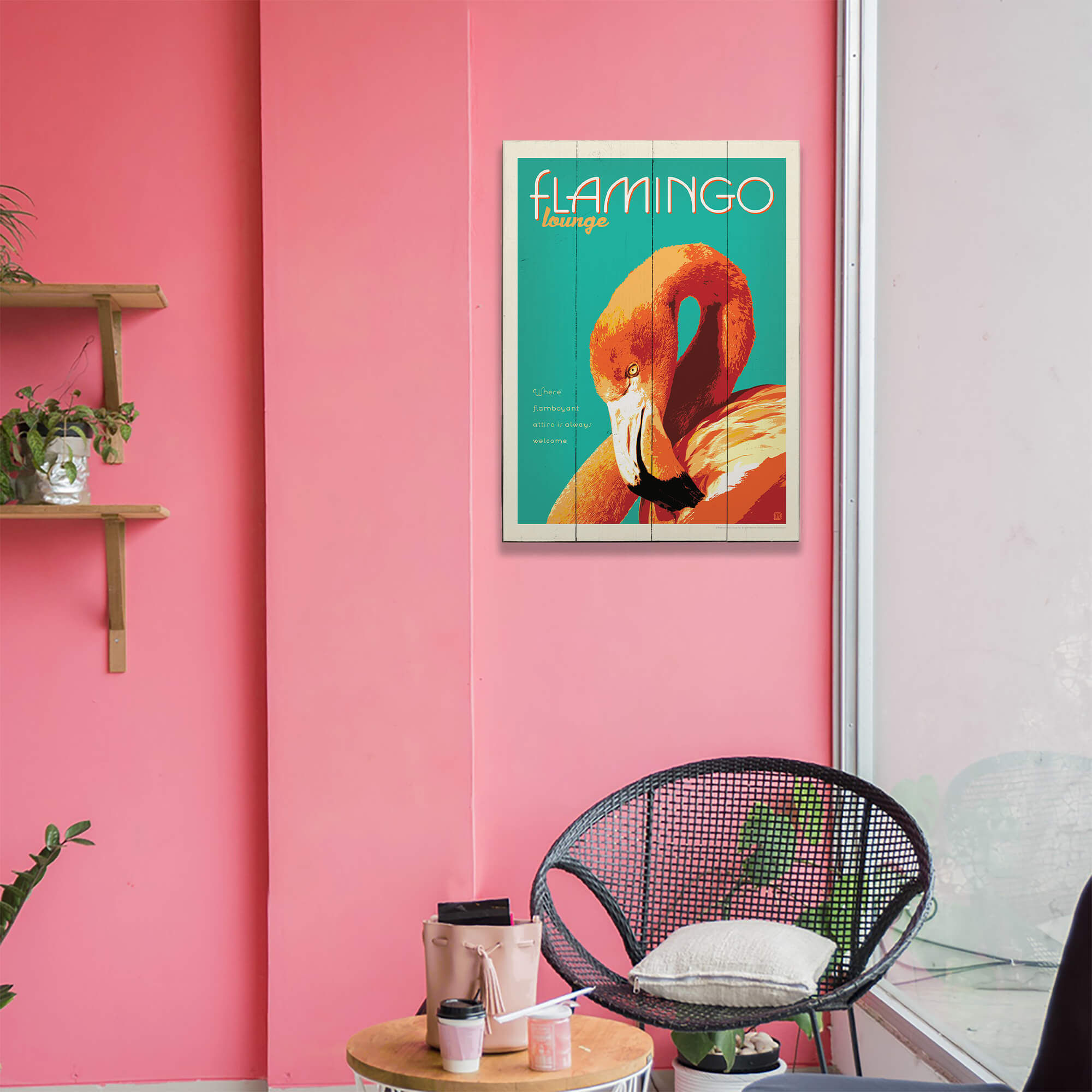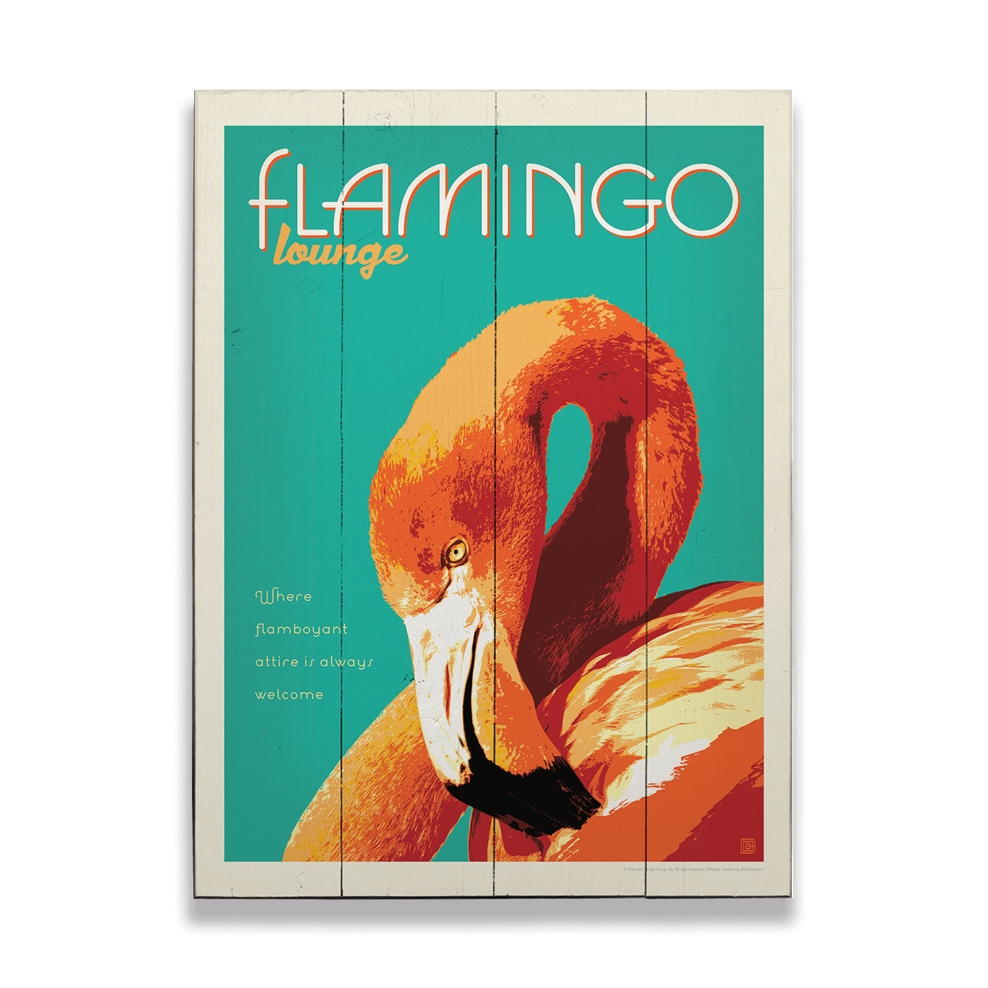 A vibrant, retro-inspired design, this artwork features a striking flamingo rendered in bold coral and warm orange tones against a refreshing teal background. Playful typography and mid-century lounge styling give the piece a laid-back, cocktail-hour vibe, while the captivating pose and rich color palette add personality and flair. Perfect for tiki bars, beach houses, patios, kitchens, or poolside spaces, this flamingo artwork brings a touch of tropical charm and carefree attitude to any room, celebrating color, character, and effortless lagoon style.