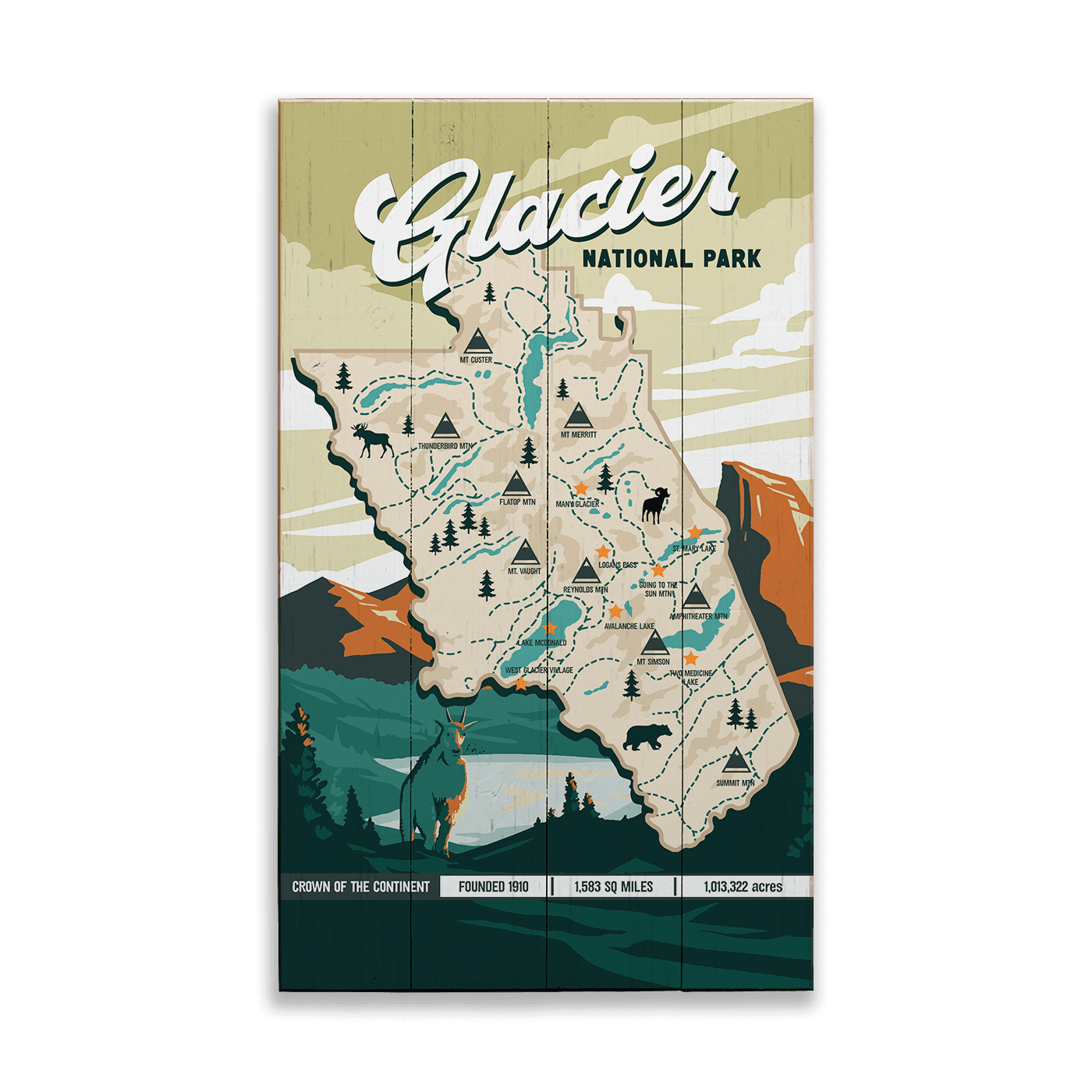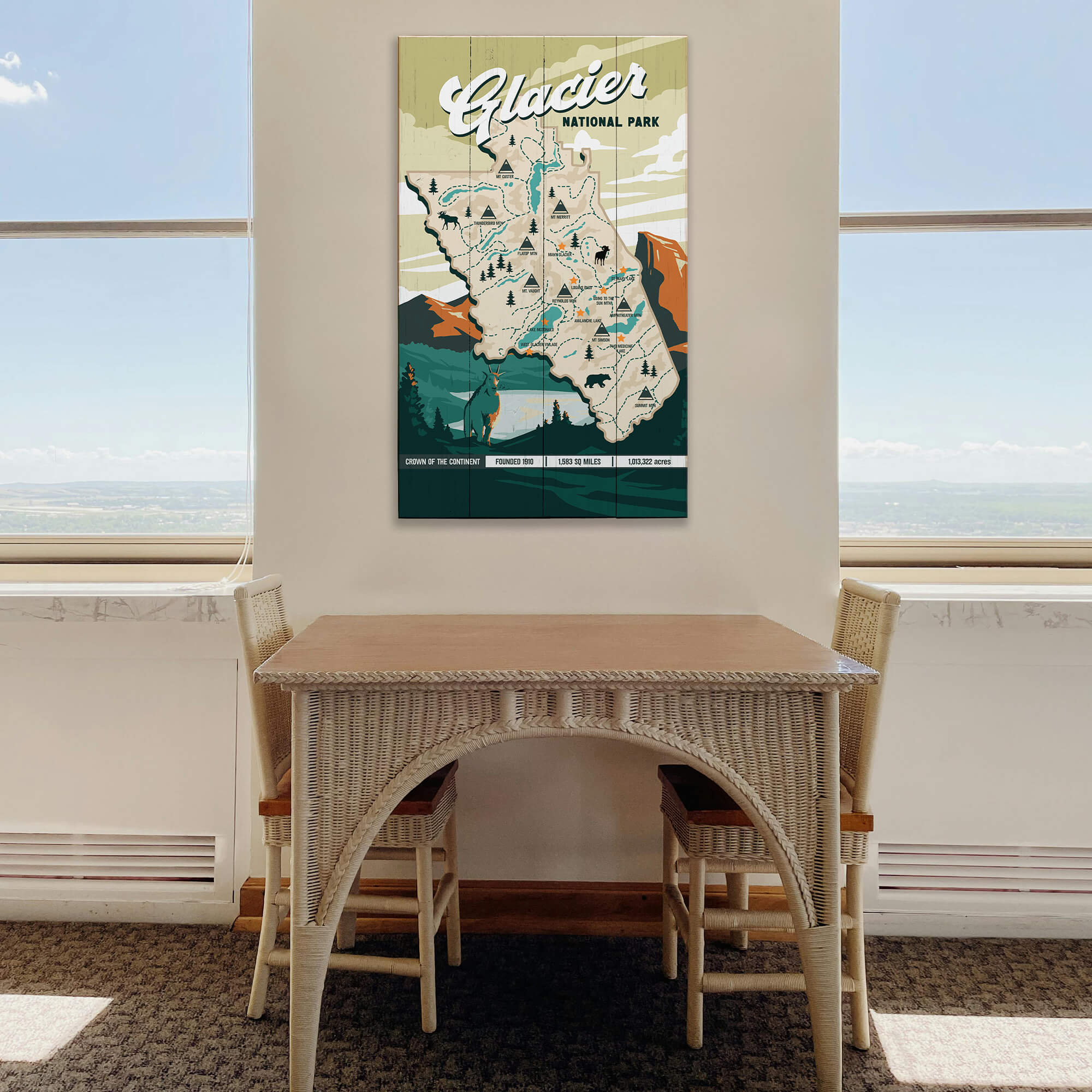 Recognizable landmarks, winding routes, and classic park details are woven throughout the design, offering both visual interest and a sense of exploration. The surrounding landscape elements reinforce Glacier’s dramatic mountain scenery and wild character. A striking piece for cabins, lodges, offices, or travel-inspired spaces, this artwork celebrates the park’s scale, history, and enduring reputation as the “Crown of the Continent.”