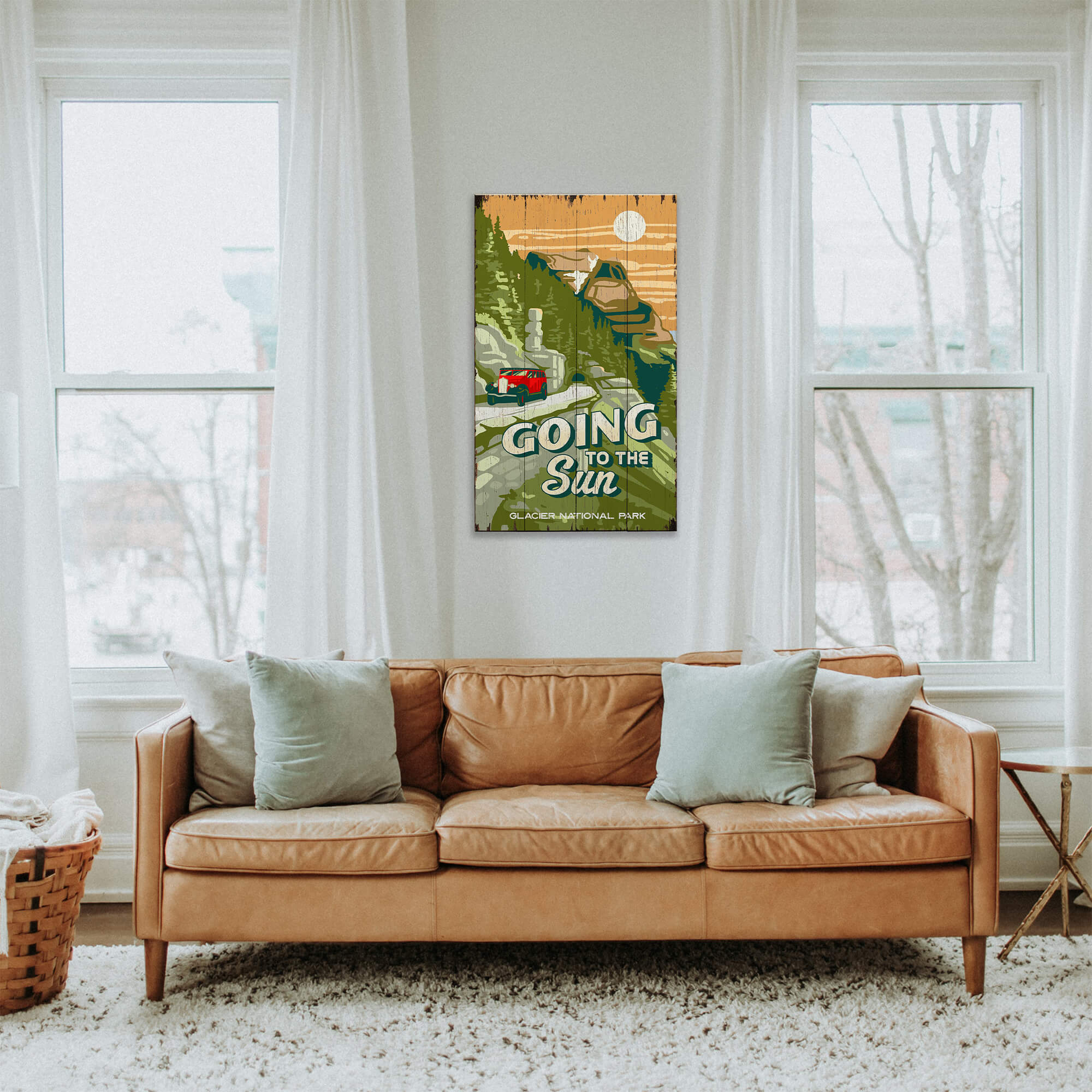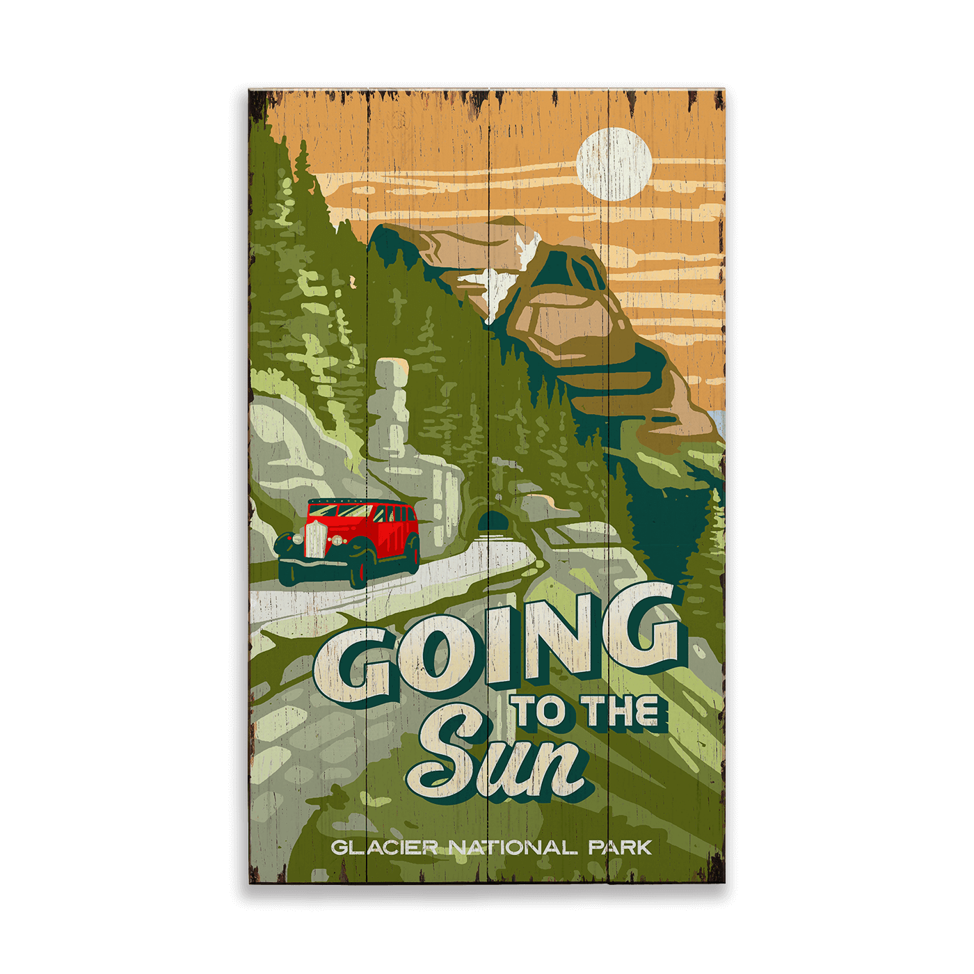 This artwork features Going-to-the-Sun Road, the legendary mountain highway of Glacier National Park, with an iconic red park bus traveling through towering peaks and evergreen forests. Rendered in a bold, vintage-inspired illustration style, it captures the sweeping scenery, historic vehicles, and sense of adventure that define this world-famous drive. A striking statement piece for cabins, lodges, offices, or travel-inspired spaces, it celebrates the timeless experience of exploring Glacier National Park by road.