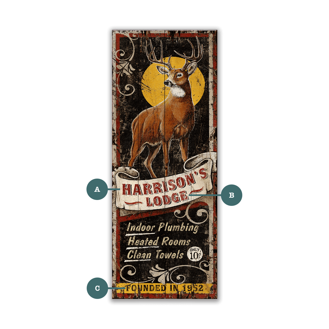 Step into the charm of a bygone era with this vintage-inspired artwork, perfect for adding a touch of rustic elegance to any space. Featuring an iconic depiction of a majestic deer against a moonlit backdrop, this piece encapsulates the essence of classic lodge decor. The artwork is adorned with playful, old-fashioned typography highlighting desirable amenities like 'Indoor Plumbing,' 'Heated Rooms,' and 'Clean Towels,' evoking the welcoming spirit of traditional inns. Ideal for enhancing the ambiance of a home, hunting cabin, or any retreat that appreciates a nod to heritage and the great outdoors.