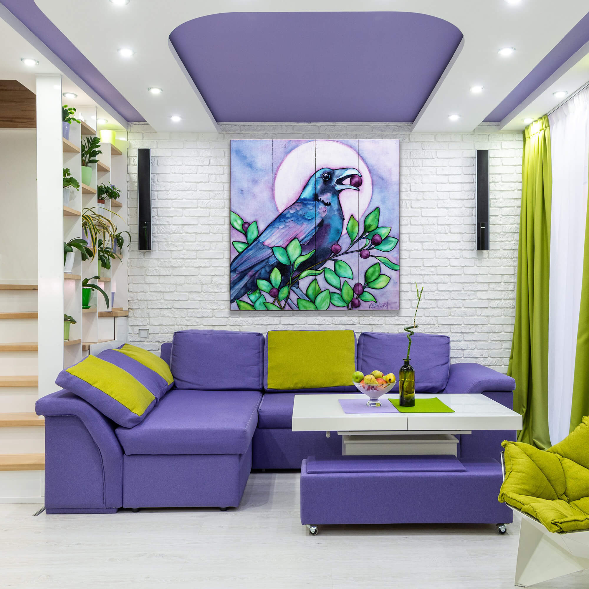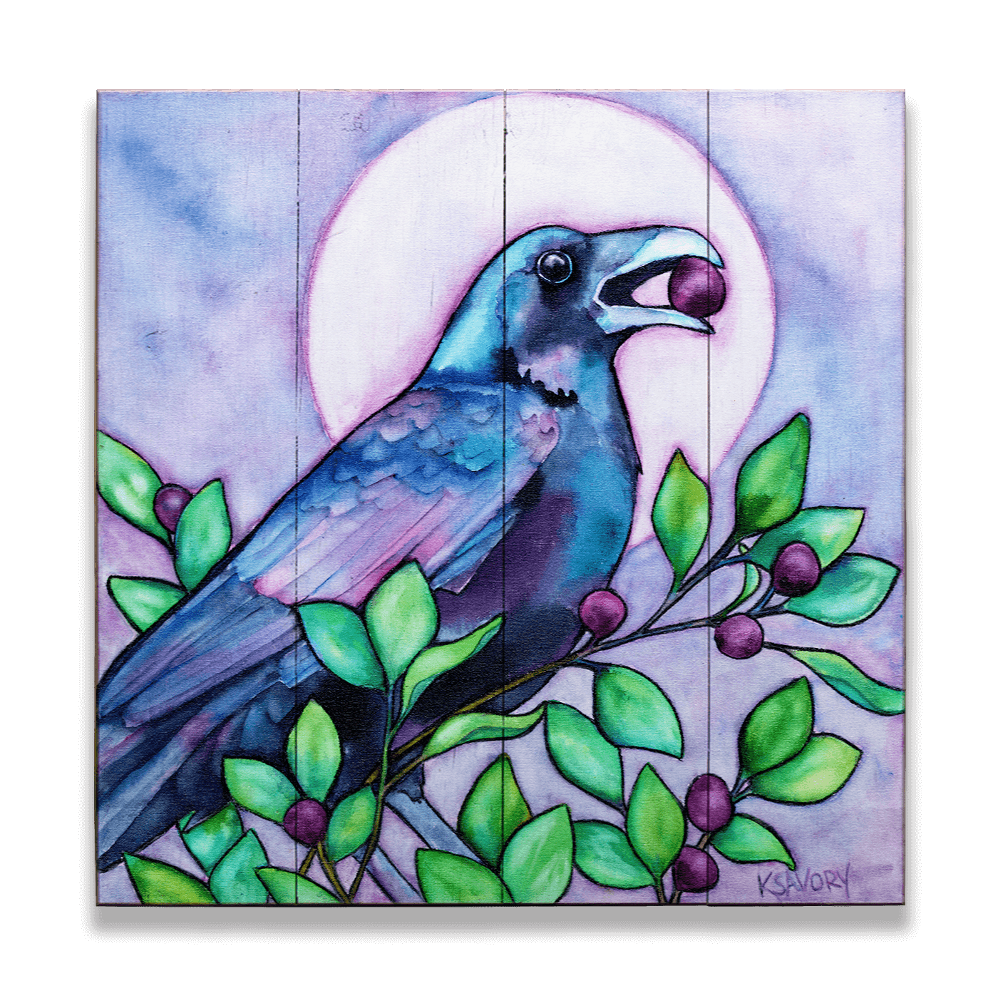 This captivating artwork showcases a crow perched on a huckleberry bush, set against a mystical lavender background. The crow, backed by the glowing moon, brings a sense of intrigue and natural beauty to the piece. Perfect for adding an element of mystery and elegance, this artwork resonates with lovers of wildlife and expressive art.