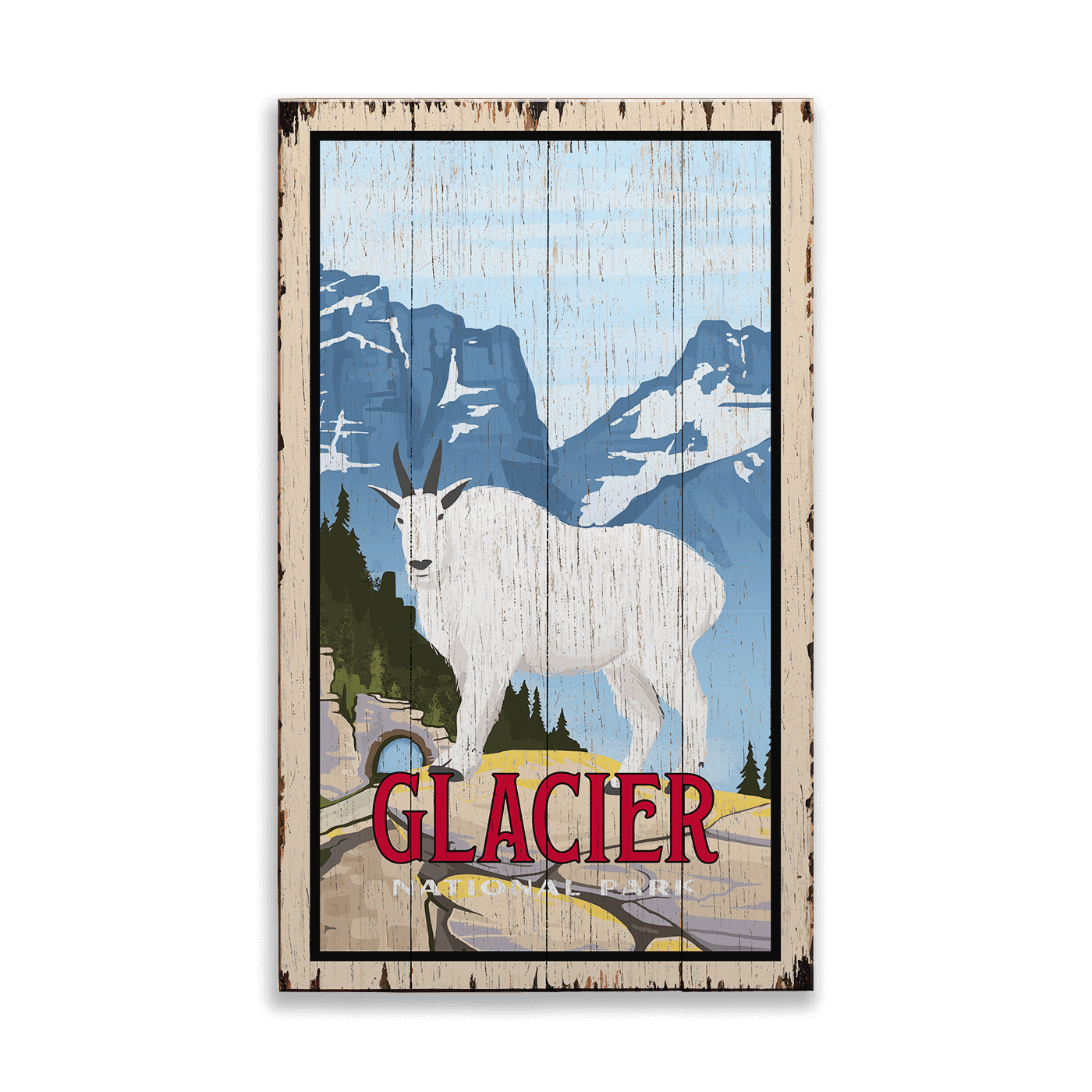This artwork features a mountain goat standing high above Going to the Sun road, set against the dramatic peaks and alpine landscapes of Glacier National Park. Rendered in a bold, vintage-inspired illustration style, it captures the rugged beauty, elevation, and wildlife that define this iconic park.