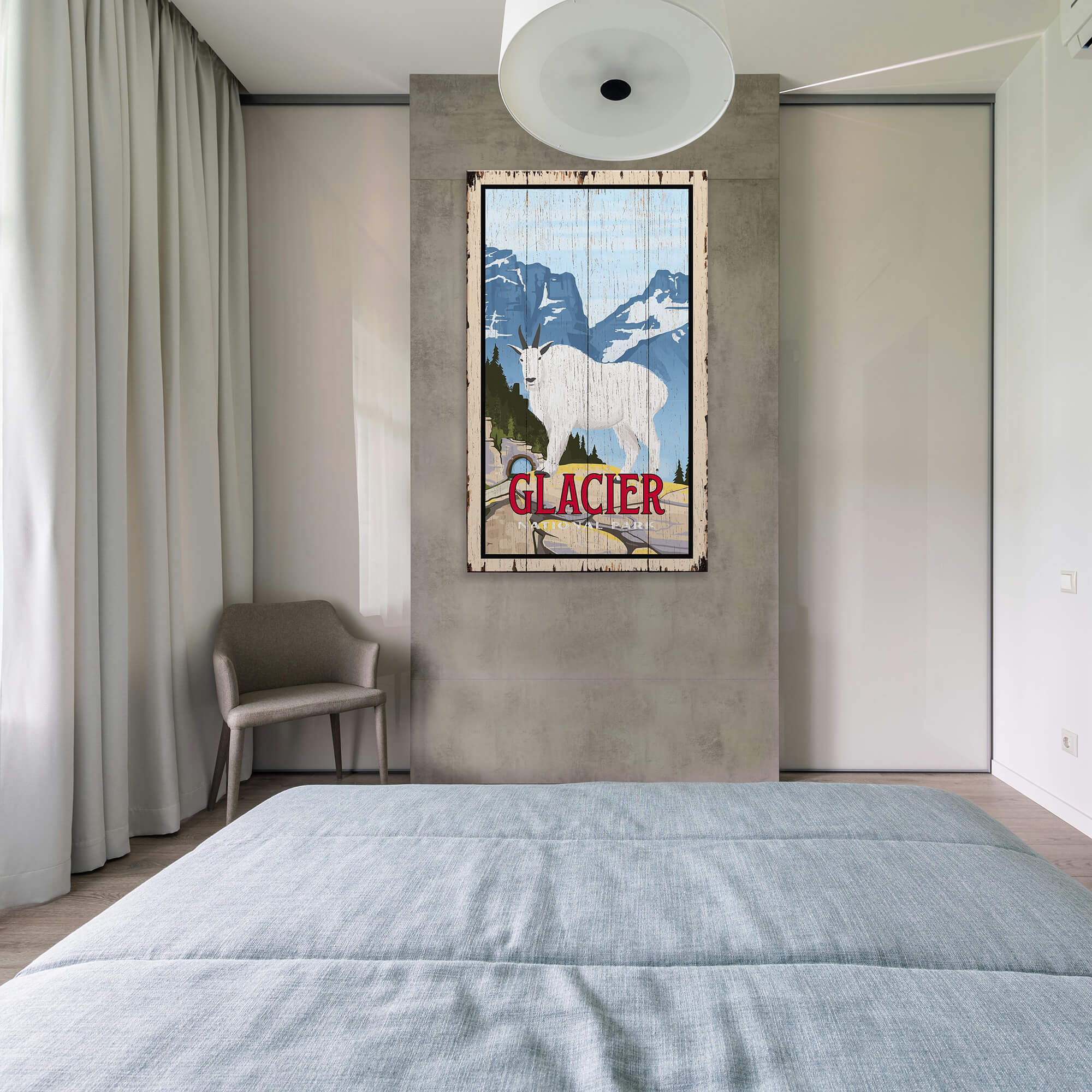 The mountain goat, a symbol closely associated with Glacier, anchors the composition and adds a sense of scale and wilderness presence. A striking piece for cabins, lodges, and nature-inspired spaces, this artwork celebrates the enduring spirit of Glacier National Park and its unforgettable alpine scenery.