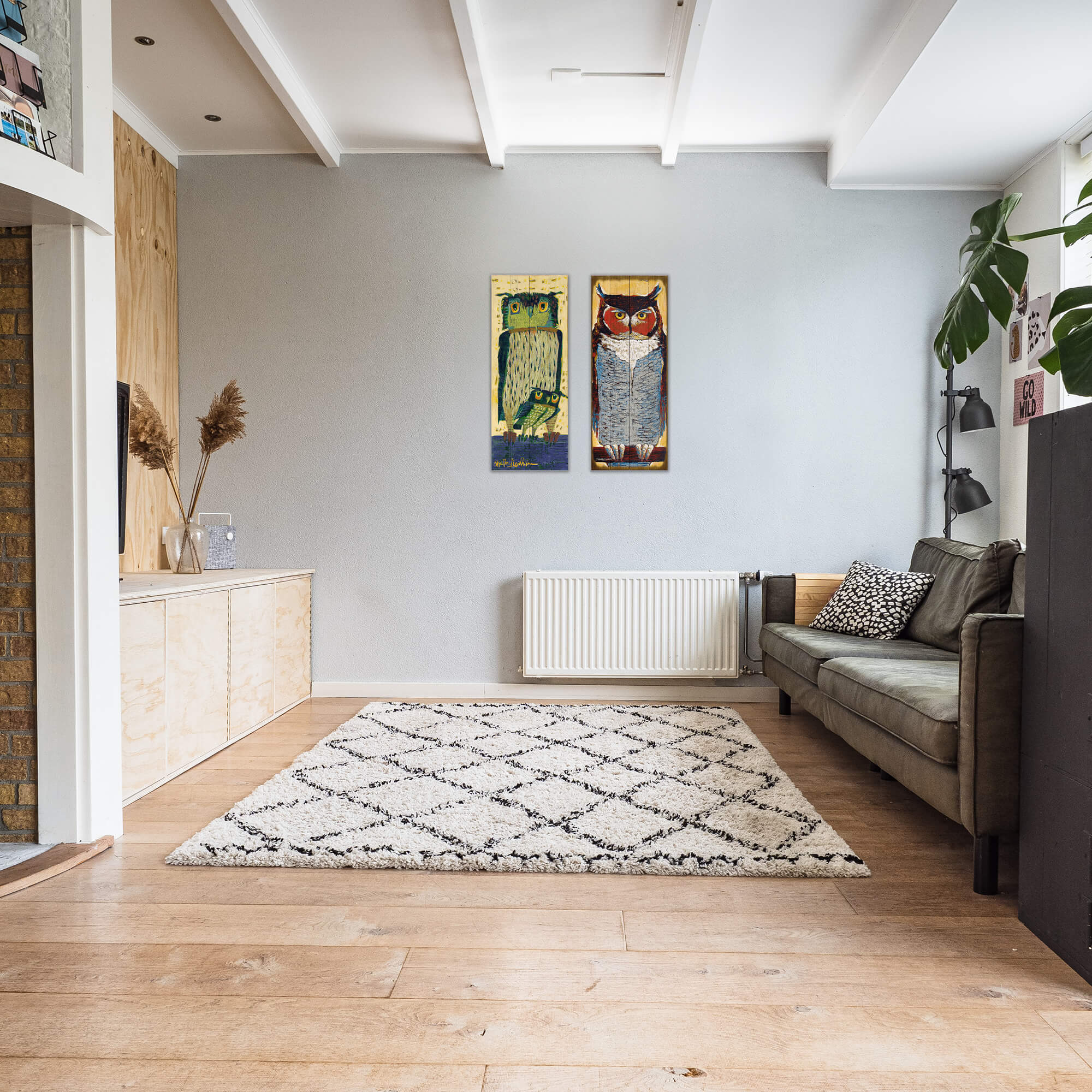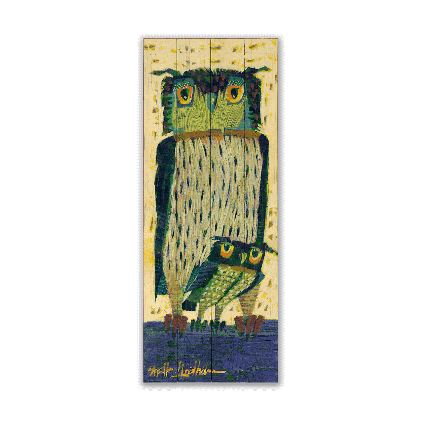 This charming artwork showcases a pair of owls, a large adult and a smaller juvenile, both exuding wisdom and curiosity with their striking, wide-eyed expressions. The textured feathers and rich, earthy hues add depth and personality to the piece, while the bright, abstract background gives it a playful and artistic flair. Ideal for wildlife lovers and art enthusiasts alike, this piece beautifully captures the bond between the two owls in a whimsical, nature-inspired setting.