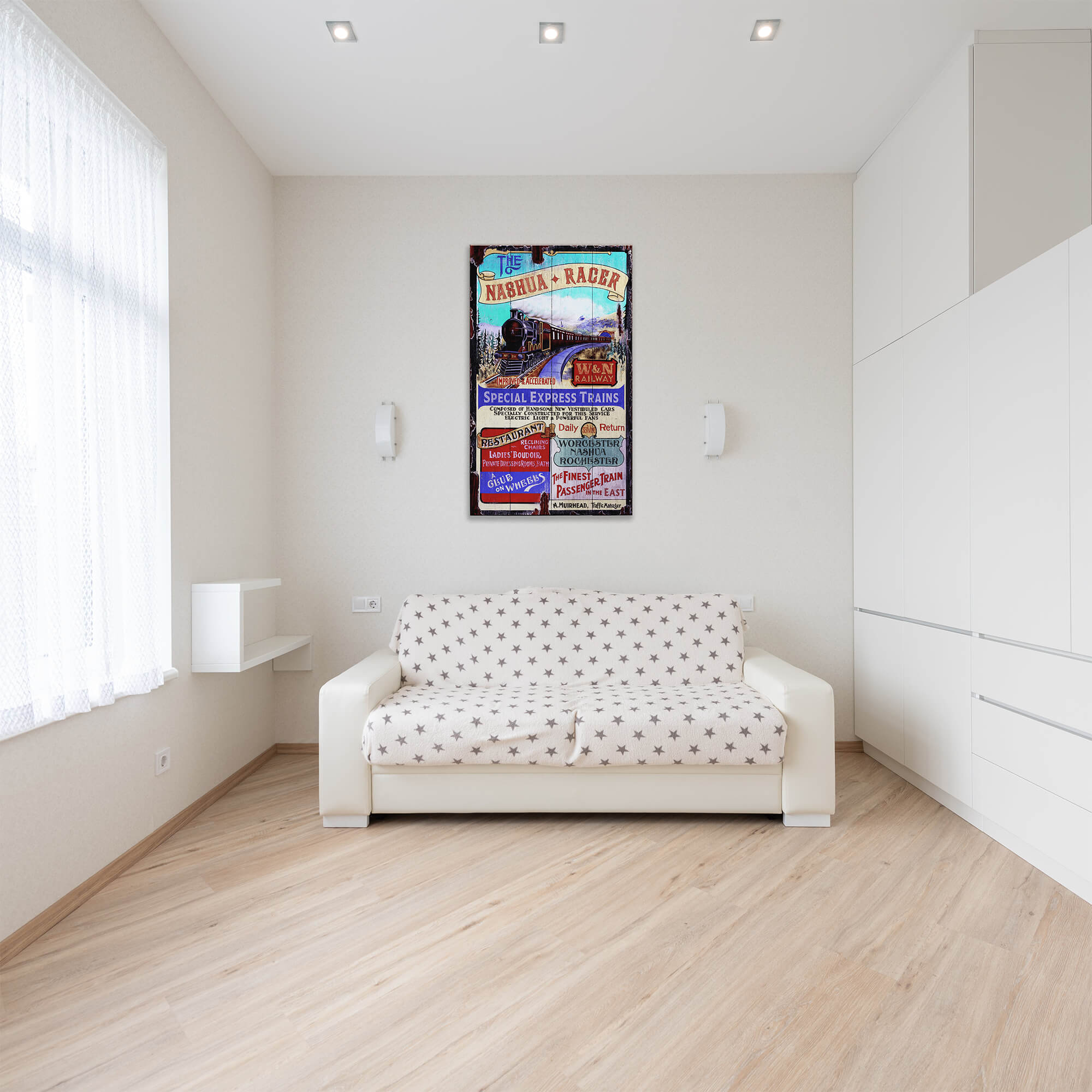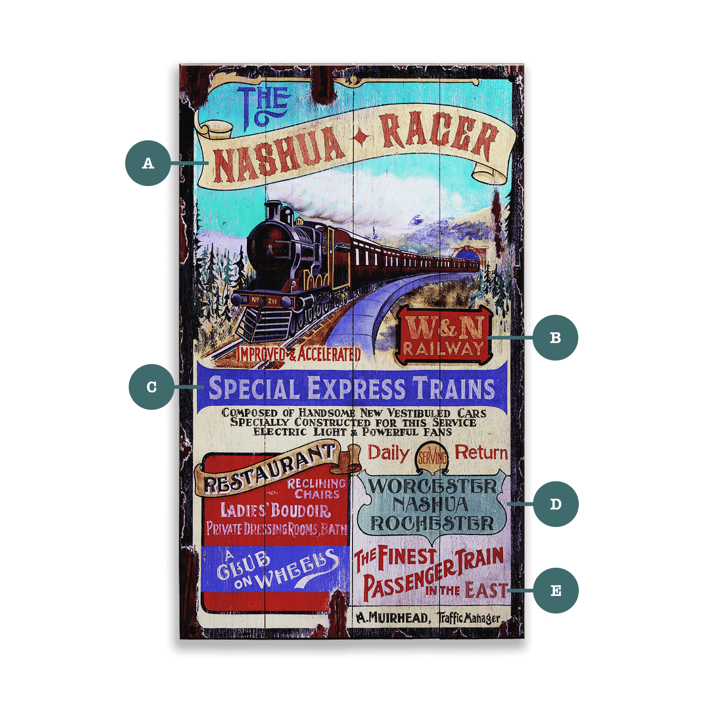The Nashua Racer captures the golden age of rail travel in bold, vintage poster style. A powerful steam locomotive rounds the bend, pulling its gleaming passenger cars toward distant hills, promising speed, comfort, and adventure. Rich colors, classic typography, and weathered detailing give this piece the feel of an authentic early 20th century railway advertisement.