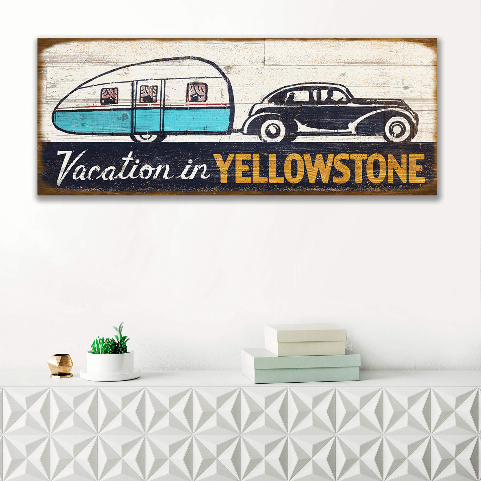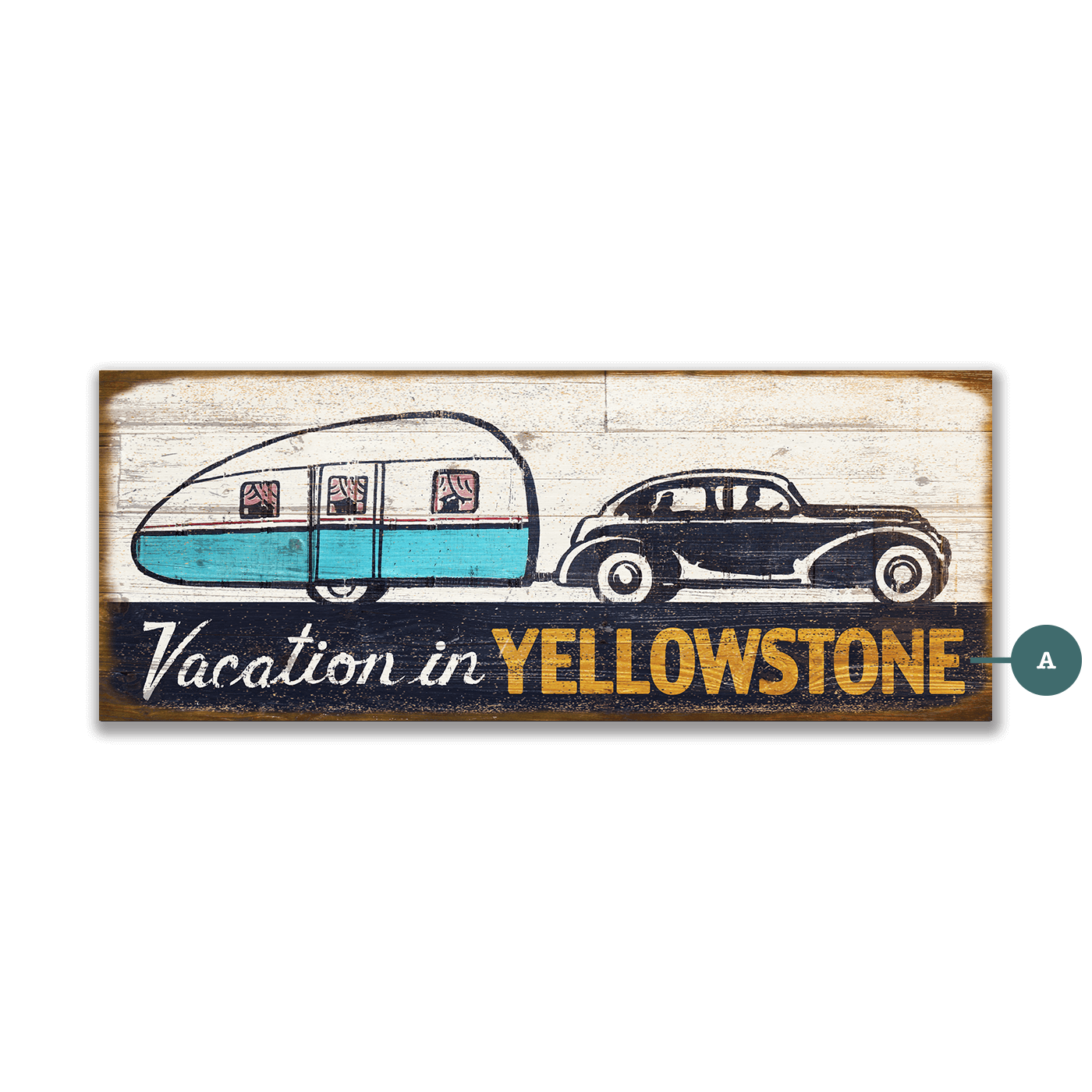 Hit the road and bring the spirit of adventure into your home with this classic artwork. The piece features a vintage car towing a camper - it could be right out of the1940's, a timeless embodiment of the American road trip dream. This charming depiction is perfect for those who cherish the call of the wild and the open road. Ideal for adding a touch of wanderlust to any living space, RV, or lodge, it's a picturesque reminder of the joys of travel. Personalize it with your destination of choice.