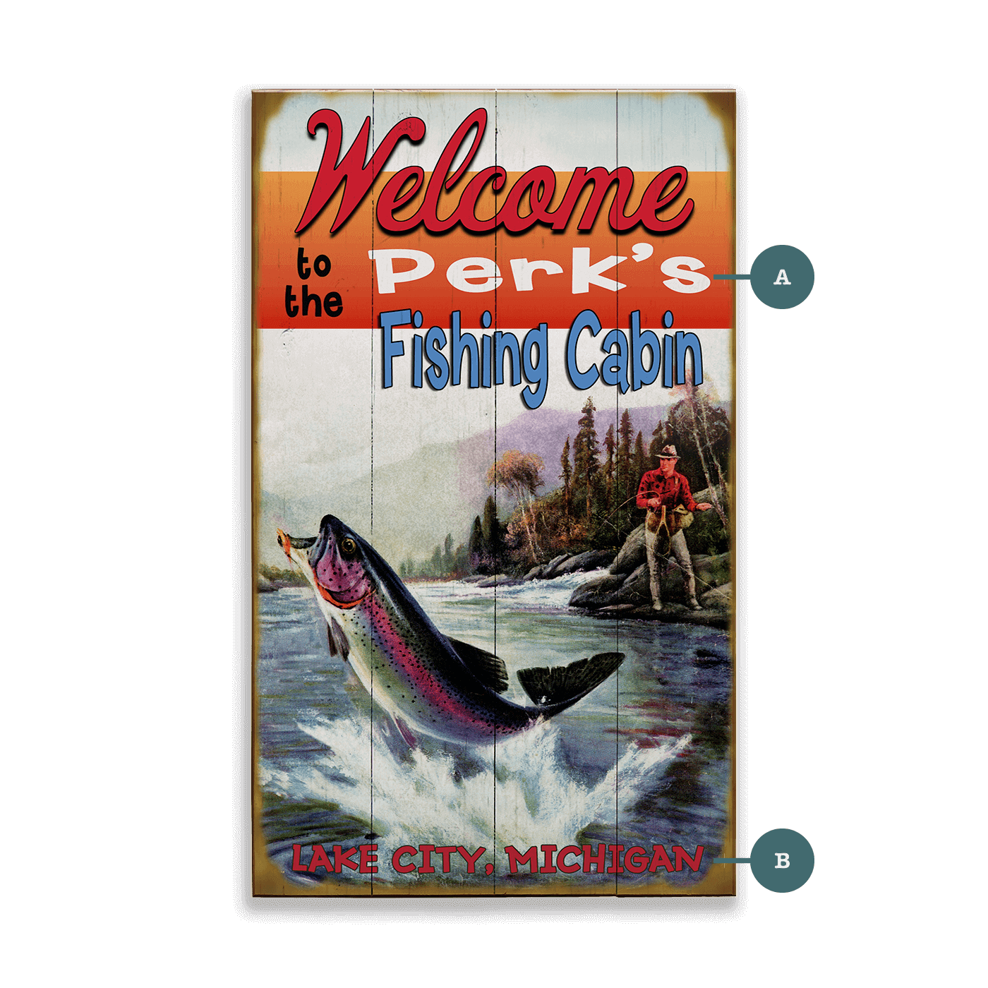 Step into a rustic fishing adventure with this vibrant and inviting artwork, perfect for any angler's retreat or lakeside cabin. The piece features a lively fish leaping from the water, set against a backdrop of serene river scenery and a fisherman in action. The bold and welcoming text adds a personal touch, making it a perfect piece to greet guests and imbue any space with the spirit of outdoor adventures and leisurely fishing days.