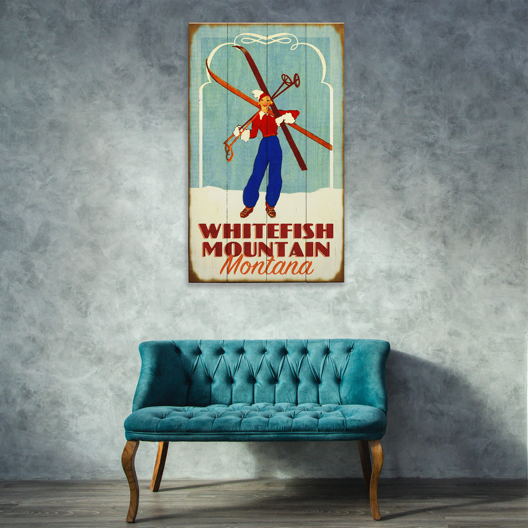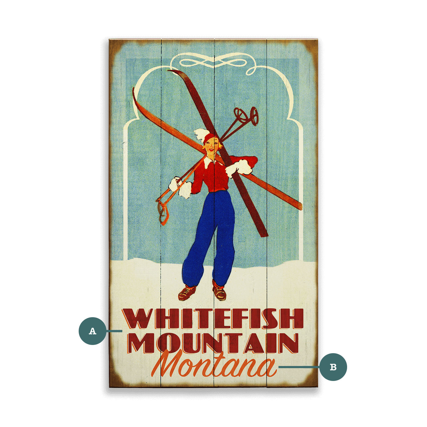 Bring a touch of timeless ski culture to your space with this vintage-inspired winter sports sign. A confident skier, bundled in retro alpine fashion, strides across a snowy slope with skis and poles slung over her shoulders. The bold colors, nostalgic style, and distressed finish recall the golden age of ski travel, evoking memories of crisp mountain air, fresh powder, and cozy lodge evenings. Perfect for ski cabins, chalets, or any space that celebrates the thrill of winter adventure and the elegance of classic alpine design.