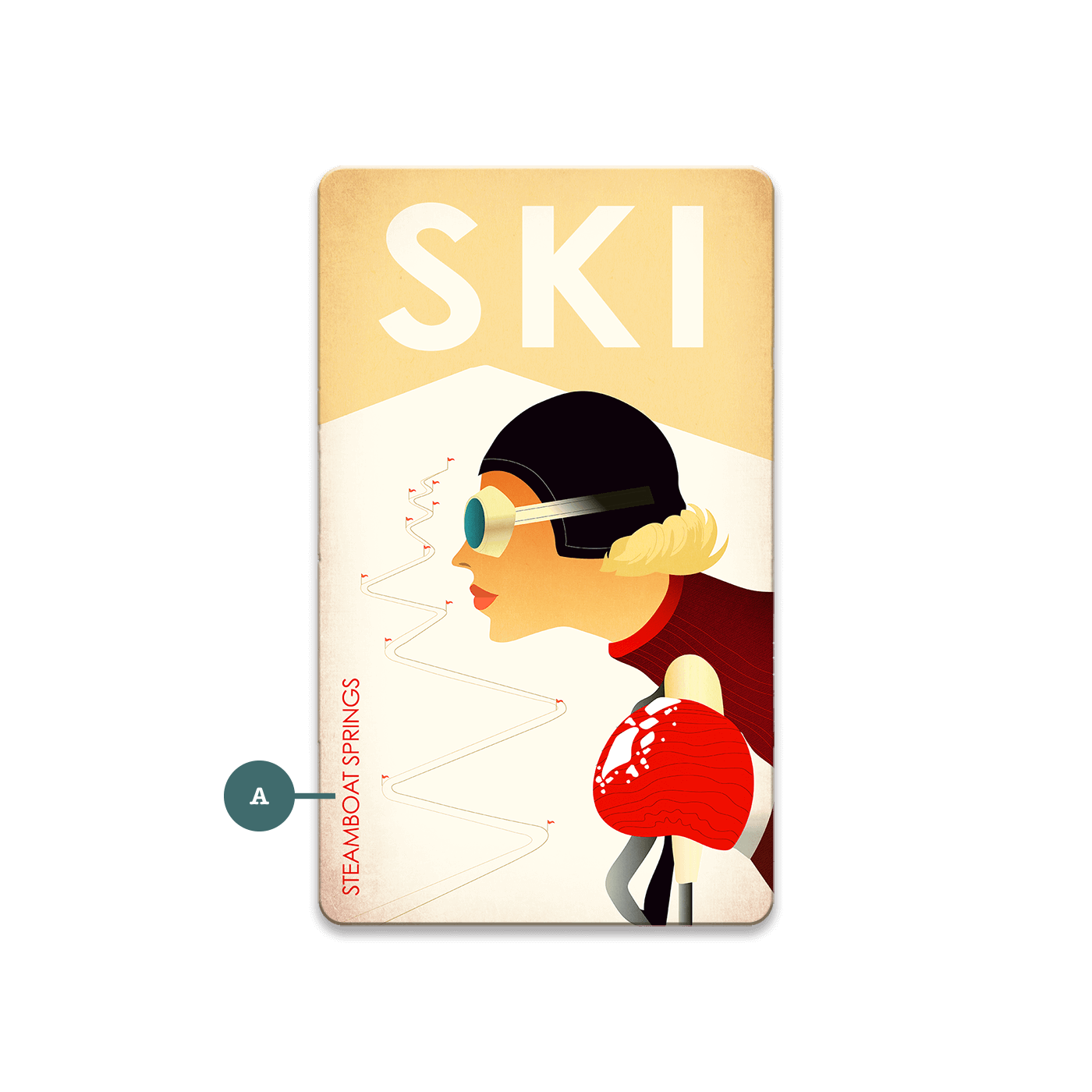 With bold shapes, clean lines, and a warm mid-century palette, this stylized ski-themed artwork blends retro charm with modern graphic appeal. A focused skier in vintage style and mirrored goggles leans forward with determination, while a zigzagging ski trail captures the thrill of carving down the mountain. This piece is ideal for mountain lodges, ski chalets, or any space that celebrates the excitement of alpine adventure through bold, minimalist design.