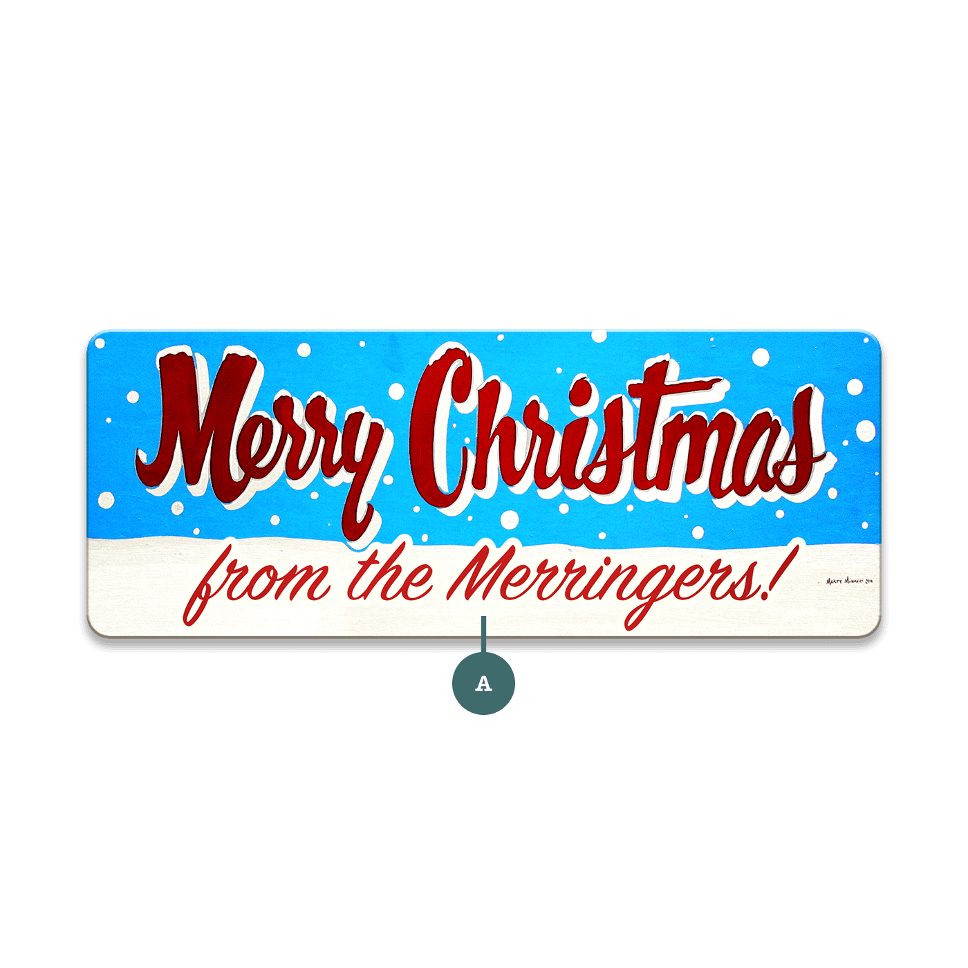 Spread the joy and warmth of the holiday season with Marty Mummer's hand-painted "Merry Christmas" sign. This festive piece features classic red script against a snowy blue backdrop, evoking the cherished feelings of a white Christmas. With the option to personalize the text, this sign is perfect for families to display their holiday greetings or for businesses to share seasonal cheer with their customers. Whether hung in a cozy living room, welcoming entryway, or bustling storefront, it’s a delightful way to wish everyone a Merry Christmas and to make the holiday season feel a little more like home.