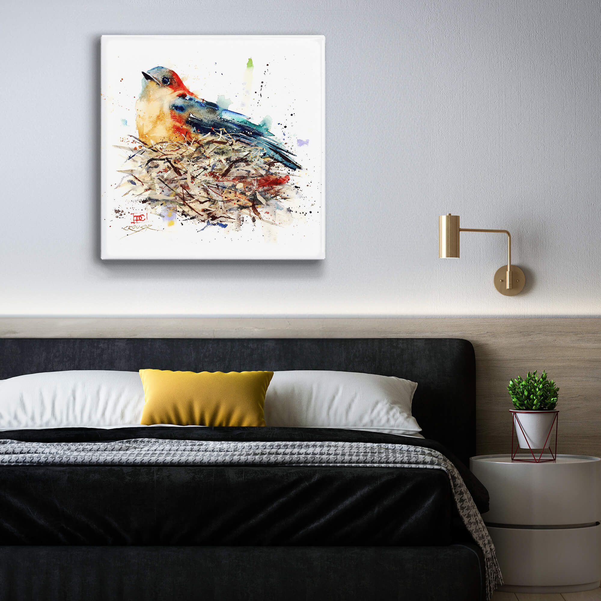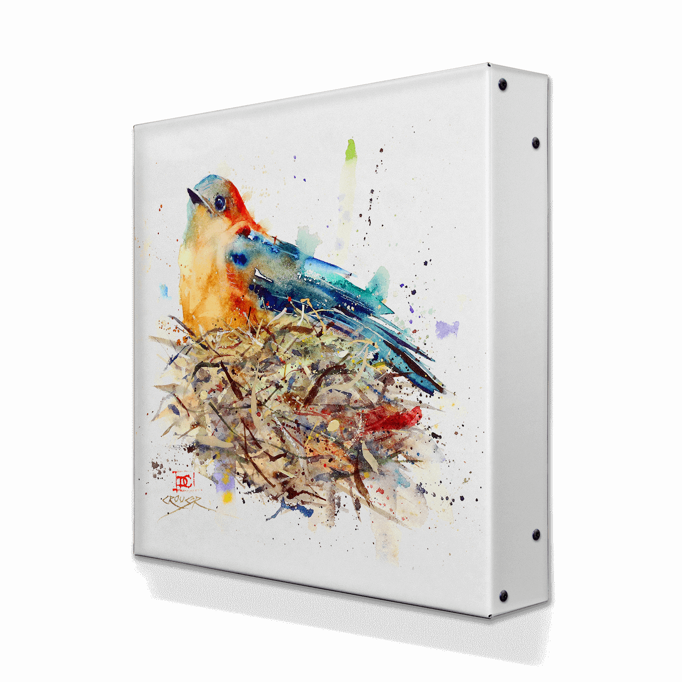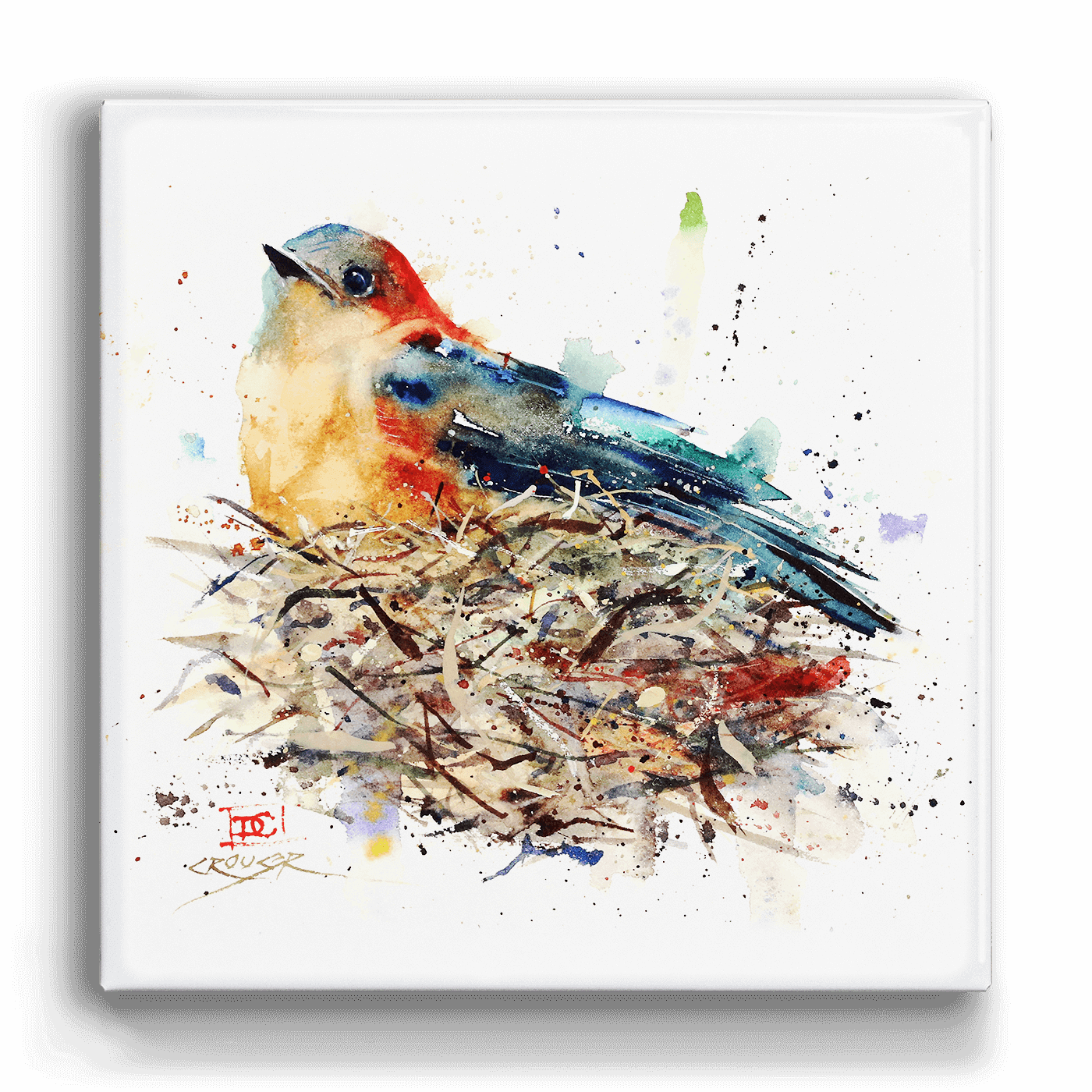 This watercolor painting beautifully portrays a bird at rest, its vibrant plumage a blend of warm and cool tones that mimic the splendor of nature. Perched atop its nest, the bird is depicted with a sense of quiet anticipation, the strokes and splatters of paint around it suggesting the serene environment. Ideal for adding a calm yet colorful touch to any space, this artwork is a testament to the peaceful moments of wildlife.