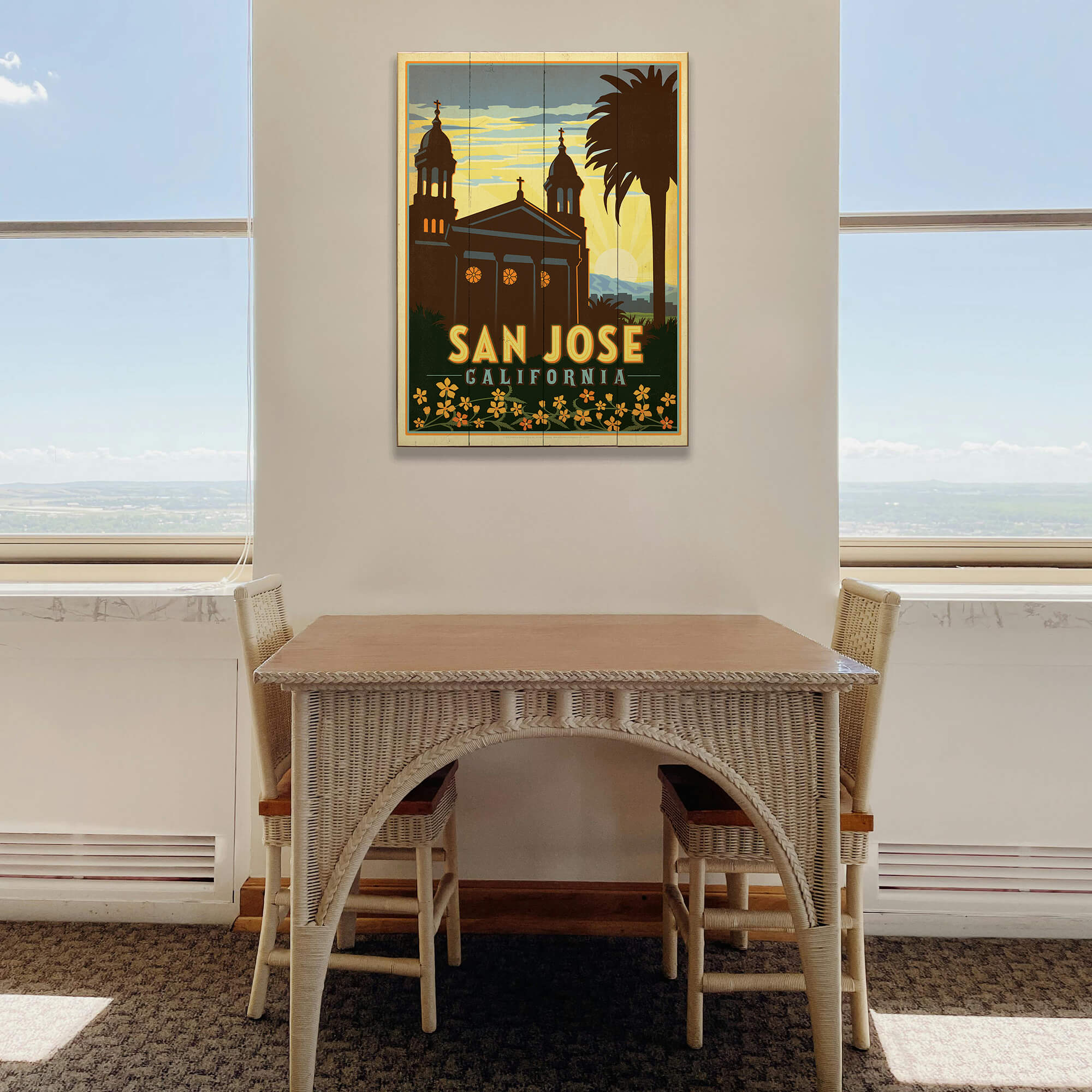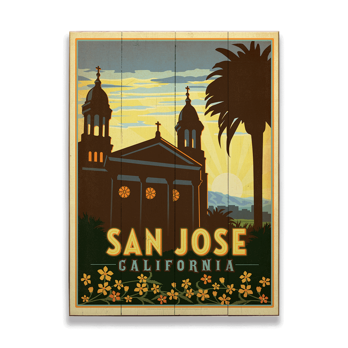 Step into the vibrant heart of Silicon Valley with this vintage-style San Jose, California print. It artfully captures the historic charm of the city with an elegant depiction of one of its iconic missions, set against a backdrop of a serene California sunset. The foreground is adorned with the golden blooms of the state flower, the California poppy. This piece is a perfect blend of San Jose’s rich past and its dynamic present, ideal for anyone who cherishes this bustling city’s heritage.