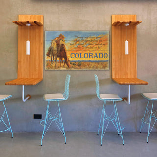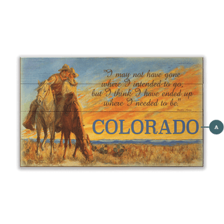 This artwork captures the peaceful beauty of the Colorado landscape, featuring a pair of riders sharing a quiet moment on horseback as the sun sets over the open plains. The soft, painterly style and warm, golden hues evoke a sense of reflection on life's journey and the joy of belonging. The bold typography and weathered design enhance its timeless charm, making it an ideal piece for those who appreciate western landscapes, the spirit of adventure, and the feeling of finding home on the range. Perfect for rustic decor, ranch settings, or anyone drawn to the open skies of the West.