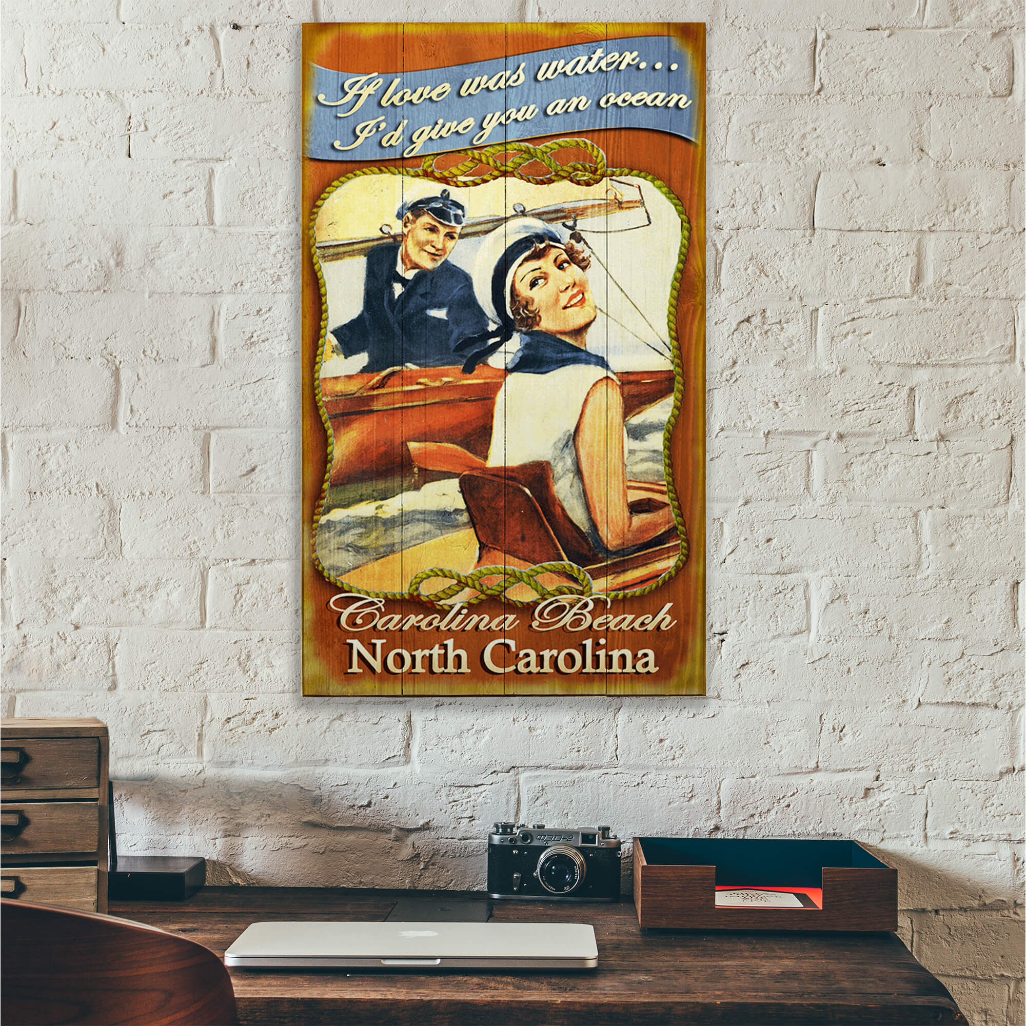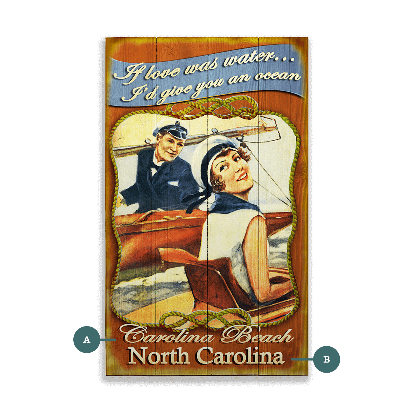 Celebrate love and nautical charm with this delightful vintage-style artwork. Featuring a joyful couple enjoying a day on the water, this piece captures the essence of romance and adventure. The vibrant colors and nostalgic design make it a perfect addition to any home, evoking a sense of timeless elegance and joyful moments. Ideal for those who appreciate maritime themes and retro aesthetics, this artwork brings a touch of whimsy and romance to your decor.