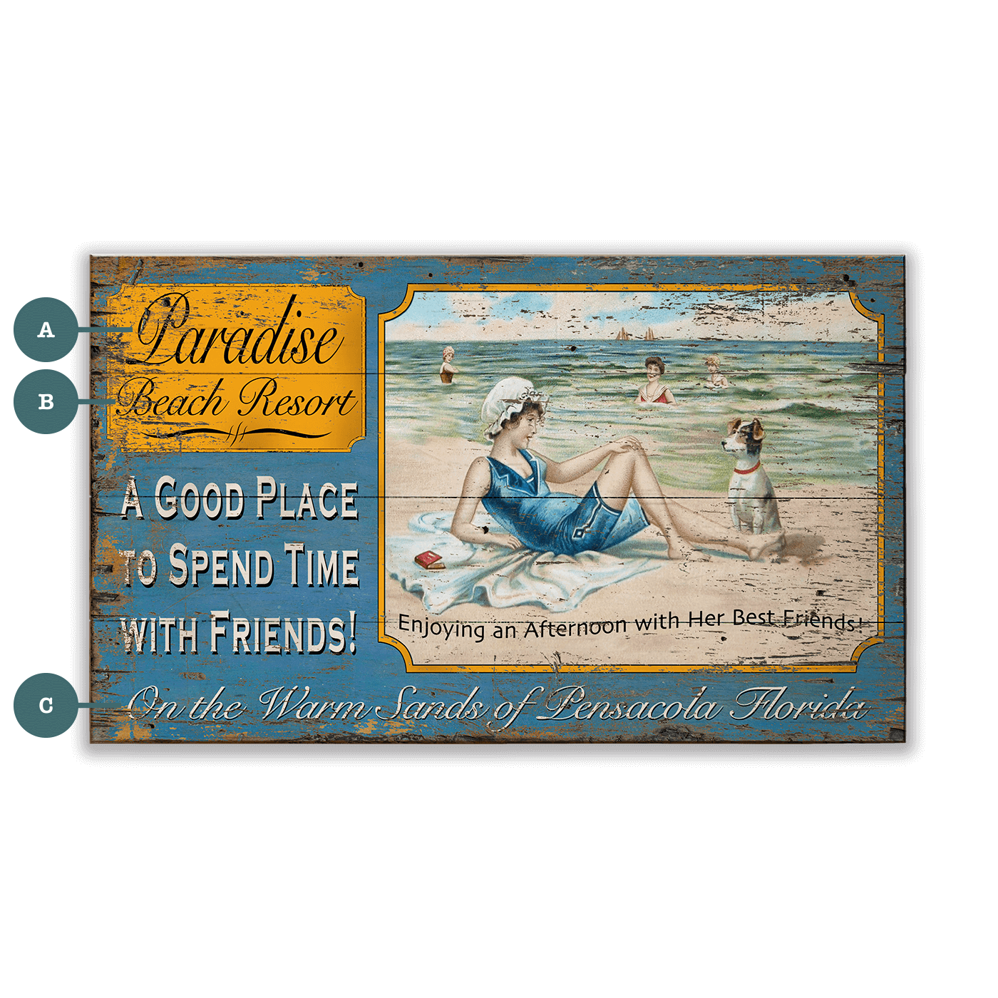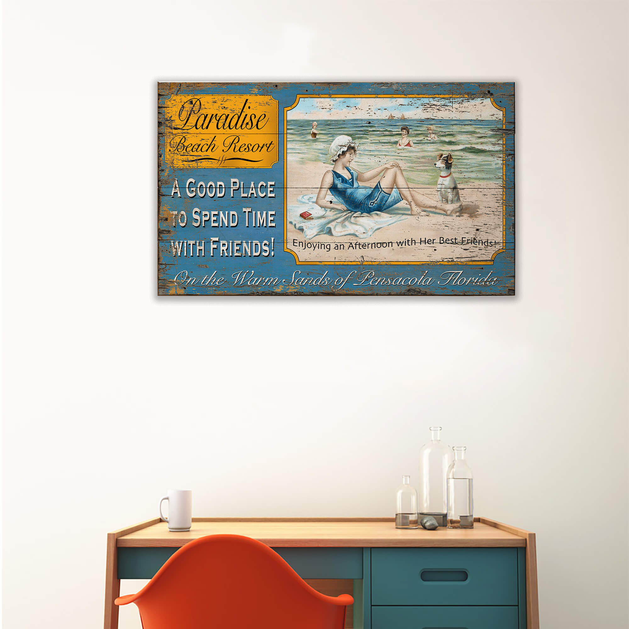 This charming vintage-style artwork celebrates the joys of a day at the beach with friends, complete with retro colors and playful typography. The nostalgic beach scene brings a sense of warmth and relaxation, making it a perfect addition to any coastal-inspired room, patio, or beach house. With a weathered look and a touch of whimsy, this sign captures the essence of carefree summer days. Personalization options are available, allowing you to add your own special message.