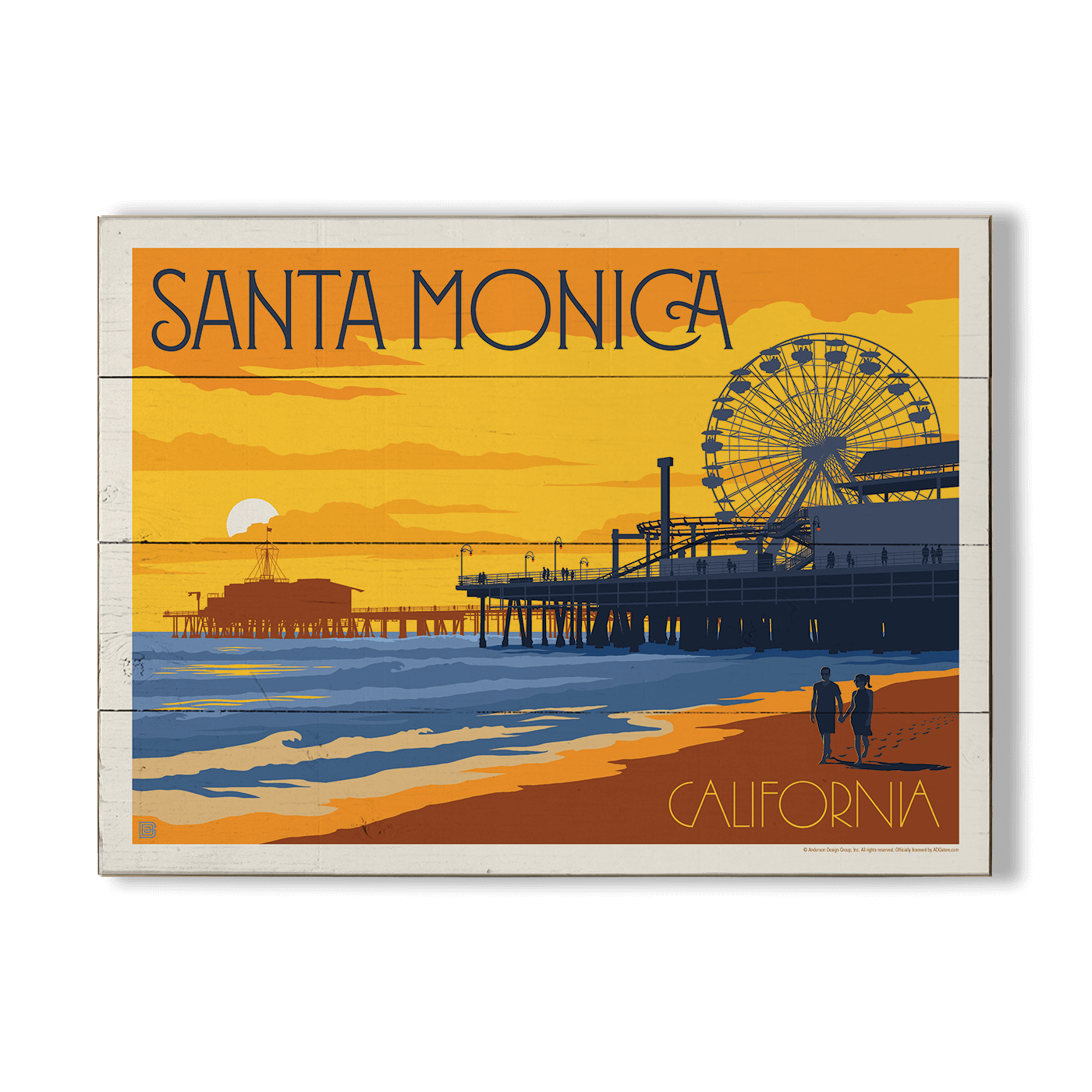 Capture the charm of one of California’s most iconic coastal destinations with this bold, sunset-toned artwork featuring the world-famous Santa Monica Pier. The scene highlights the towering Ferris wheel, bustling boardwalk, and the historic Looff Hippodrome Carousel, all set against the tranquil Pacific. Known as the western terminus of the legendary Route 66, this beachfront location blends vintage Americana with vibrant coastal energy. The warm Art Deco–inspired design evokes the golden age of seaside recreation, making this piece a nostalgic and stylish addition to any beach house, travel-themed space, or coastal retreat.