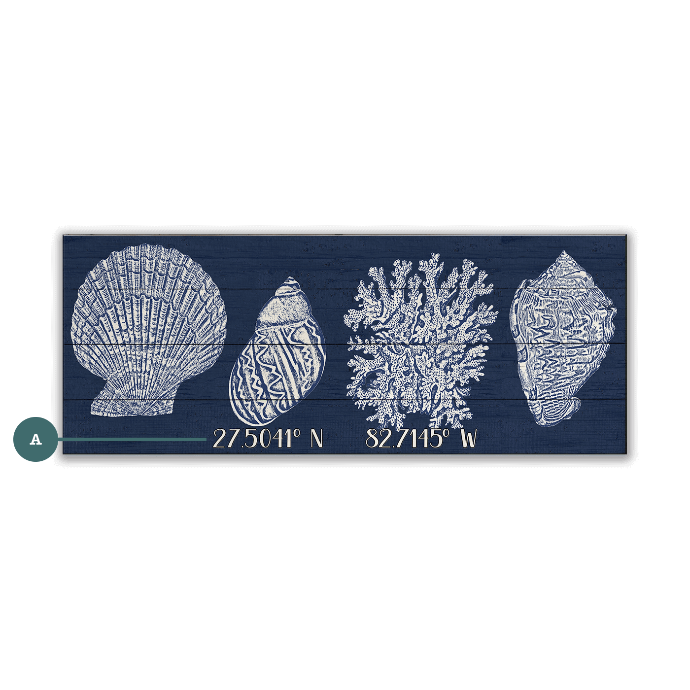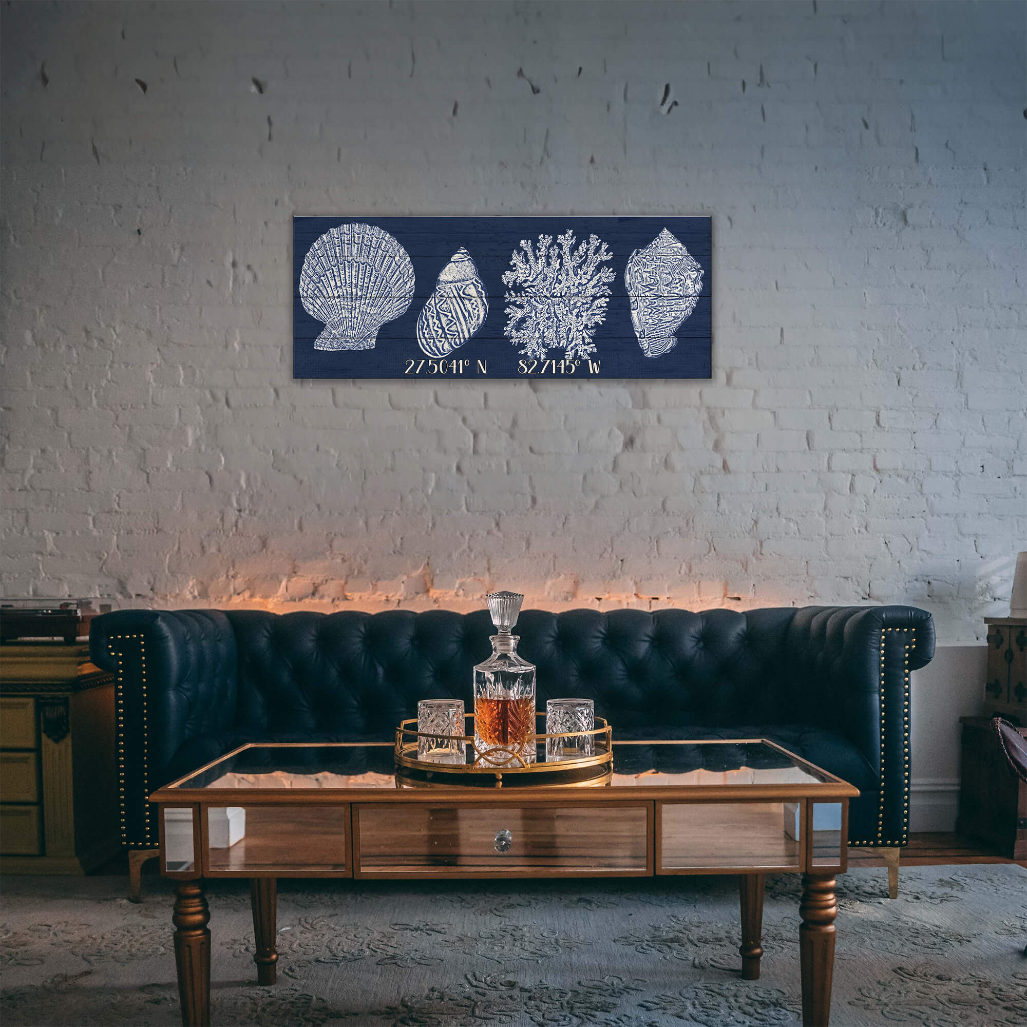 This coastal-inspired artwork features detailed illustrations of seashells and coral, paired with nautical coordinates for a touch of beachside charm. The dark blue background and white line art create a classic, oceanic vibe, making it a perfect fit for beach houses, coastal-themed rooms, or any space that celebrates sea life. Personalization options are available, allowing you to customize the coordinates for a unique and meaningful touch.