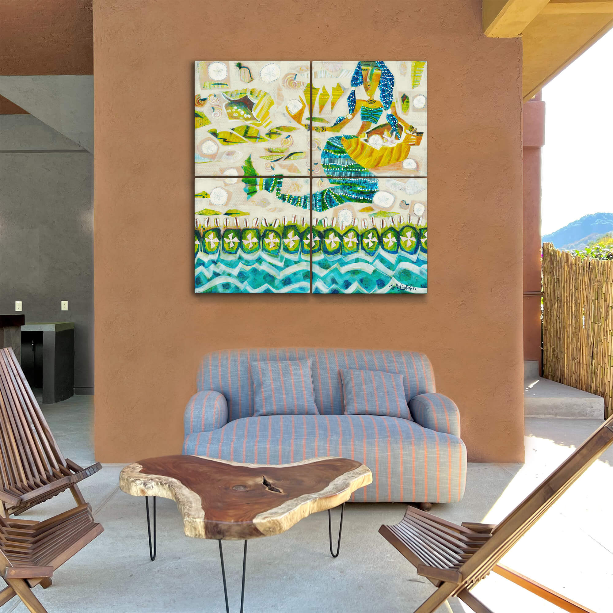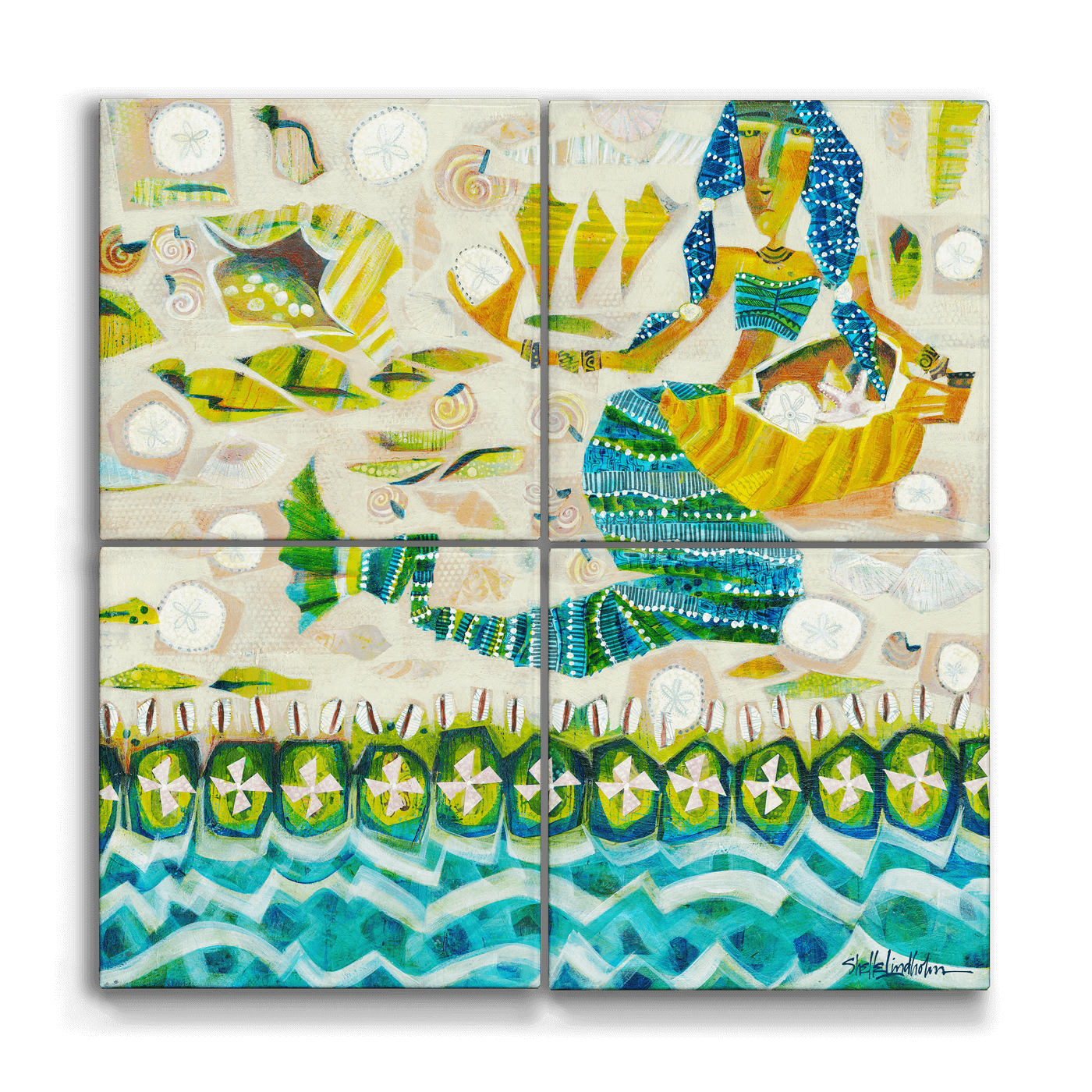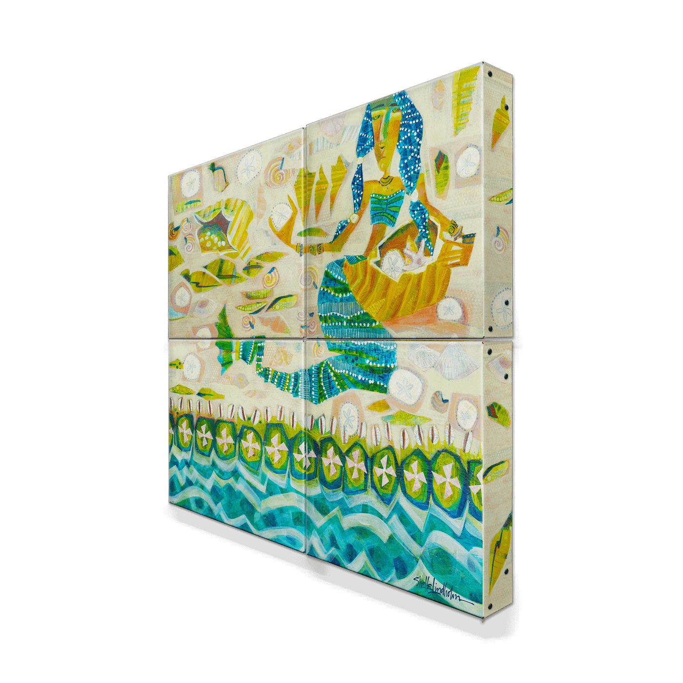 "The Shell Collector" is a captivating four-panel artwork that combines vibrant colors and intricate patterns to depict a serene beach scene. The artwork features a mermaid gracefully collecting shells, surrounded by an array of oceanic motifs. Each panel contributes to the overall composition, creating a cohesive and visually engaging piece. The rich blues, greens, and yellows bring a sense of calm and wonder, making it a perfect addition to any coastal or nature-inspired decor. "The Shell Collector" will add a touch of whimsy and charm to your space.