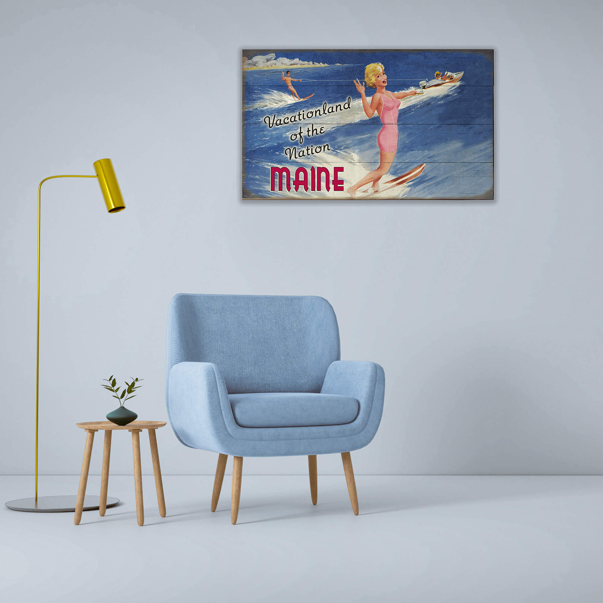 Dive into the excitement of summer with this vibrant vintage-style artwork, celebrating the joys of water sports. This piece features an energetic scene of water skiers gliding effortlessly across a glistening sea, with a focal figure cheerfully waving, embodying the spirit of vacation and leisure. Ideal for adding a splash of retro charm and liveliness to any space, this artwork is perfect for those who love the thrill of water sports or anyone looking to bring a sense of joy and nostalgia into their home or office.