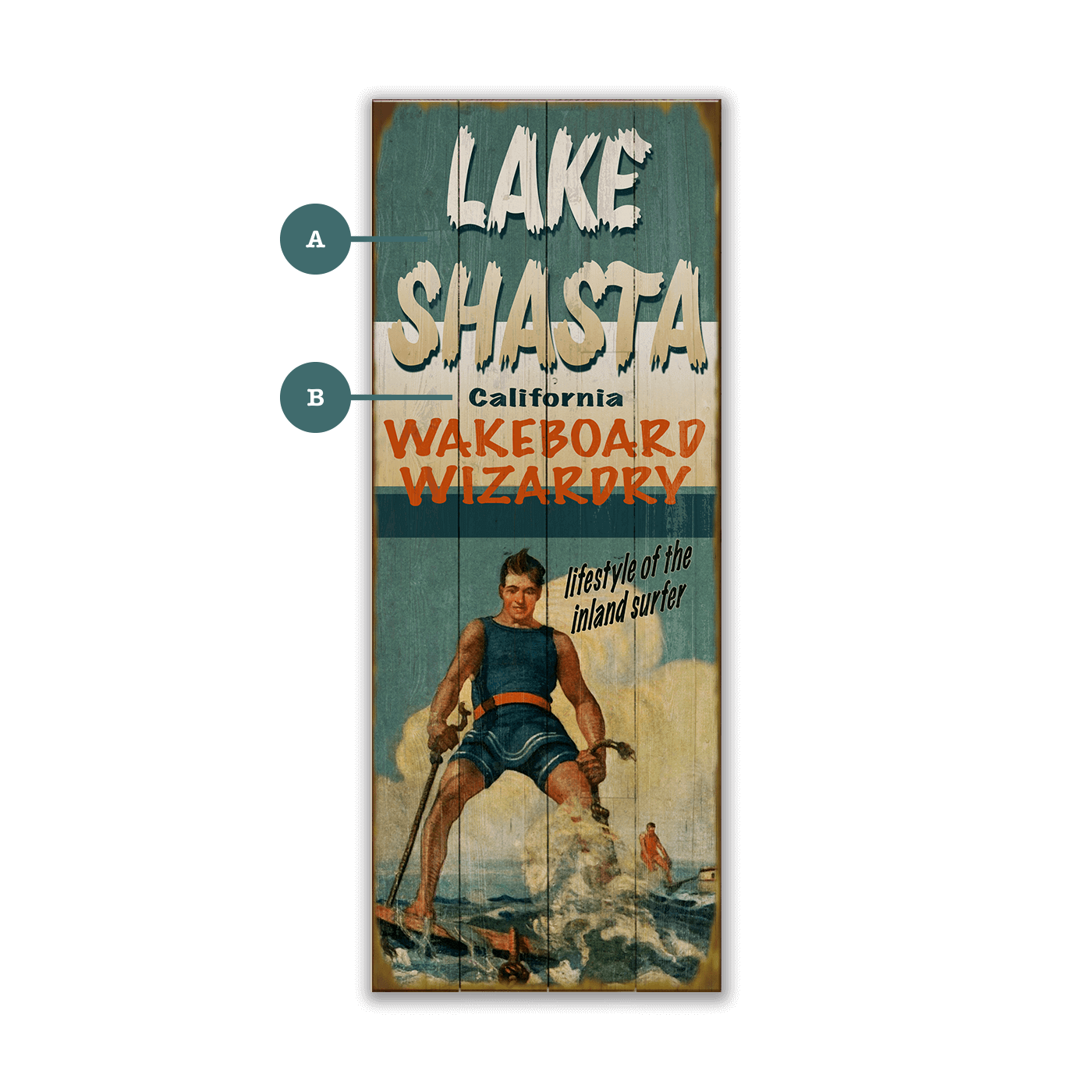 Experience the magic of water sports with this dynamic vintage-style wakeboard artwork. Showcasing an expert wakeboarder in action, this piece captures the skill and excitement of inland surfing. The rustic, weathered look of the background paired with vibrant, action-packed imagery makes this a compelling piece for any enthusiast of water sports or collector of retro-inspired decor.