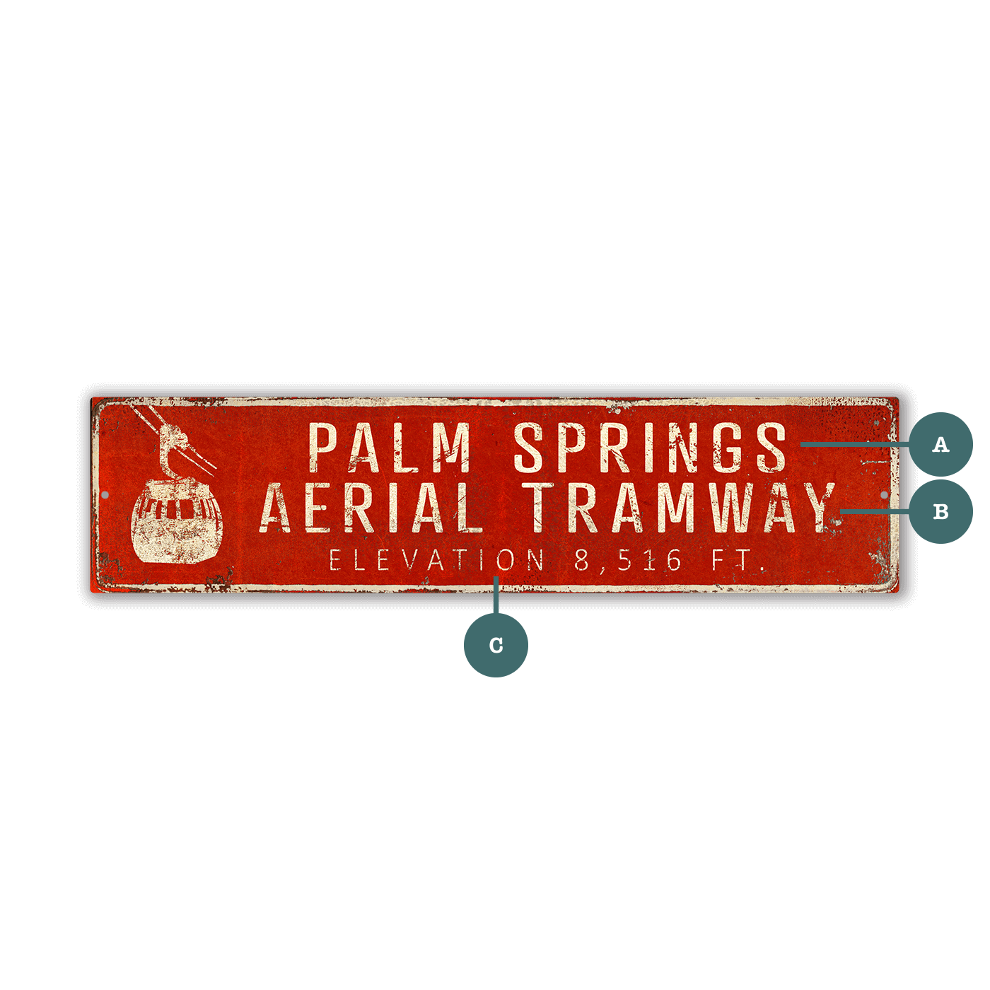 This landmark sign is inspired by the iconic Palm Springs Aerial Tramway, featuring a bold, vintage-style design and a classic tramway icon. The clean layout and weathered look evoke the character of historic travel and destination signage. The text lines can be customized, making this piece ideal for commemorating a favorite place, elevation, date, or personal message. Perfect for desert homes, travel-themed spaces, or collectors of iconic American landmarks, this sign celebrates one of Palm Springs’ most recognizable attractions with timeless style.