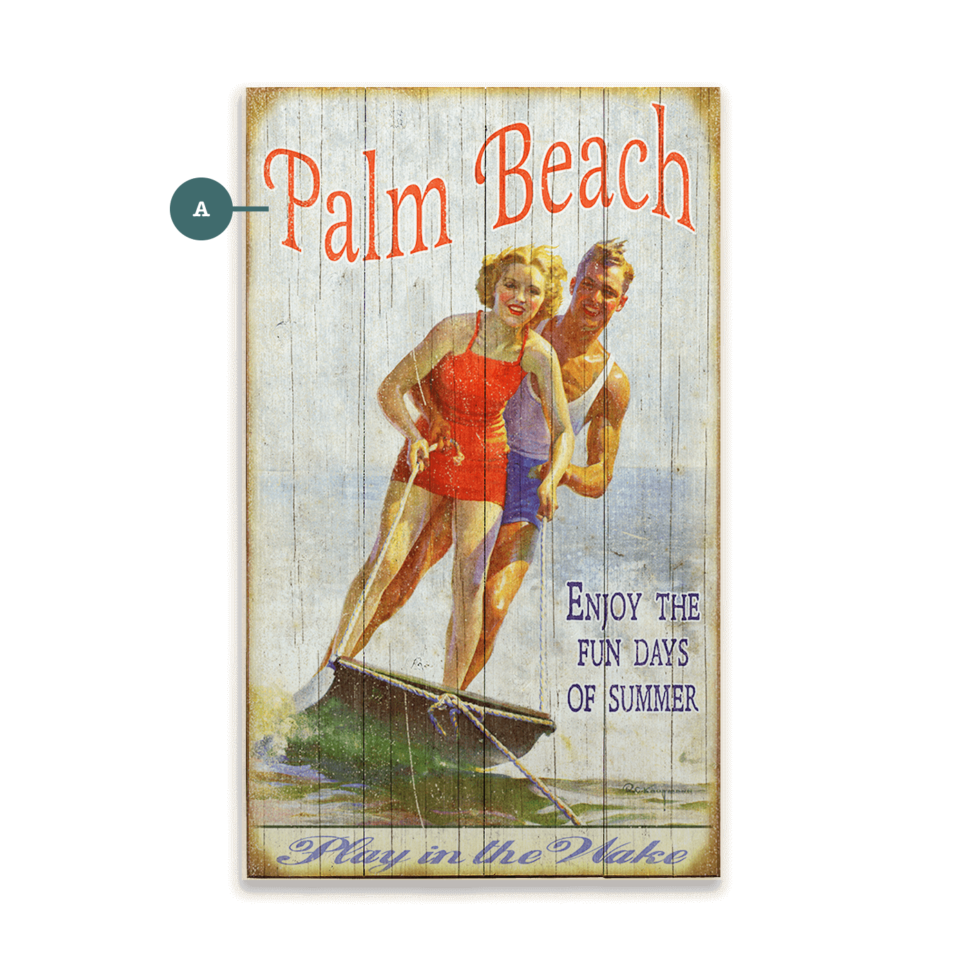 - Wood Signs: Wood signs are made from engineered wood (locally-sourced plywood). This piece features a charming wood-plank style and comes affixed with a picture hanger on the back. Wood signs are recommended for indoor use.