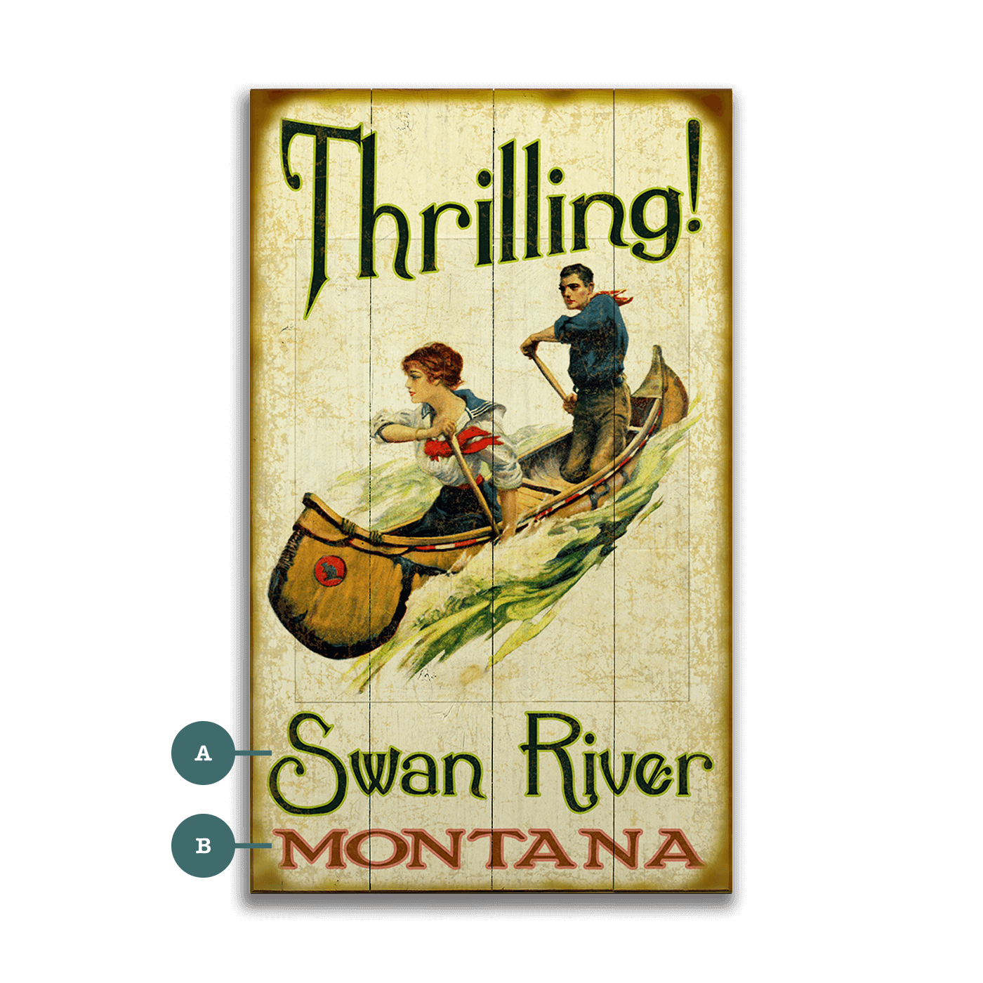 Experience the excitement of this vintage-style artwork capturing a thrilling canoe ride through wild waters. Featuring dynamic action and vivid colors, this piece evokes the adventurous spirit of the great outdoors. Perfect for adding a touch of retro charm and energy to any space, this artwork is ideal for adventure enthusiasts and lovers of vintage decor.