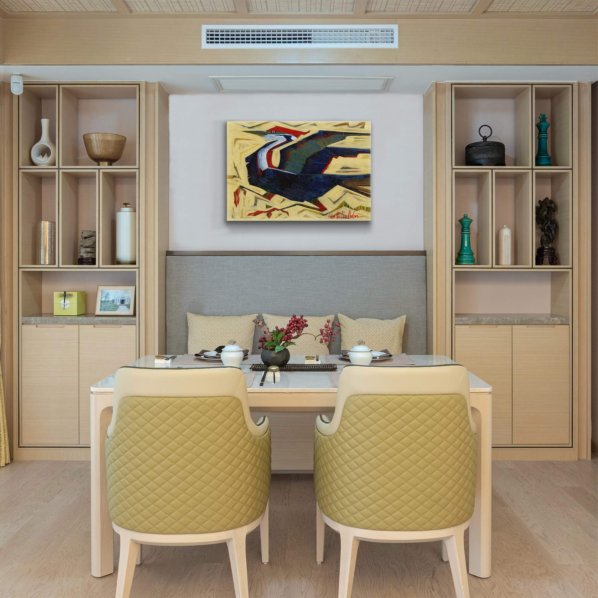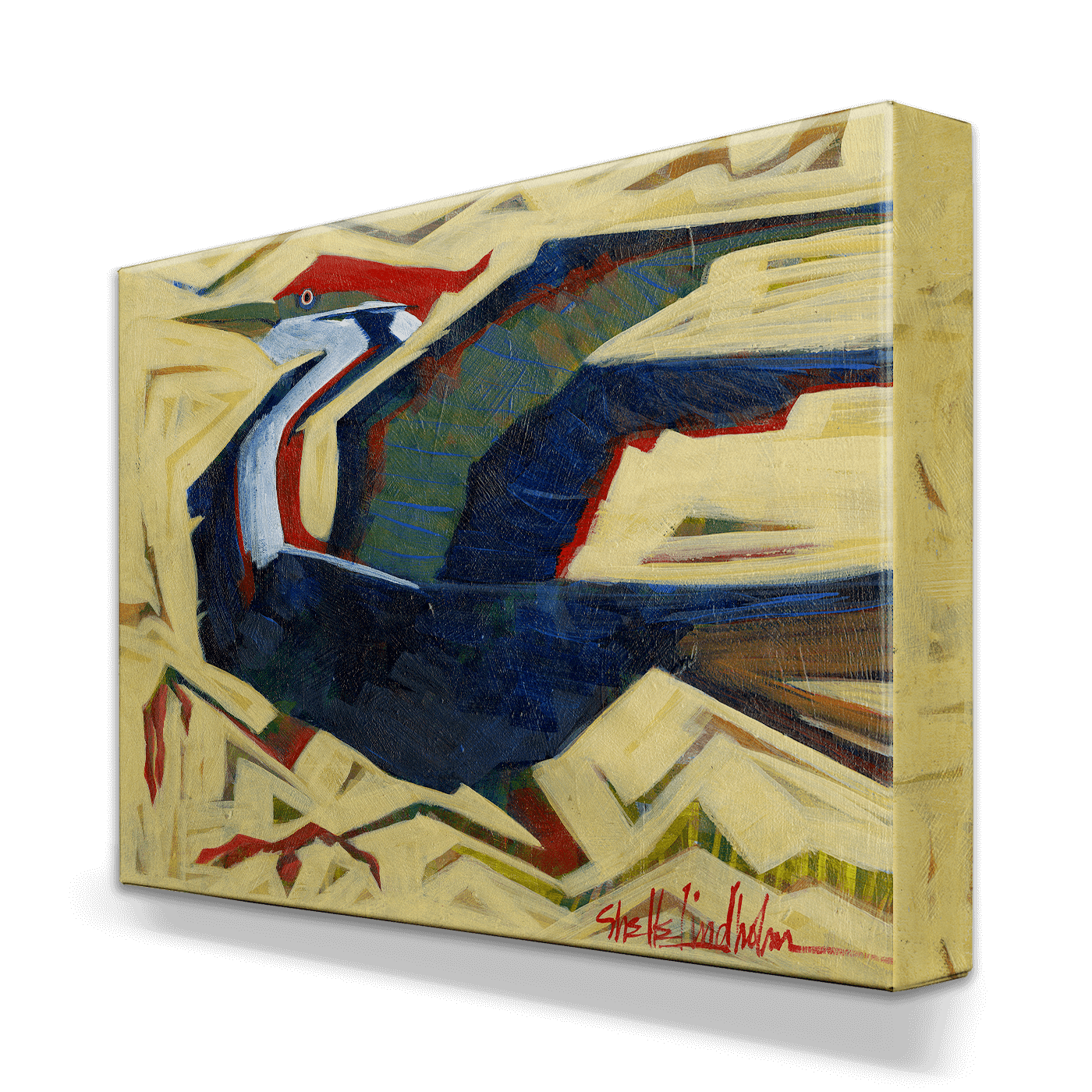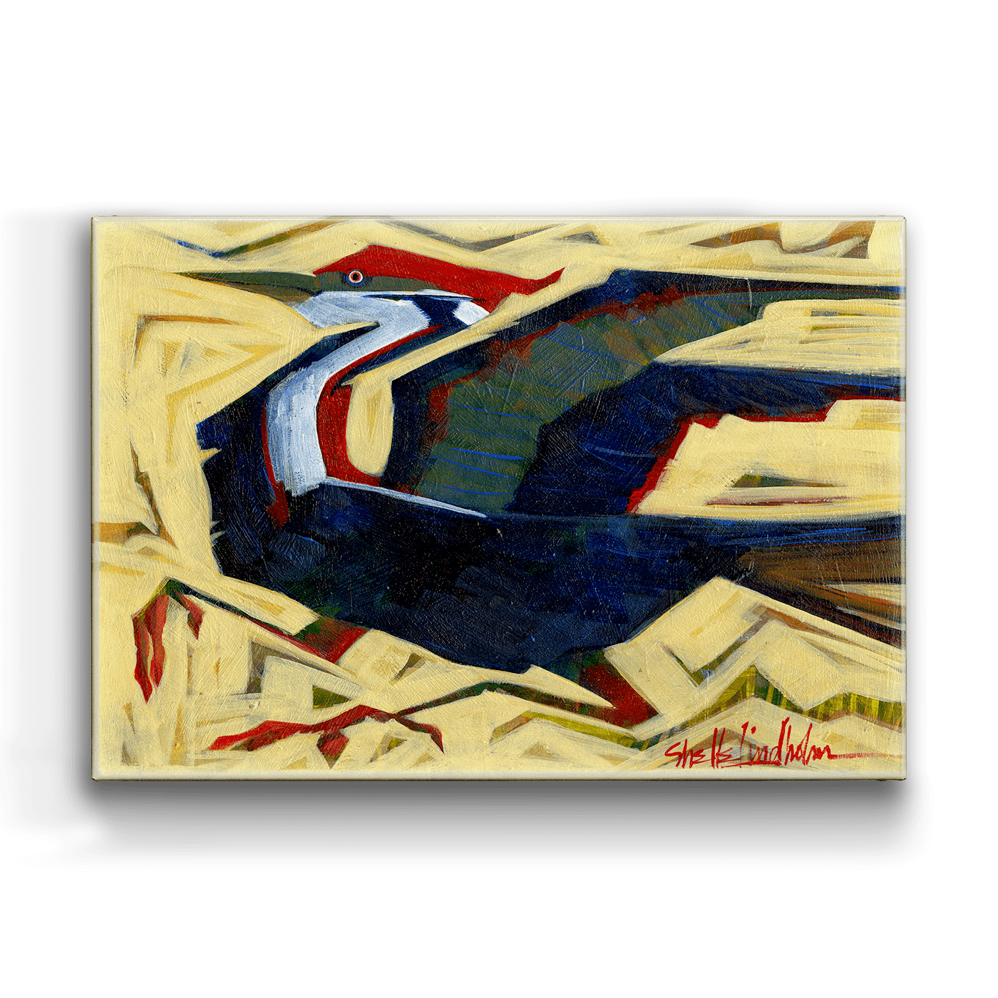 This striking artwork features a dynamic portrayal of a pileated woodpecker, its bold black and white plumage accented by a vibrant red crest. The interplay of sharp lines and vivid colors captures the energy and essence of this iconic bird. Perfect for nature enthusiasts and art lovers, this piece combines modern abstraction with the natural beauty of wildlife, making it a bold and captivating centerpiece.
