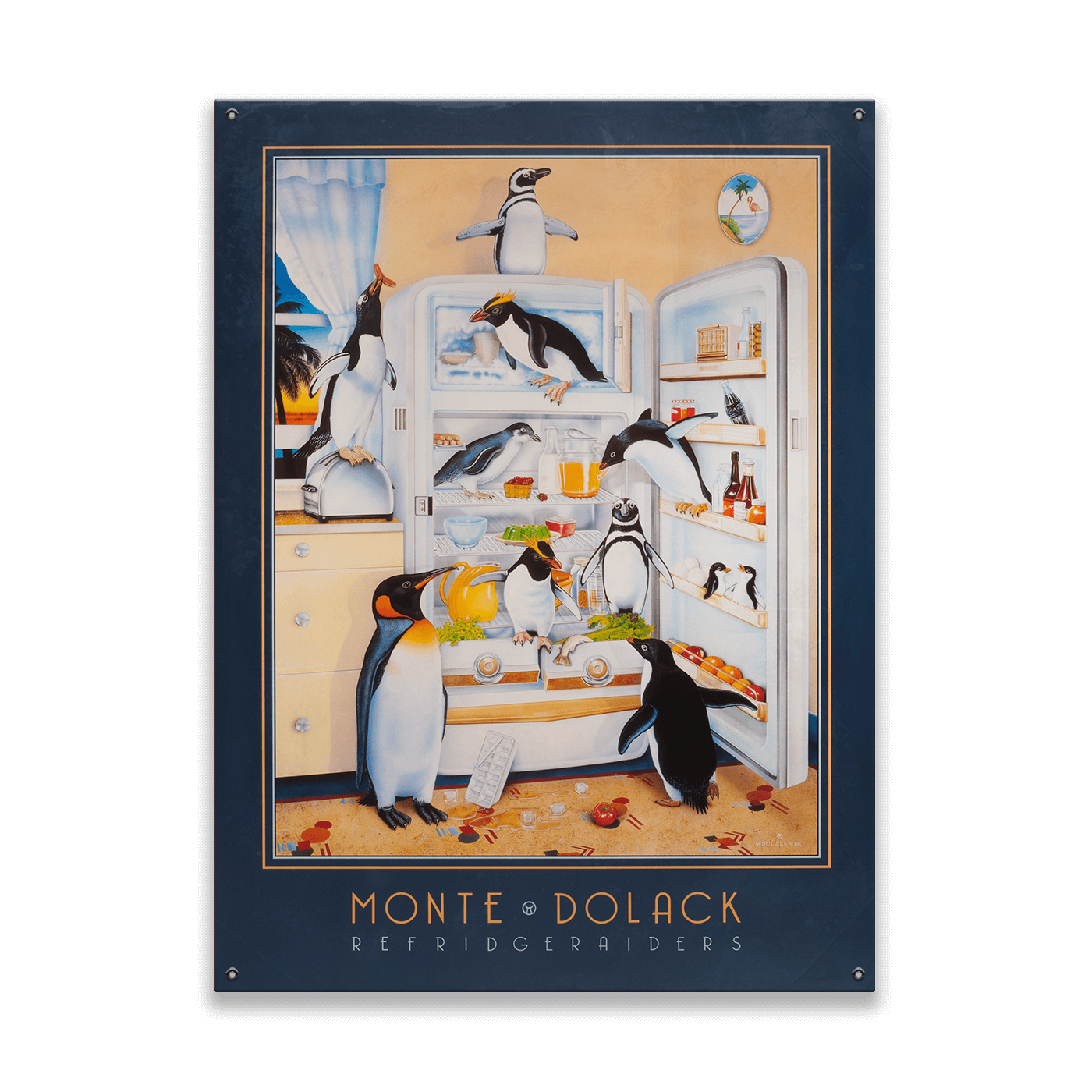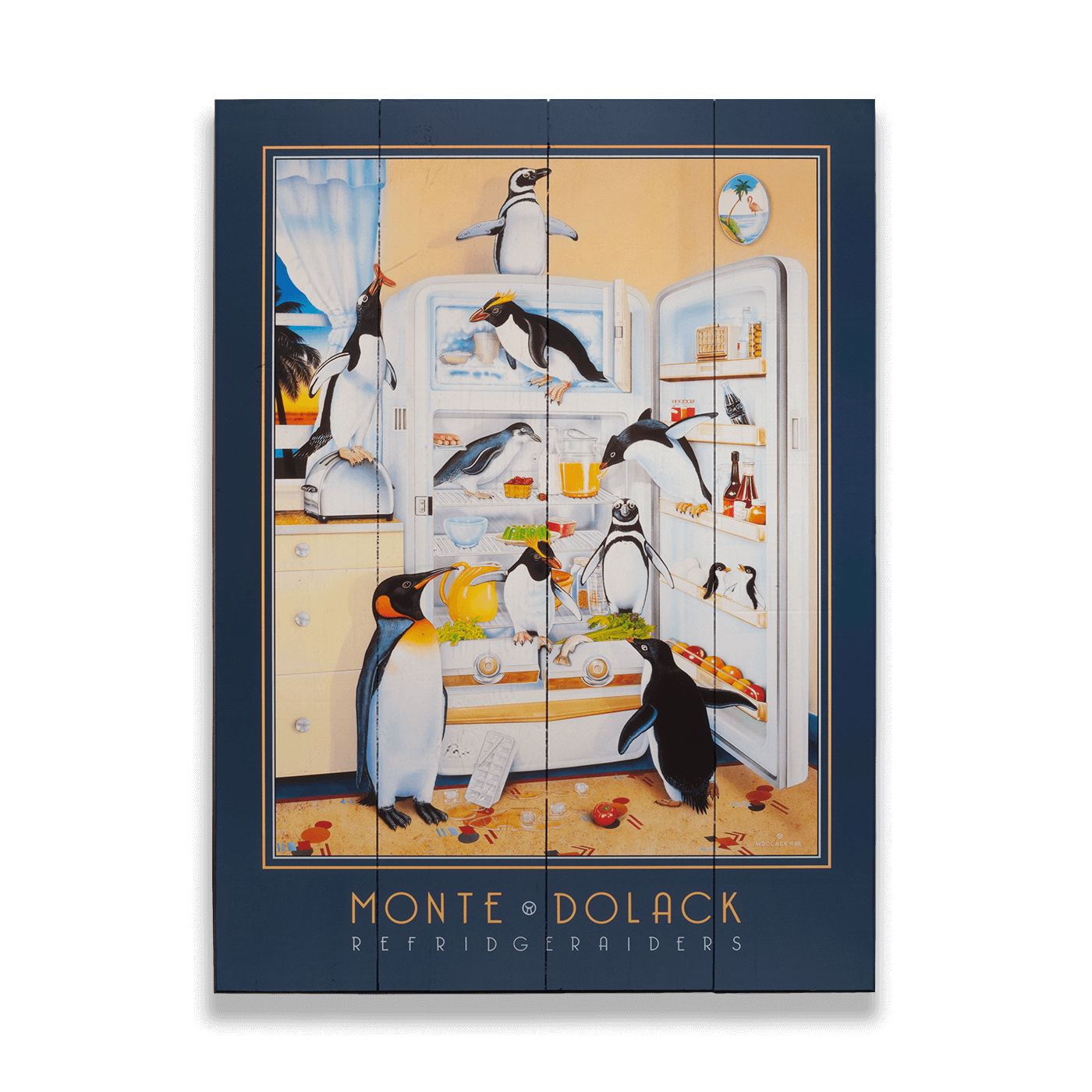 Bring a playful touch of whimsy to your space with this delightful artwork featuring a group of mischievous penguins raiding a refrigerator. Each penguin is animatedly engaged, whether diving from the shelf, inspecting the freezer, or devouring food items, creating a humorous and lively scene. The charming details—like scattered leftovers and vibrant kitchen accents—add a layer of lighthearted chaos to the piece. Perfect for animal lovers and fans of imaginative art, this piece combines humor and creativity to spark joy and curiosity in any setting.