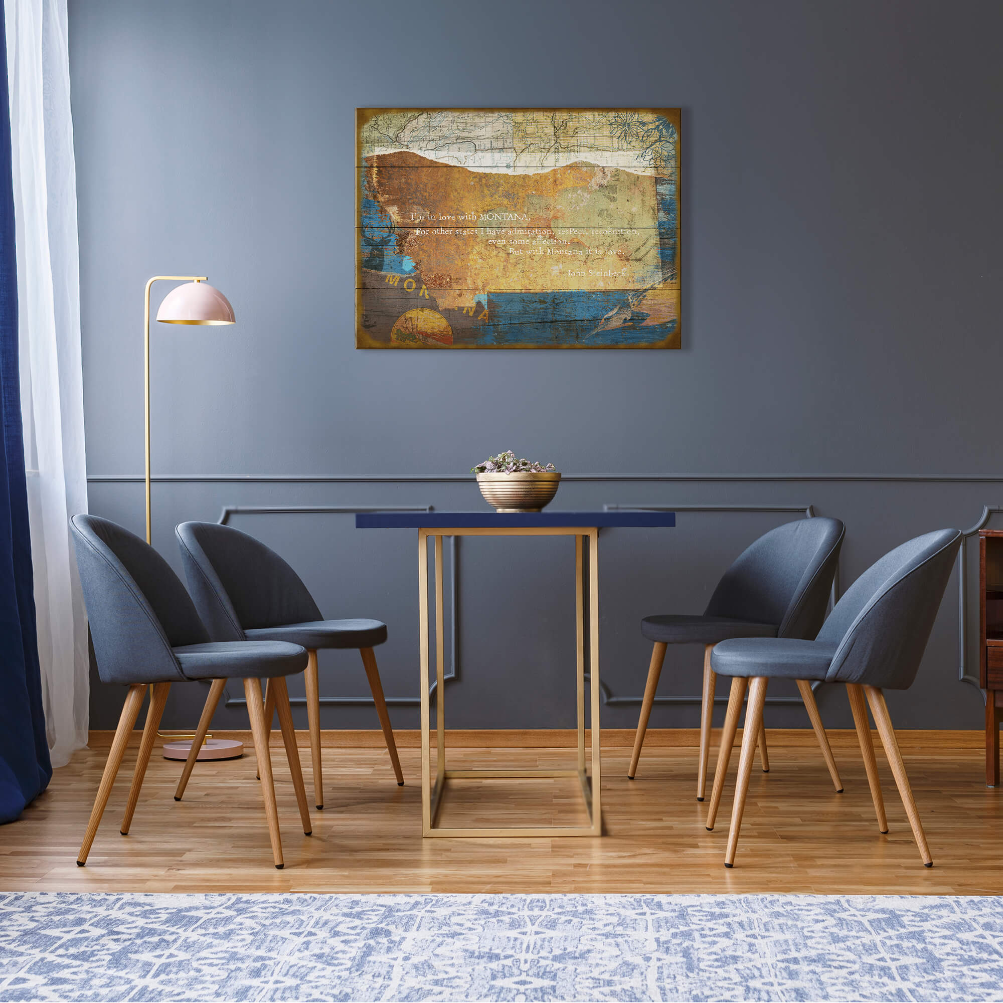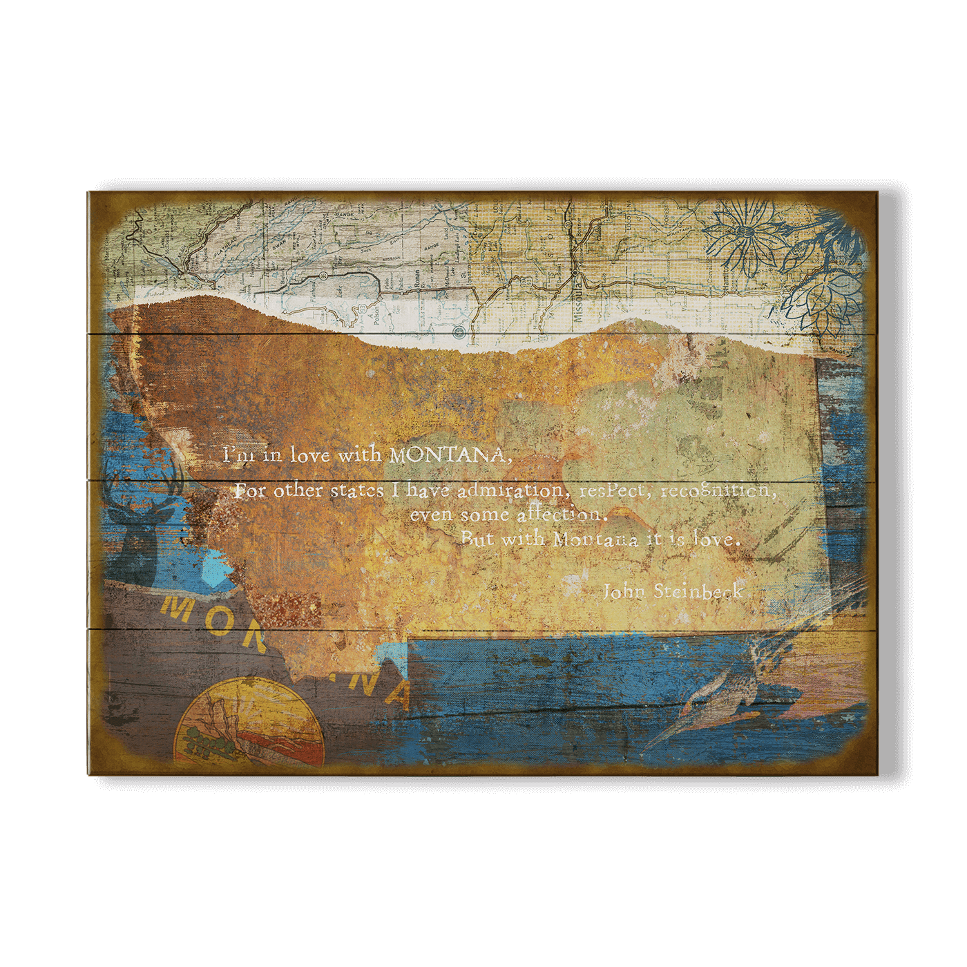 Set against a backdrop of rustic textures and layered Montana details, this artwork features a heartfelt quote from John Steinbeck. Faded map elements, distressed overlays, and earthy hues lend the piece a weathered, nostalgic character, evoking the rugged landscapes and quiet grandeur of Big Sky Country. From Glacier's alpine beauty to the open prairie skies, this piece celebrates Montana as more than just a place—it’s a feeling. A compelling choice for anyone who’s ever fallen in love with the West.