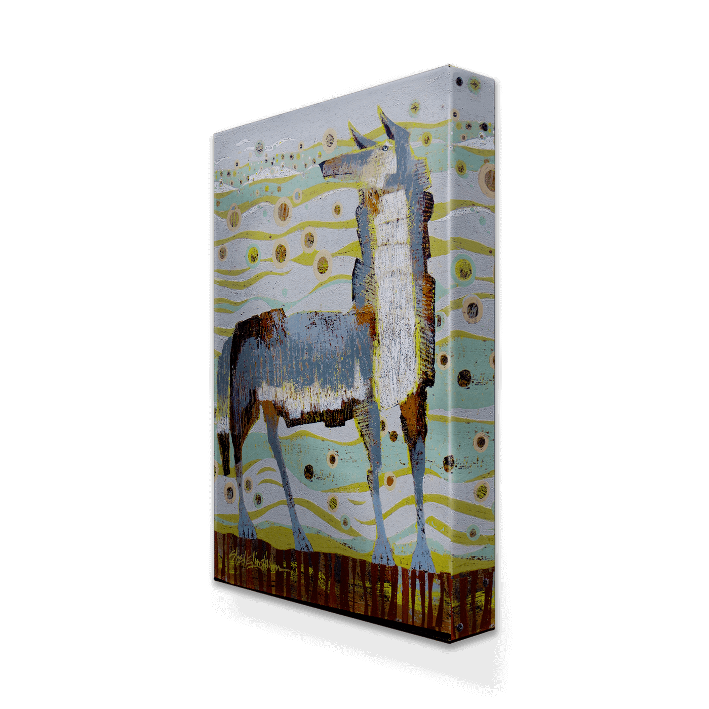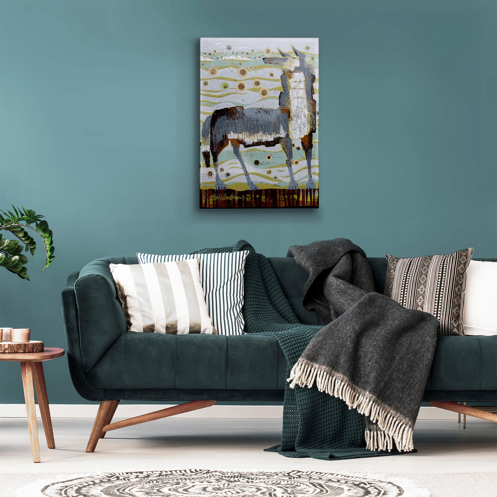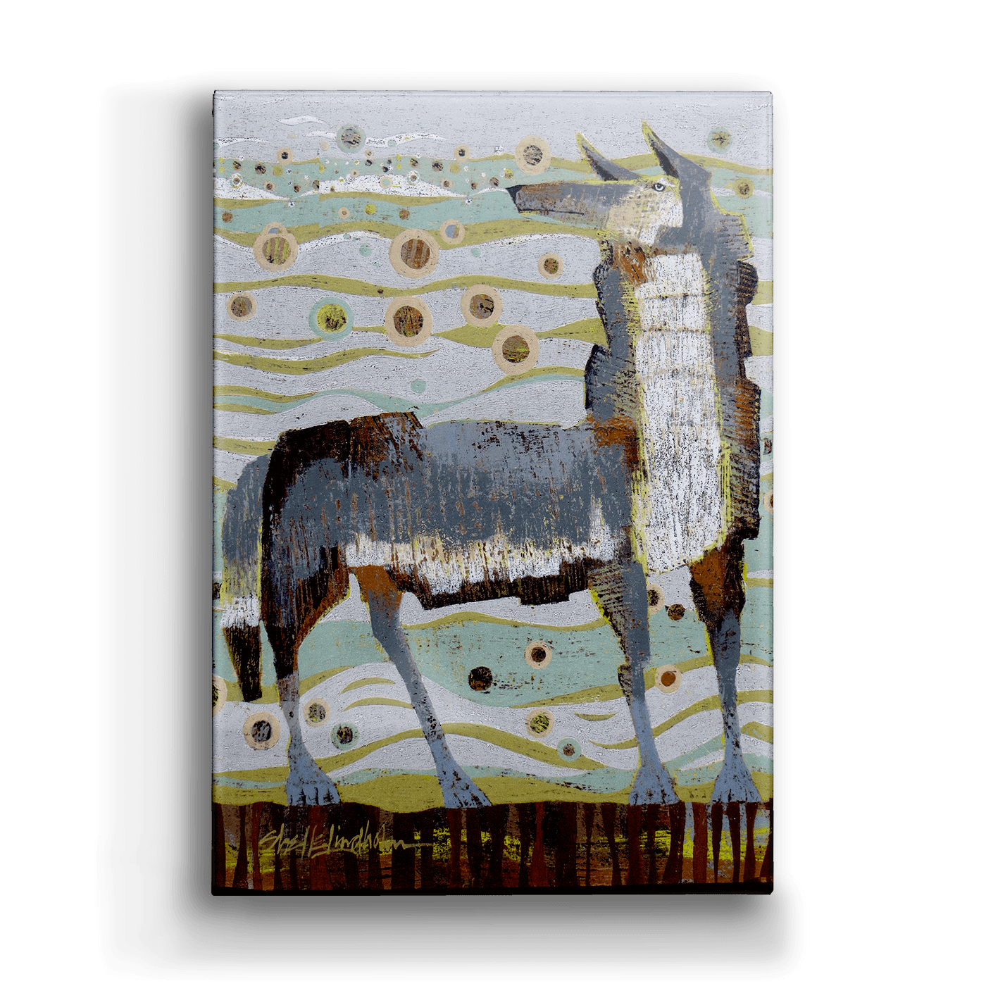 This evocative artwork features a stylized depiction of a solitary wolf, standing tall amidst a serene and dreamlike landscape. The muted palette of earthy grays, browns, and soft greens is punctuated by flowing patterns and circular accents, evoking a sense of sentimentality and harmony with nature. Perfect for those who appreciate the mystique of wildlife and contemporary art, this piece invites contemplation and adds a sophisticated, natural touch to any space.