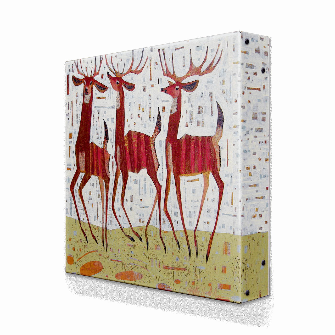 Discover the enchanting charm of this unique artwork featuring a trio of stags set against a backdrop of abstract, geometric patterns. Rendered in rich, earthy tones, the deer stand regally, their impressive antlers and poised stature capturing the essence of the wilderness. This piece skillfully blends traditional wildlife motifs with modern artistic elements, making it a striking choice for any art lover looking to add a touch of nature-inspired sophistication to their home or office decor.