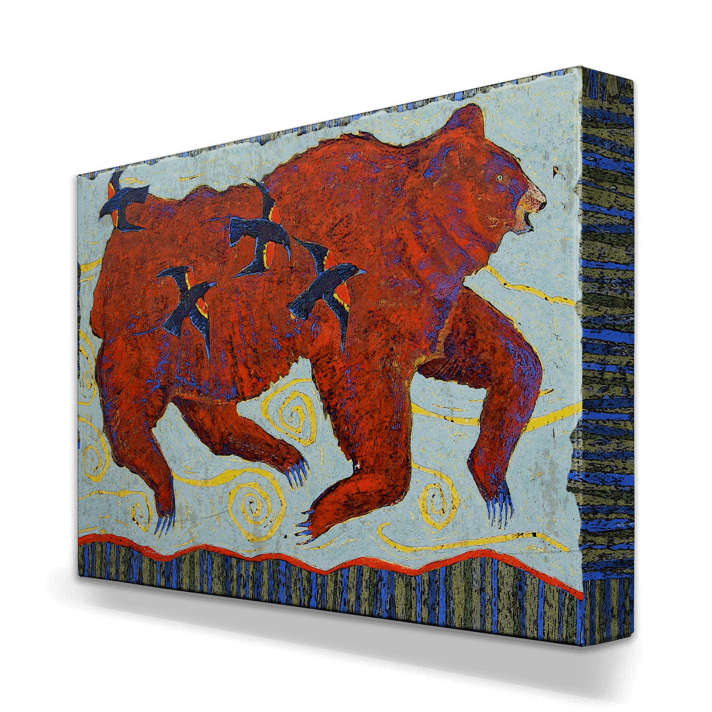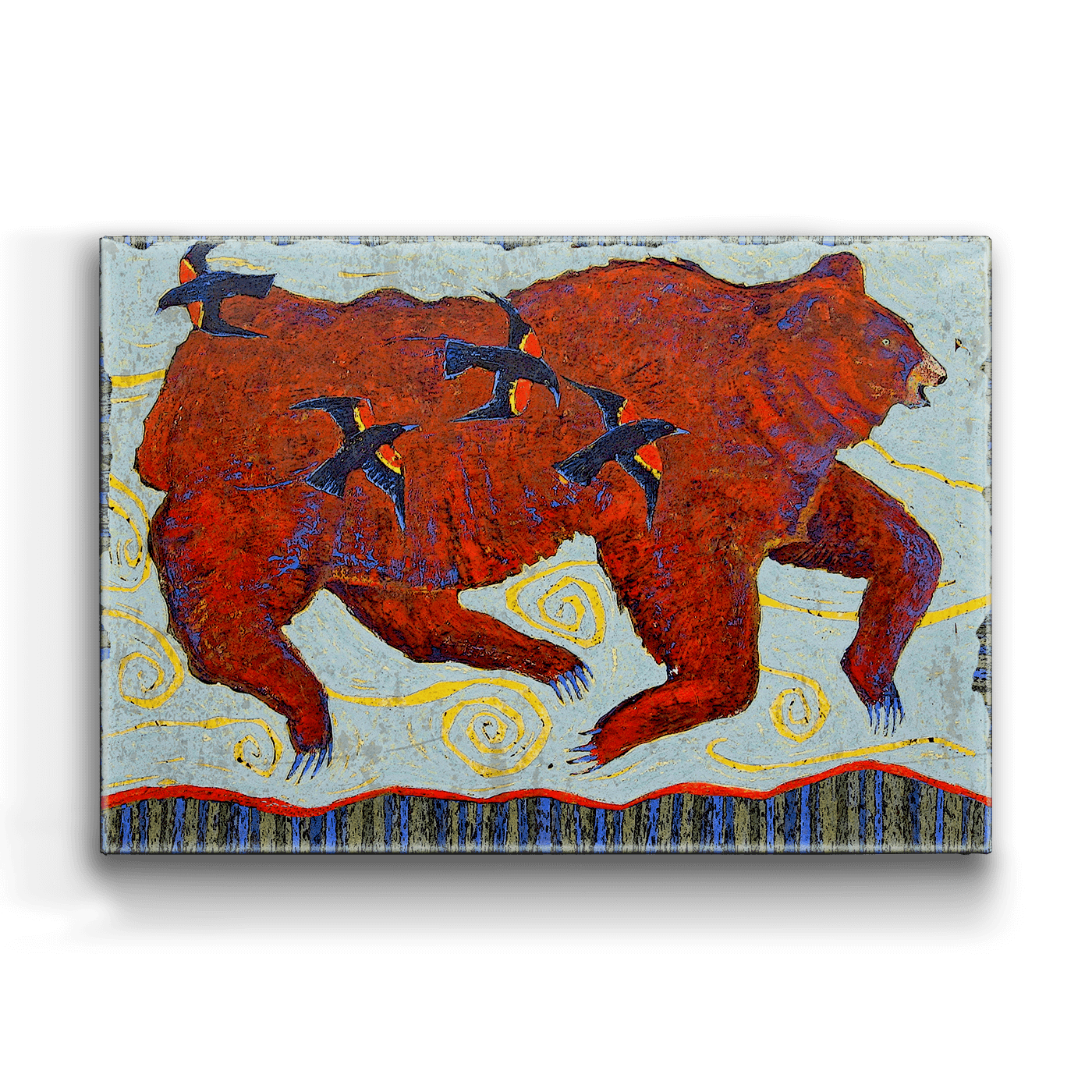 This dynamic artwork depicts a powerful bear in motion, accompanied by playful, soaring red-winged blackbirds. The rich, orange tones of the bear contrast beautifully with the muted blue background, accented by swirls of yellow, creating a sense of energy and the untamed spirit of the wild. Perfect for adding a statement of vitality and artistry to any space, this piece captures the essence of the wilderness in a contemporary style.