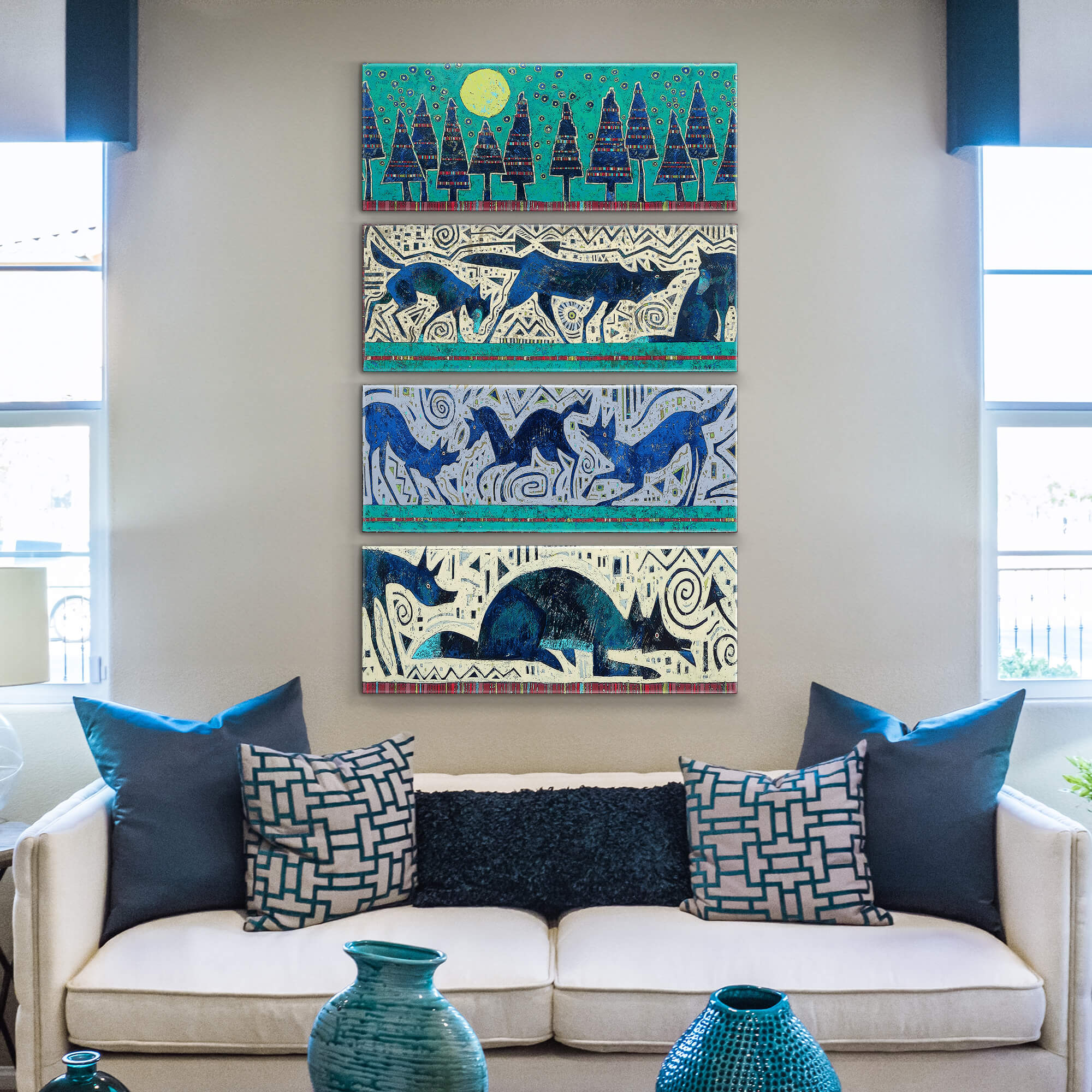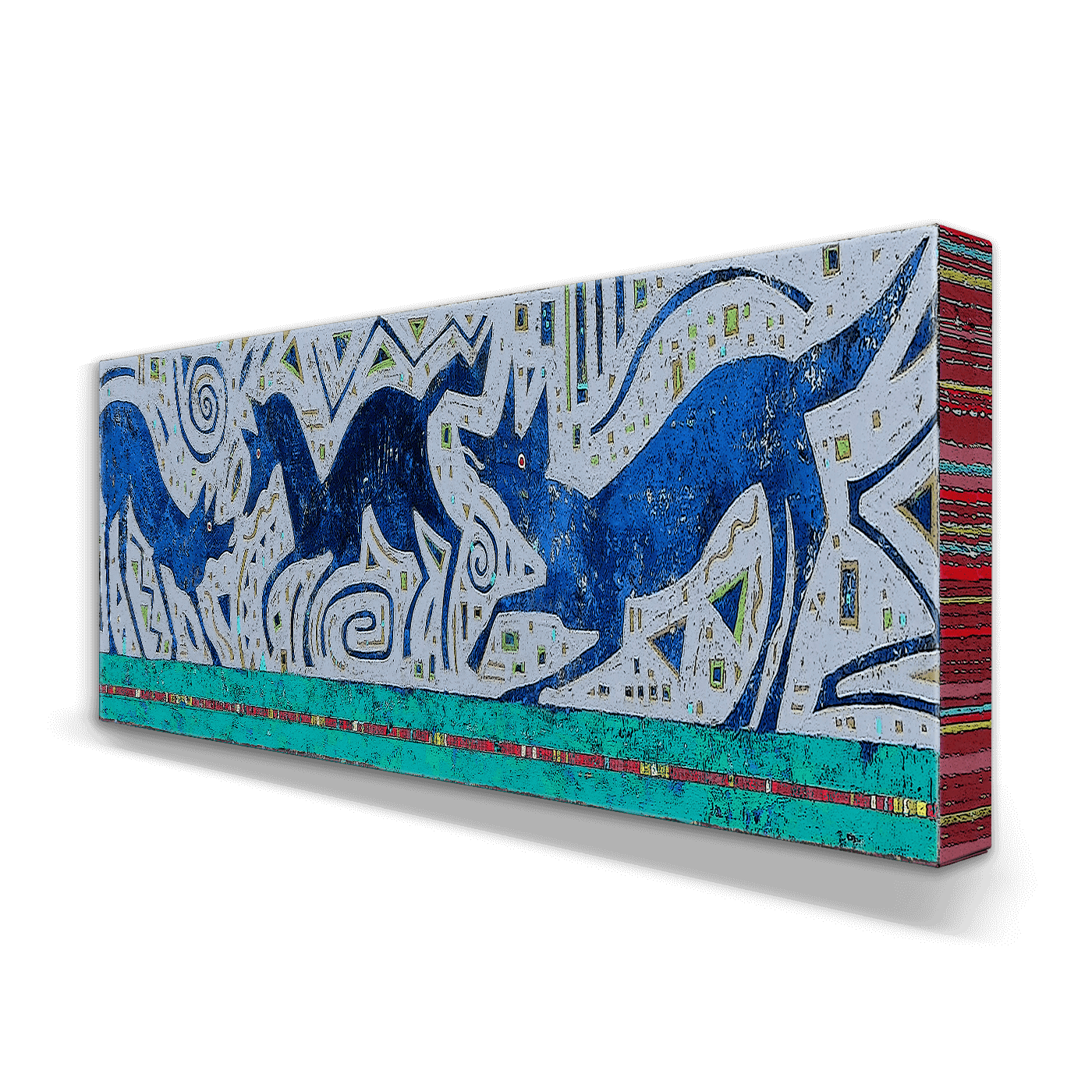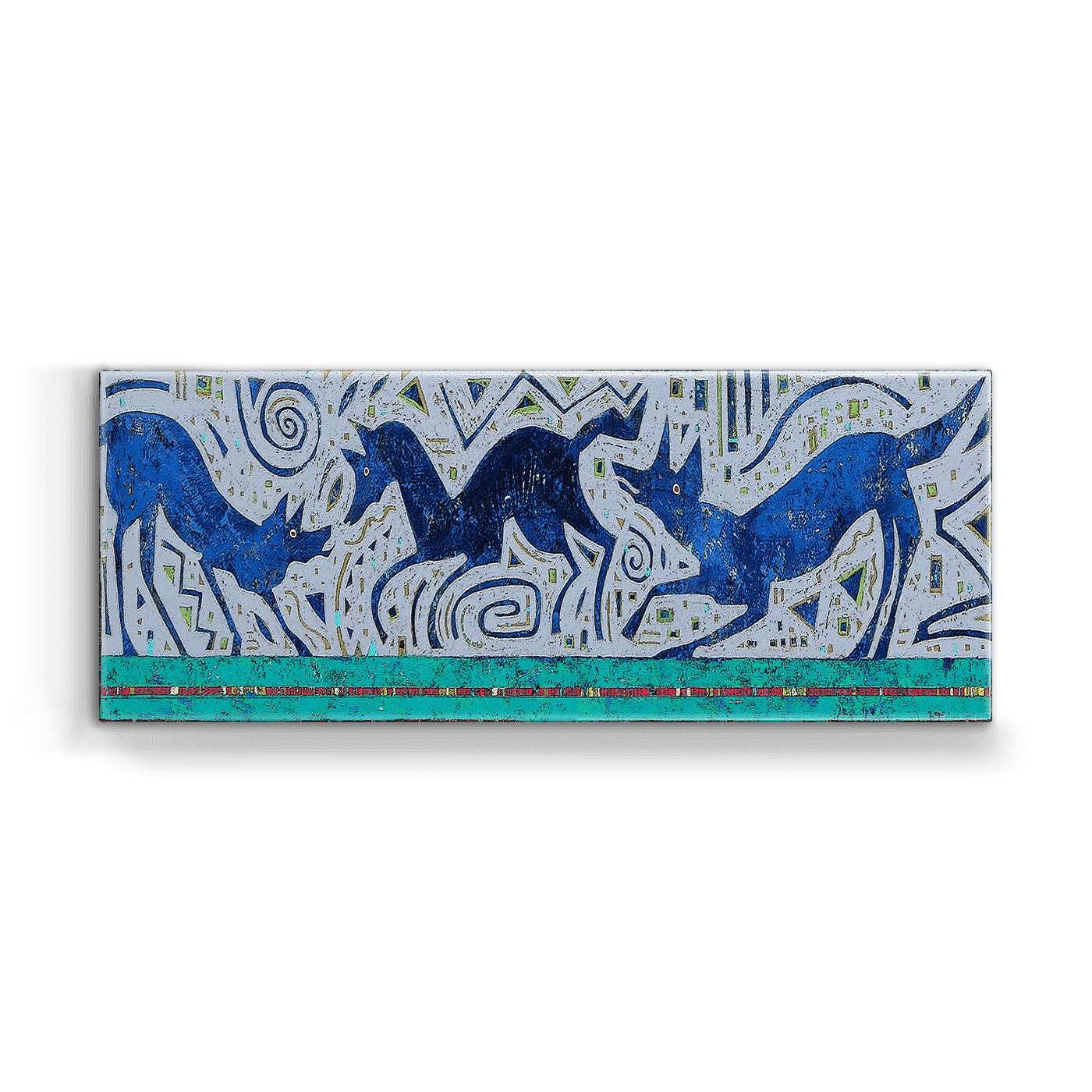 This intricate and vibrant artwork features a layered narrative of wolves in motion, with fluid, dynamic forms and a backdrop of geometric patterns. The cool blues and teal contrast beautifully with the lighter neutral background and the subtle pop of the striped red border, creating a harmonious yet bold depiction of the wolves. Evoking themes of wilderness and movement, this piece combines storytelling with modern artistry, making it a captivating addition to any space.