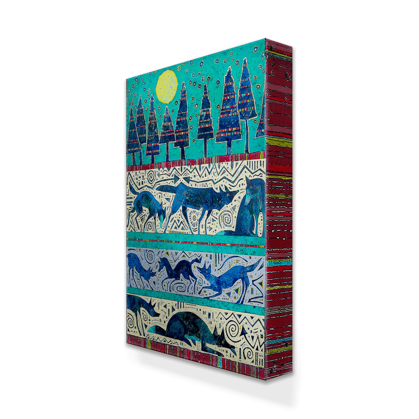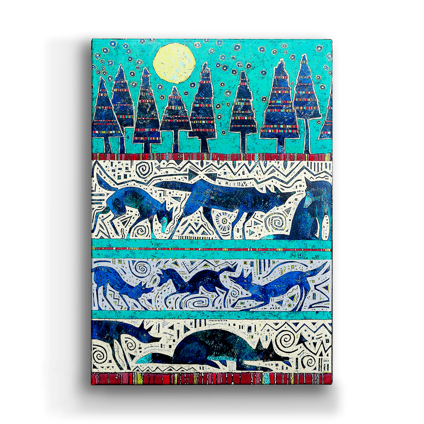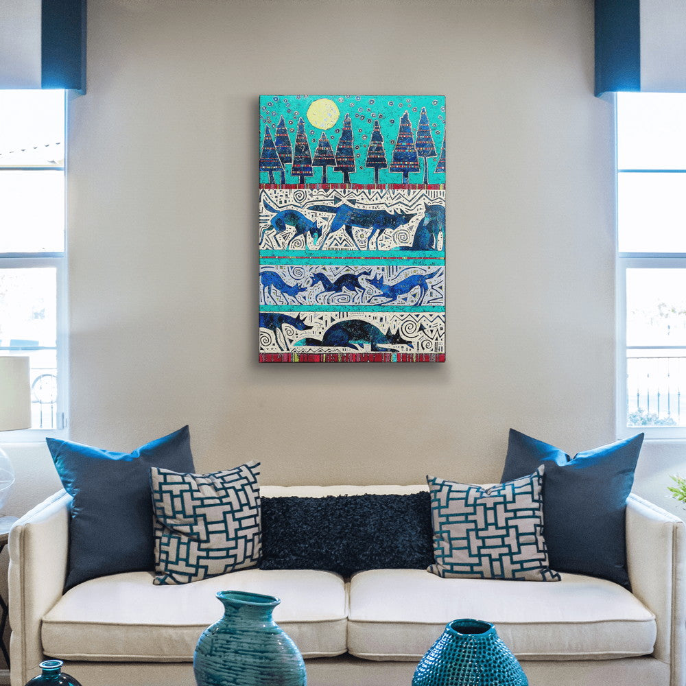 This intricate and vibrant artwork features a layered narrative of wolves in motion, with a striking header of stylized trees and a glowing full moon. The cool blues and teals of each band contrast beautifully with the lighter neutral backgrounds and pops of the striped red borders, creating a harmonious yet bold depiction of the wolves in various scenes. Evoking themes of wilderness and movement, this piece combines storytelling with modern artistry, making it a captivating addition to any space.