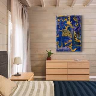 "Claracelle" stands out as a bold and immersive work by the artist Esté MacLeod. This piece, a dazzling box-art printed on a robust sheet of aluminum, captures the viewer's imagination with its deep blues and vibrant yellows. Esté's background in textile and ceramic design shines through in the abstract, rhythmic patterns that dance across the surface, evoking a sense of movement and depth. Ideal for art lovers who seek to adorn their spaces with pieces that spark conversation and curiosity, "Claracelle" is a testament to Esté MacLeod's mastery of layering color, shapes, and textures to create a captivating visual experience.