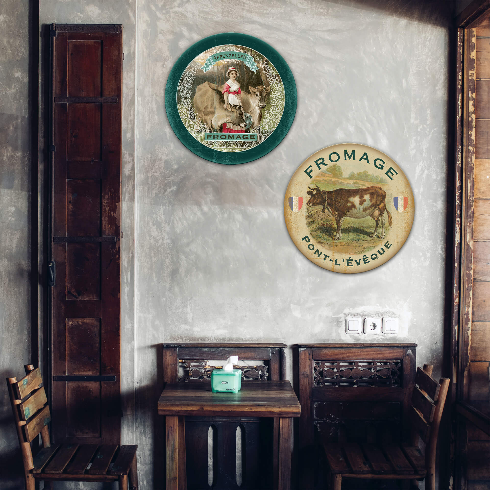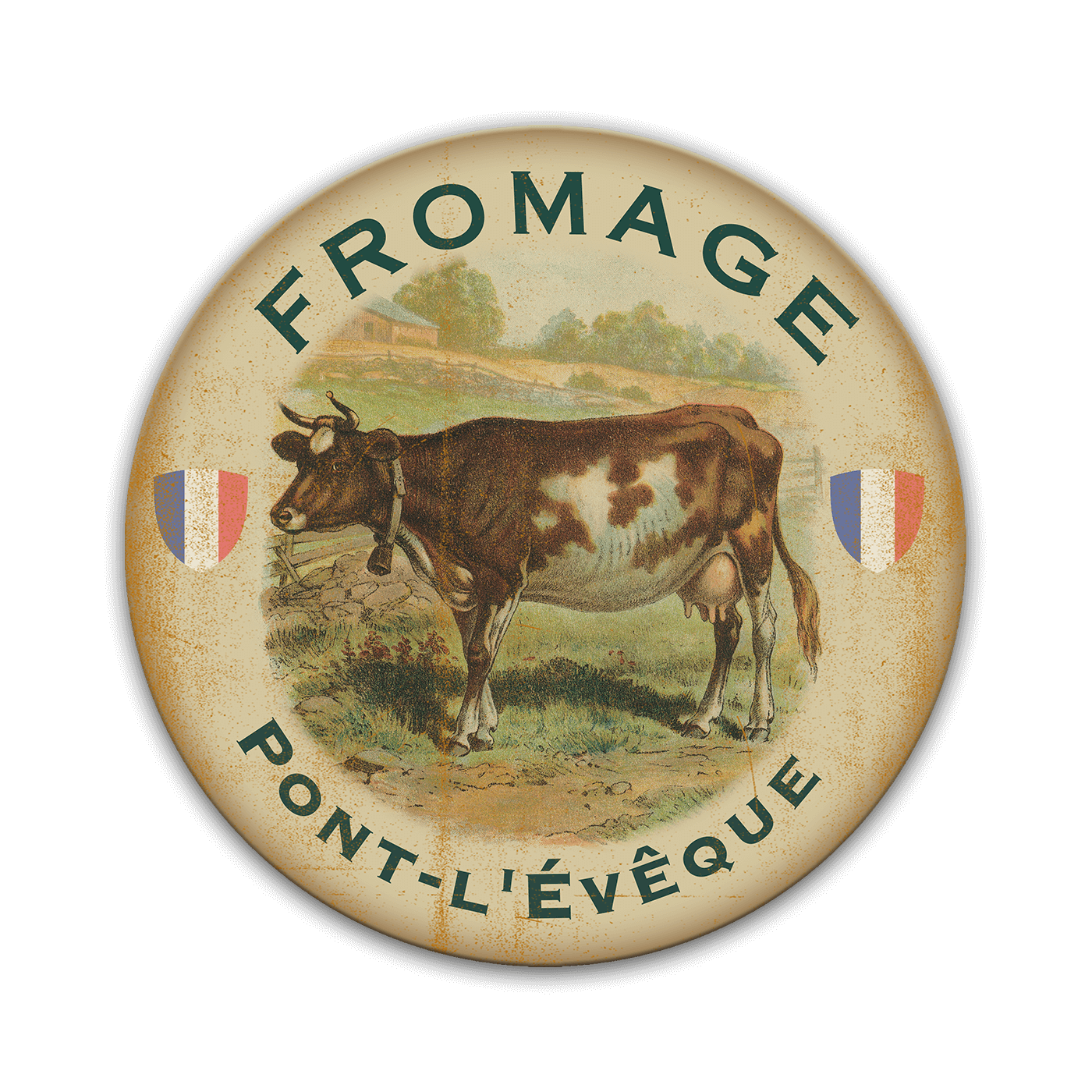 Rooted in the rich dairy traditions of Normandy, Pont-l'Évêque is one of France’s oldest cheeses, dating back to the 12th century. This cheese label artwork beautifully captures its pastoral origins, featuring a rustic countryside scene with a brown and white cow, and framed by French flags. Known for its creamy texture and pungent aroma, Pont-l'Évêque is a washed-rind cheese with a supple interior and a distinctive, earthy flavor with notes of butter and hazelnut. It pairs wonderfully with crusty bread, cider, and robust red wines. Ideal for cheese lovers, culinary enthusiasts, and those who appreciate European heritage, this piece brings the charm of French cheesemaking into any farmhouse kitchen, dining space, or specialty shop.