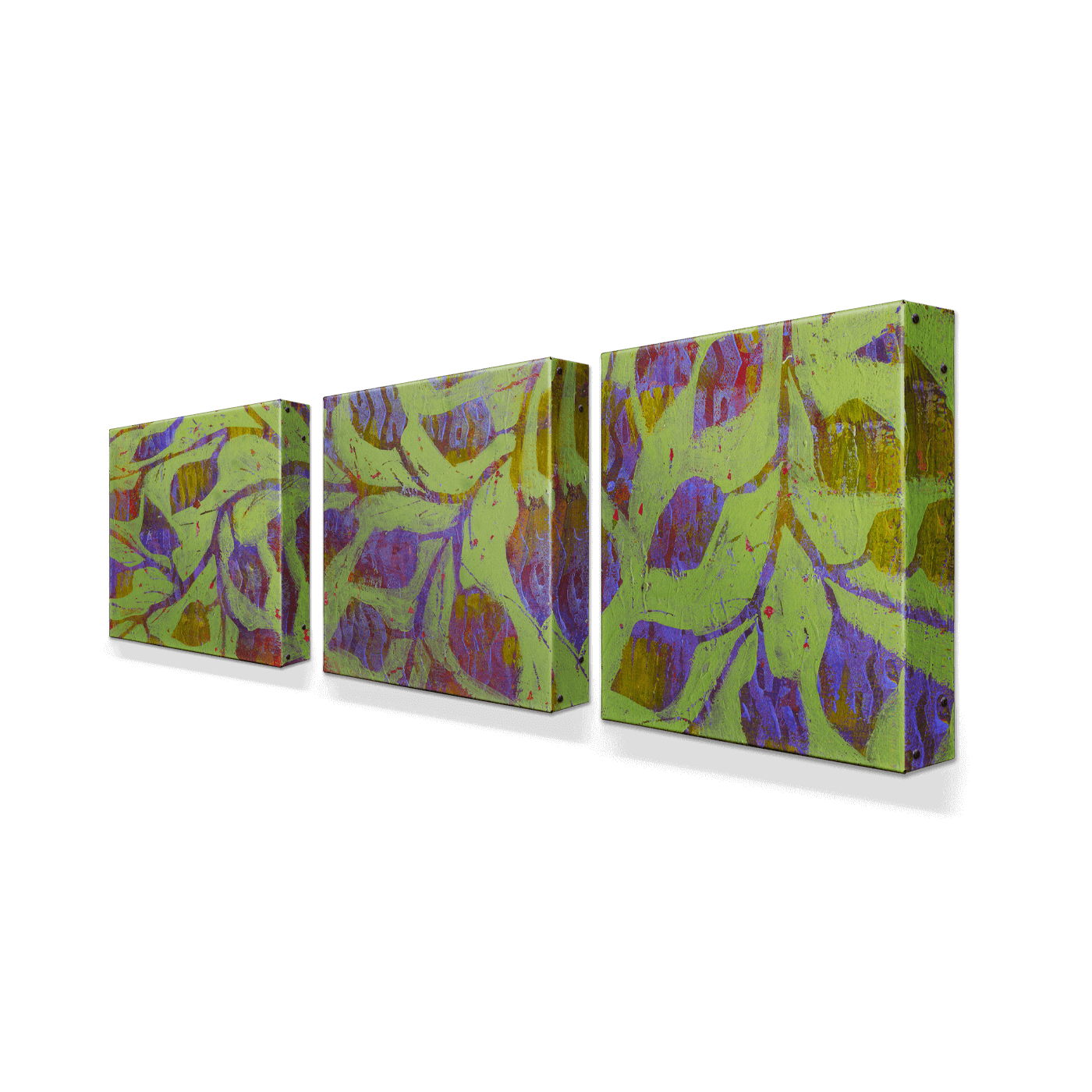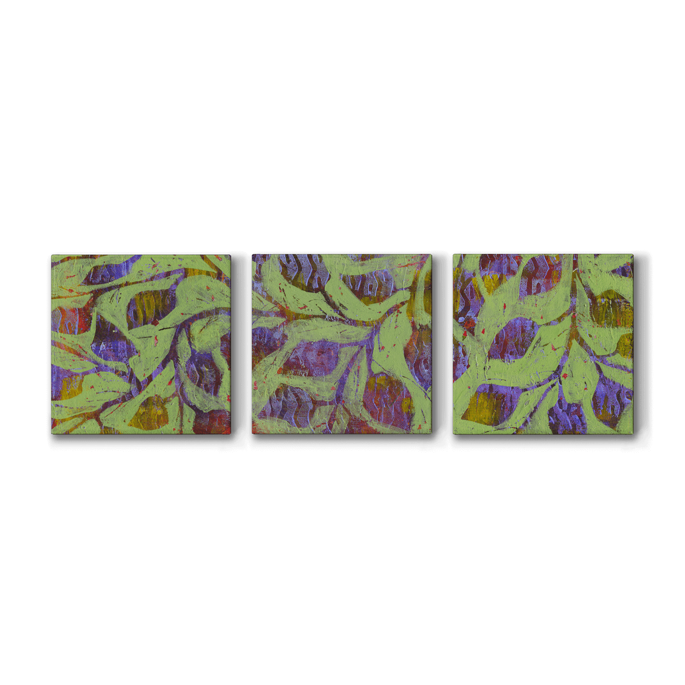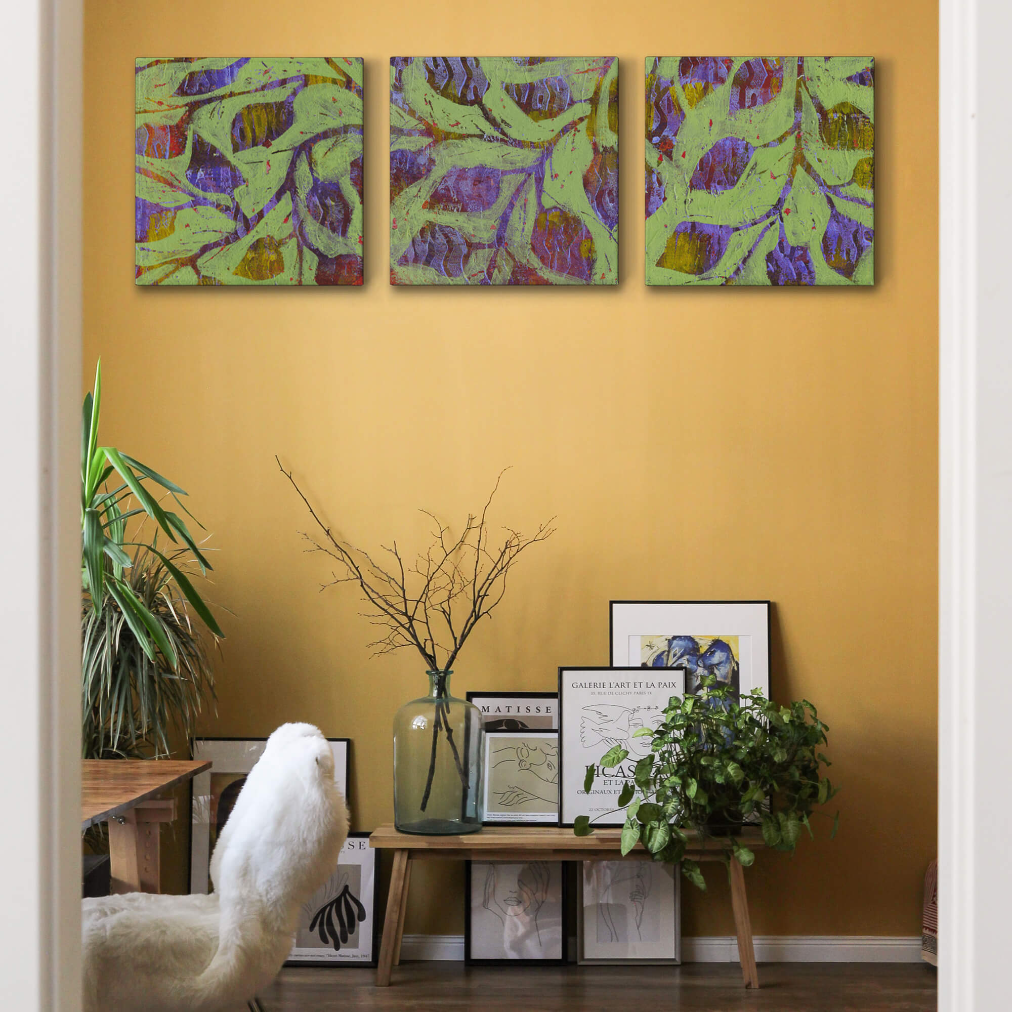 This box art trio showcases a mesmerizing interplay of deep lavender leaves on a background of rich green. The intricate layering and textured patterns create a sense of depth and vitality, evoking the serene beauty of nature in contemporary form. Perfect for adding a touch of sophistication and tranquility to any space, this piece brings a harmonious balance of color and design.