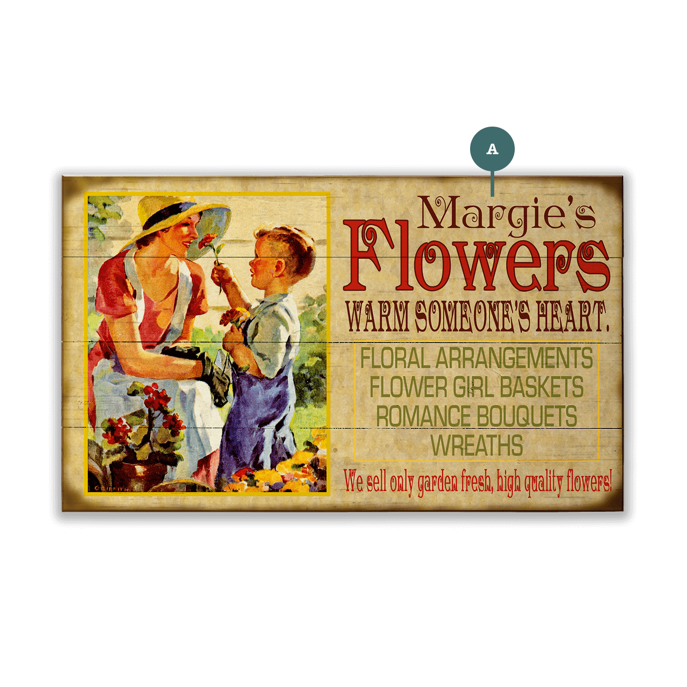 - Wood Signs: Wood signs are made from engineered wood (locally-sourced plywood). This piece features a charming wood-plank style and comes affixed with a picture hanger on the back. Wood signs are recommended for indoor use.