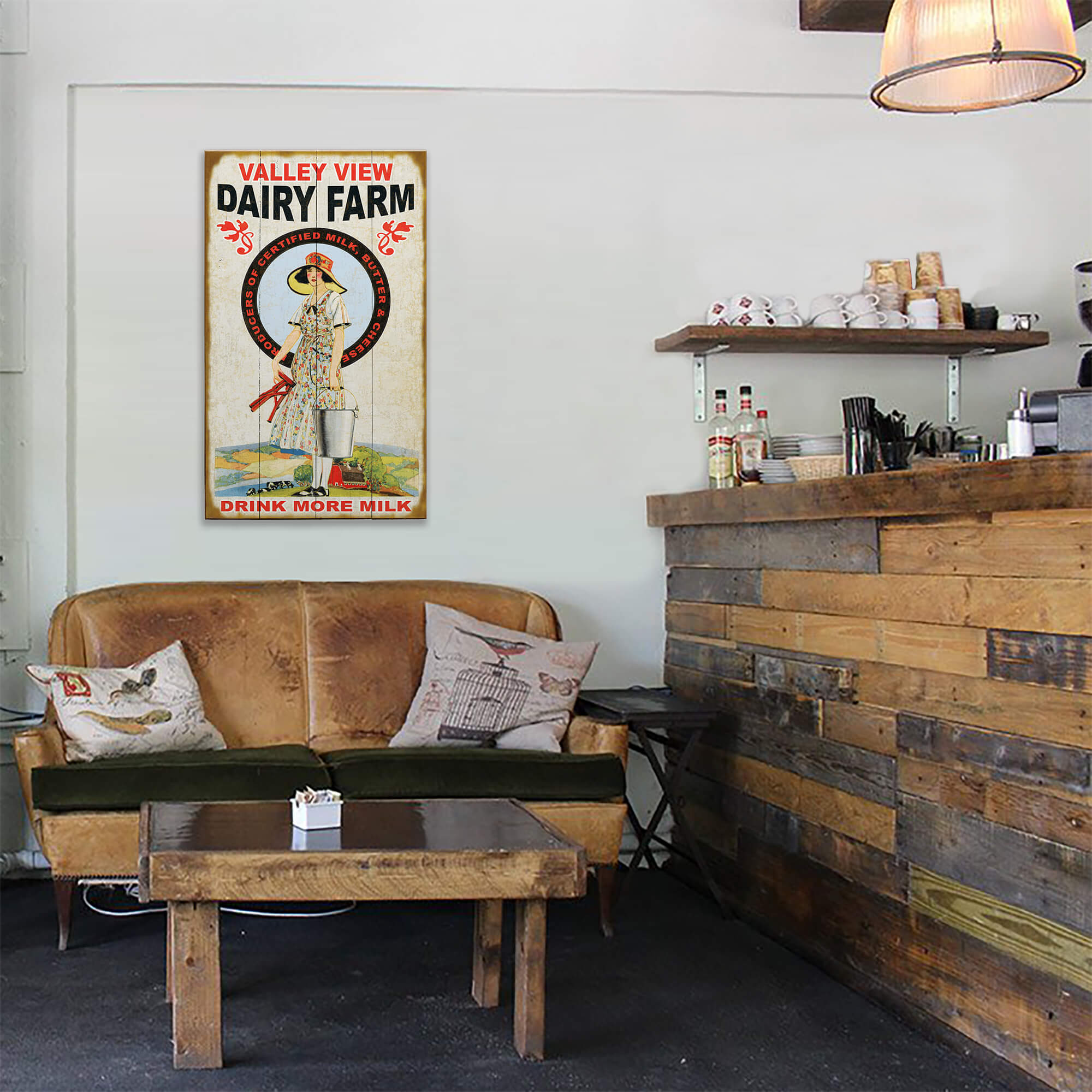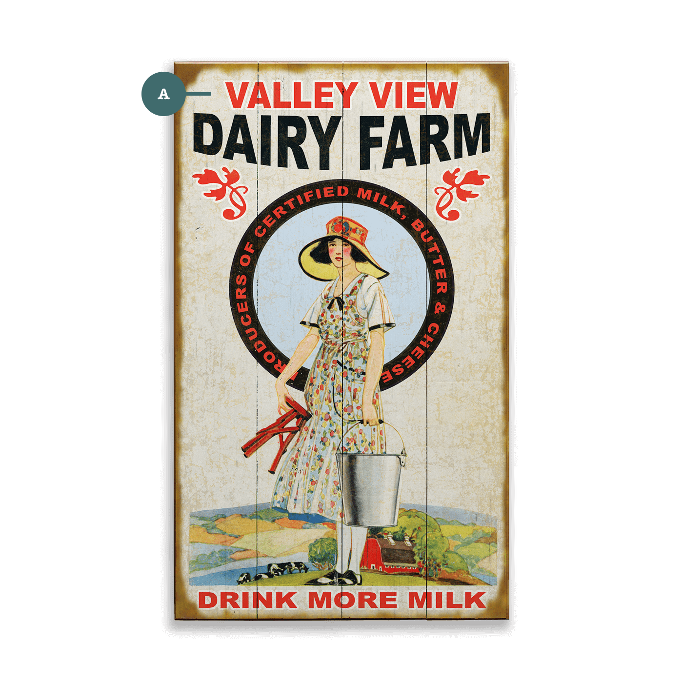 Brimming with vintage charm, this piece captures the idyllic beauty of country life with a classic dairy farm advertisement. The elegantly dressed farm girl, carrying a milk pail and milking stool, evokes a sense of wholesome tradition and pastoral simplicity. Soft, muted colors and a gently weathered finish enhance the nostalgic appeal, while bold typography and decorative flourishes give it the feel of an early 20th-century advertisement. Perfect for kitchens, farmhouses, or any space that celebrates the warmth and heritage of rural living.